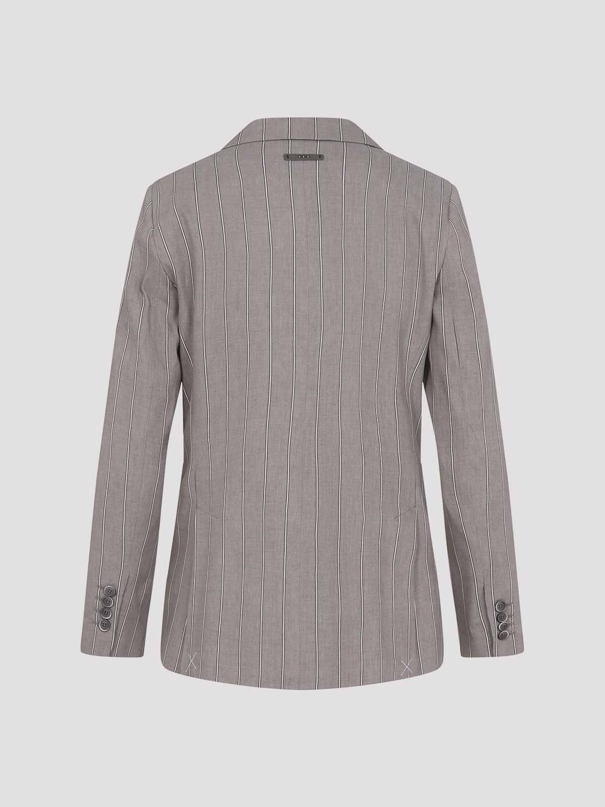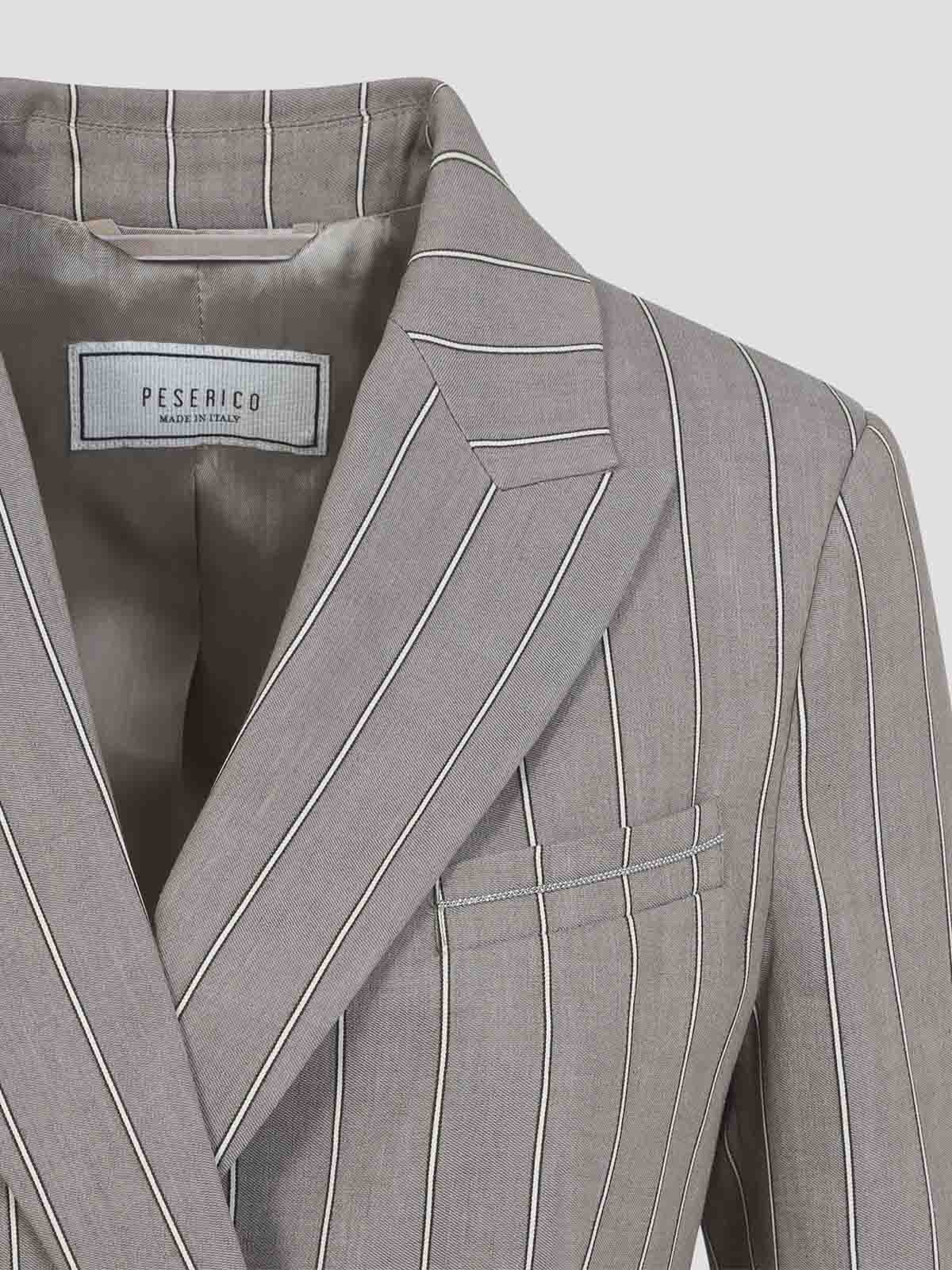 Peserico brown linen jacket. double-breasted jacket crafted from pinstriped brown linen and cotton, featuring peak lapels, a welt pocket on the chest, two flap pockets on the front, button fastening, padded shoulders, long sleeves, a signature leather label at the back of the collar, two back vents, and a full lining.