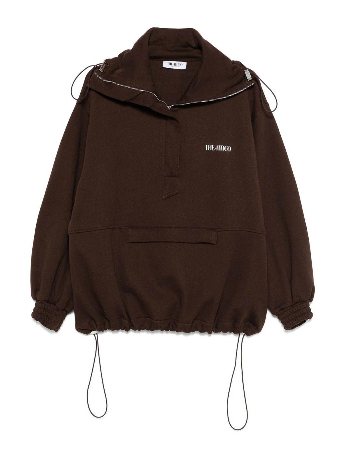 Chocolate brown half front zip fastening drawstring neck front zip-fastening pocket rubberised logo detail