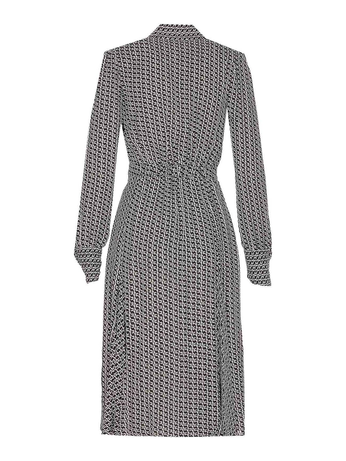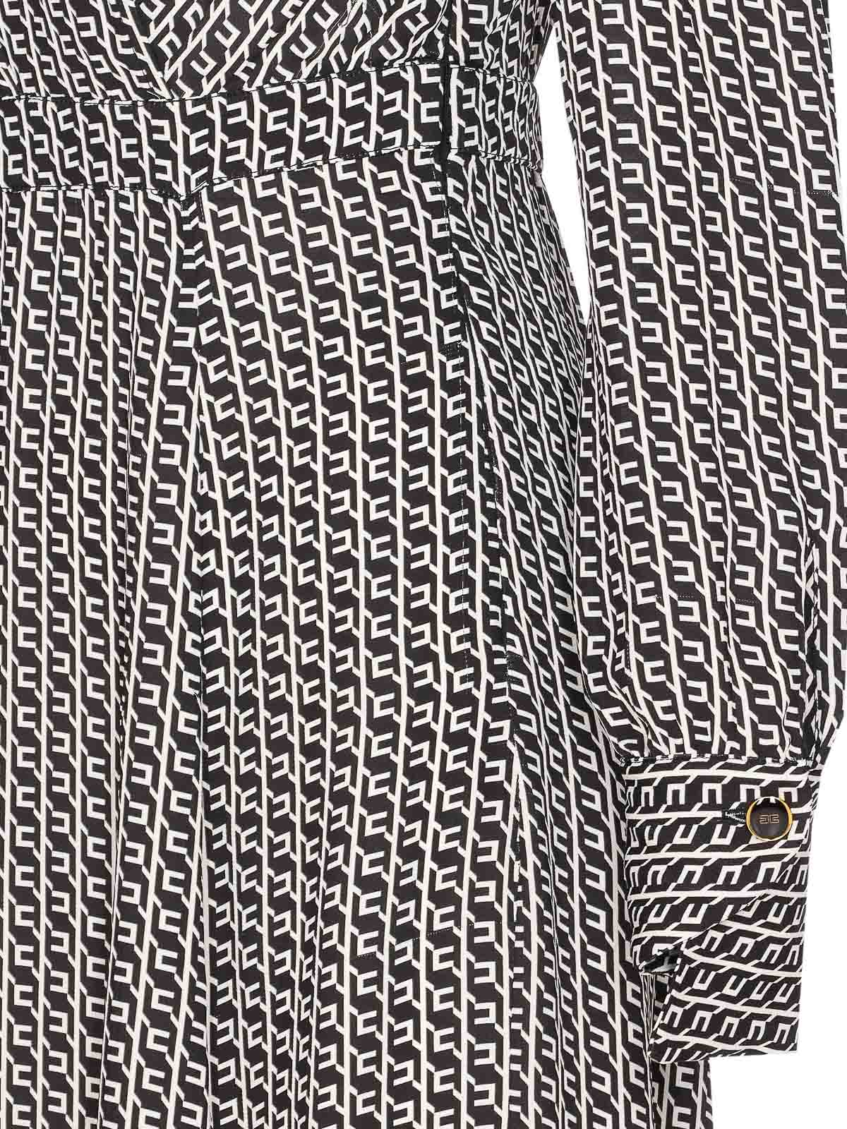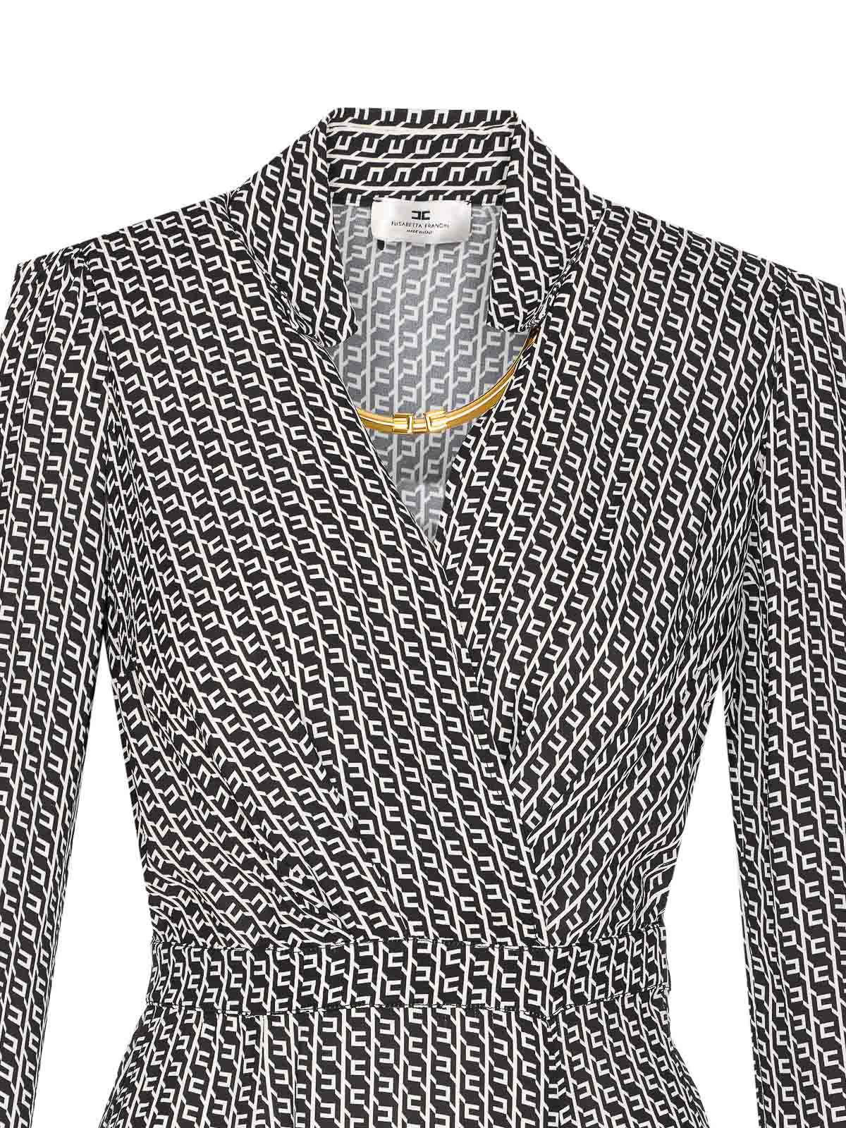 Elisabetta franchi black and white logo dress, v neck, polo collar, long sleeves, golden logo necklace, padded shoulders