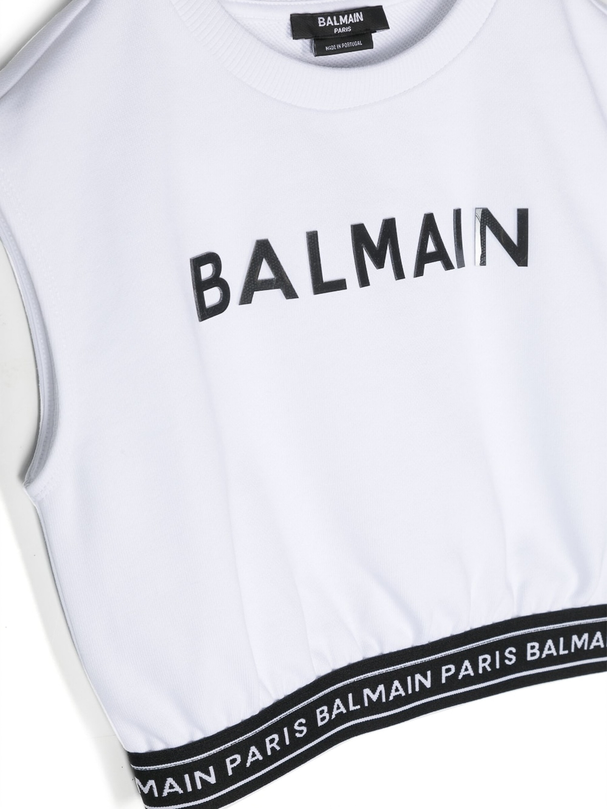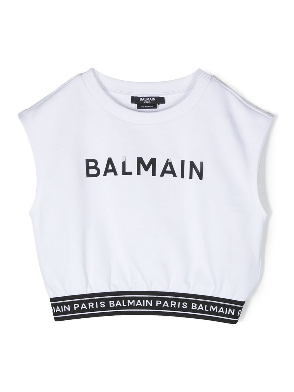 Logo-print cotton top from balmain kids featuring milk white cotton logo waistband logo print to the front crew neck sleeveless cropped and straight hem size years