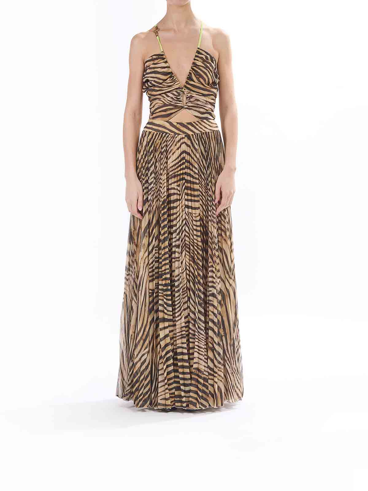 Long Plisse Dress Georgette Tiger long dress in Georgette by Just Cavalli with tigratic print characterized by a bodice with deep neckline with V Cut, central out and crossed lacing on the back the design completed by a brief with in golden metal neck and by a pleated skirt tigratic printing tigrate with V Cut, central to the crossed at the crossed Metal on the shoulder strap pleated skirt tigrata