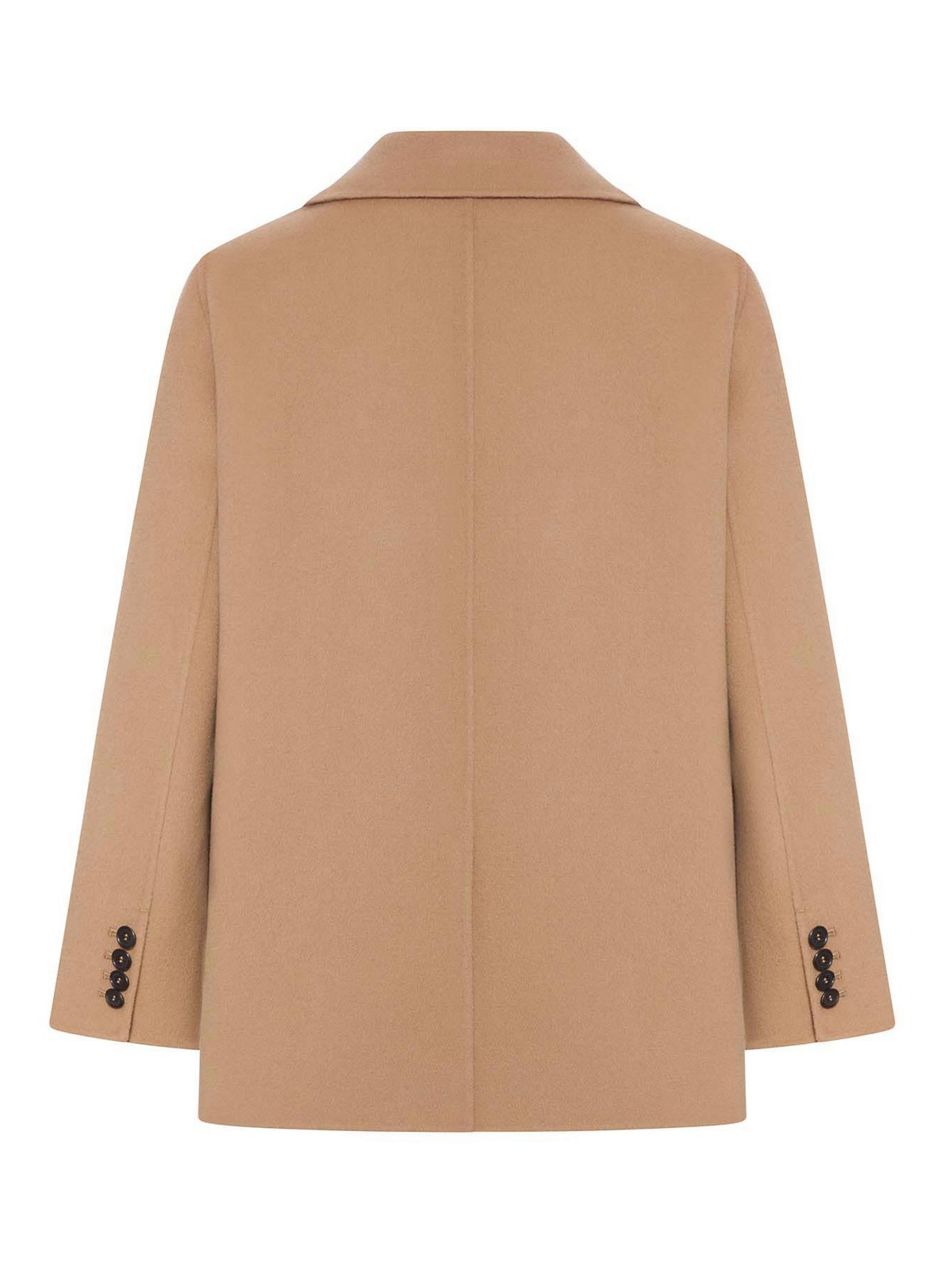 Classic collar and lapels- double-breasted- two flap pockets- chest pocket- wide sleeves with buttons- mid-length- lined interior-, color beige