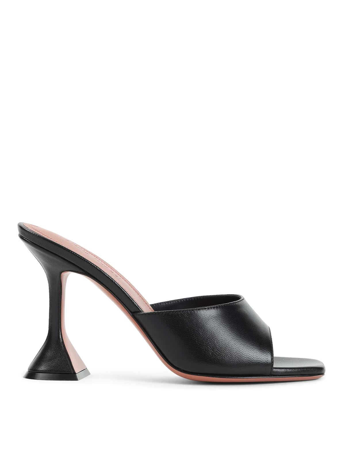 Amina muaddi black lupita slippers pure black slippers squared open toe top tonal strap slip, on style hourglass tonal heels out
