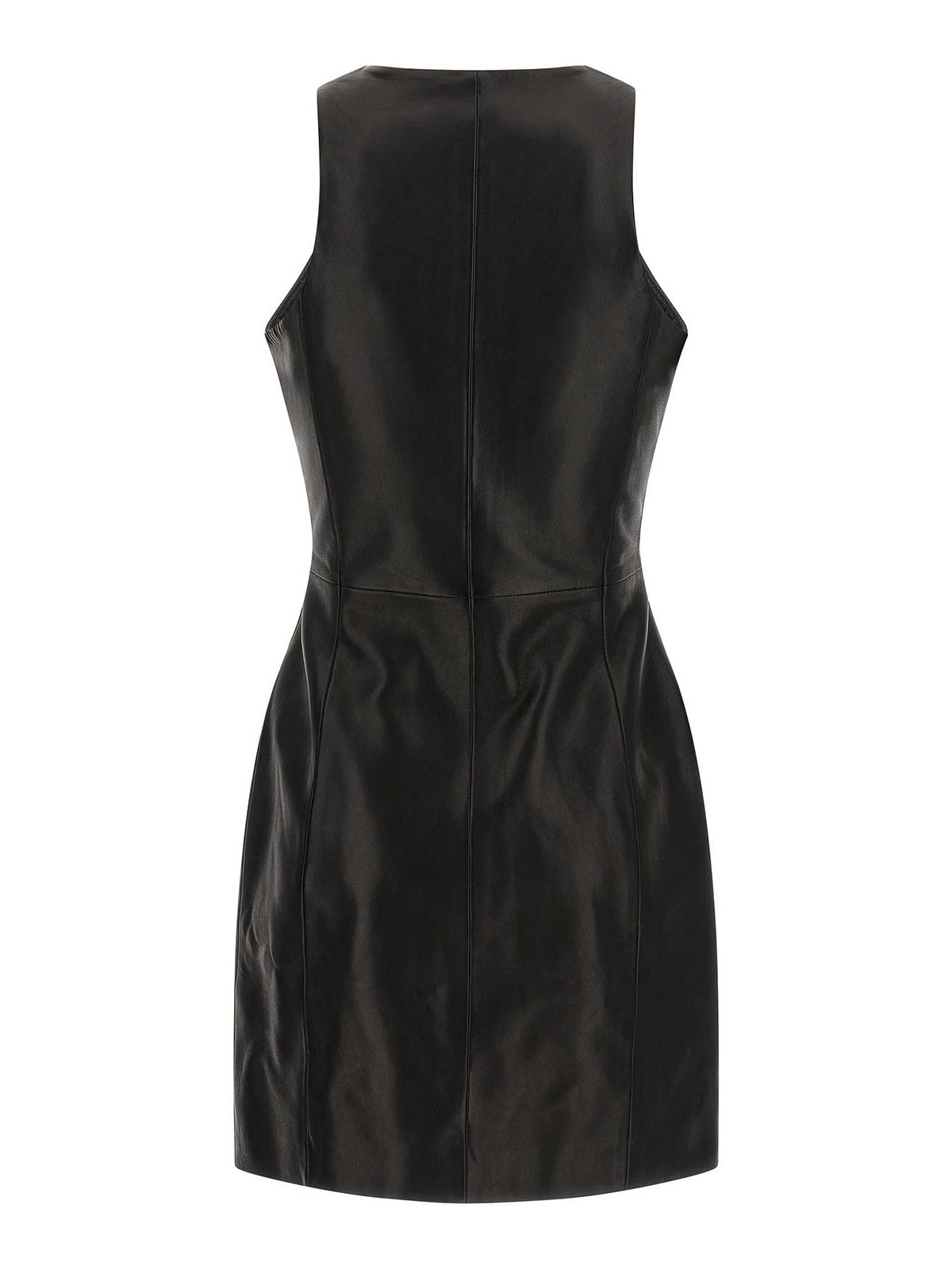 Lamb leather mini dress, panel construction, crew neck, maxi front zip closure, sleeveless, lining.