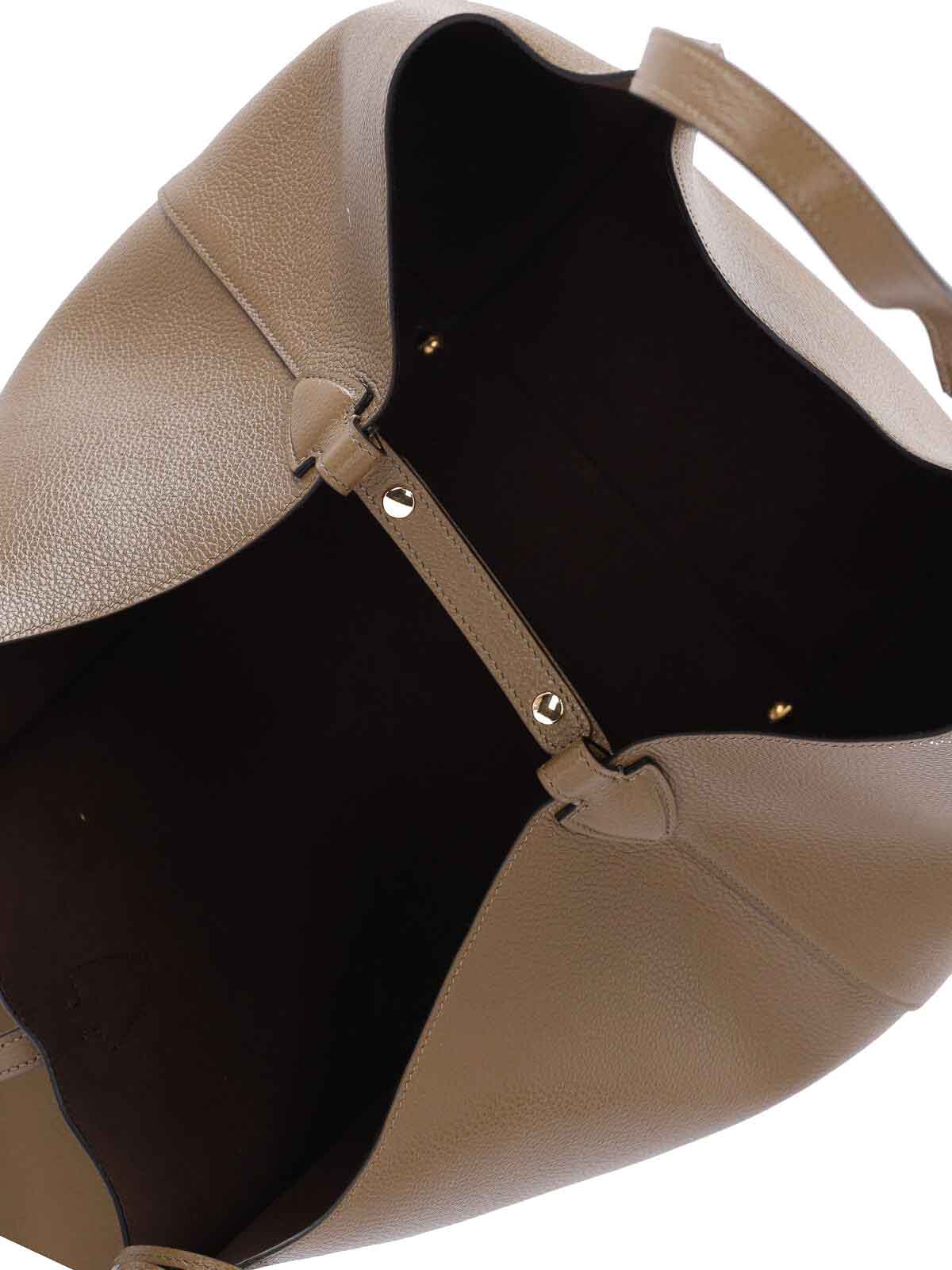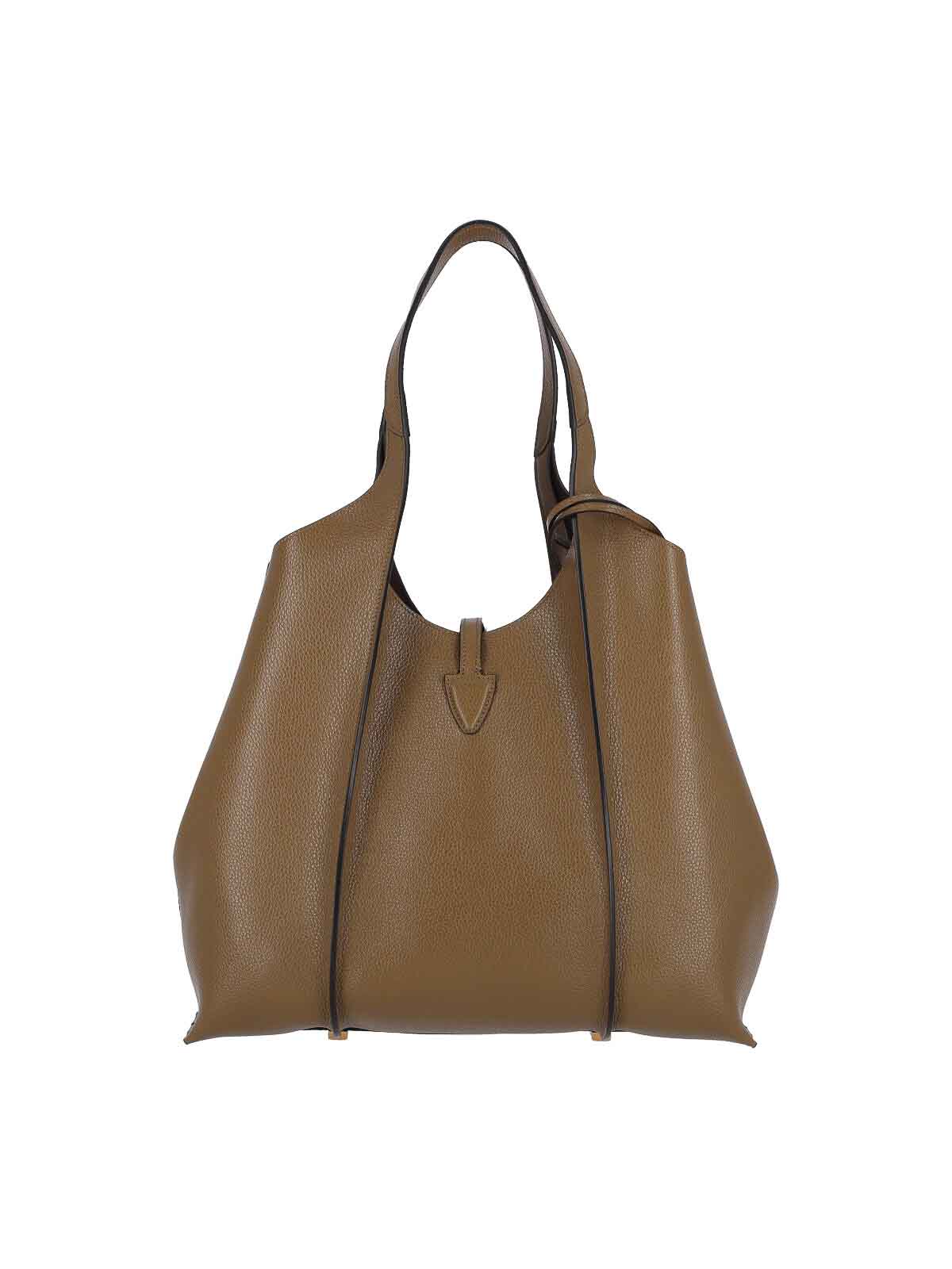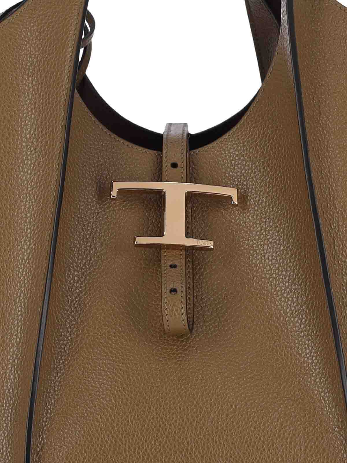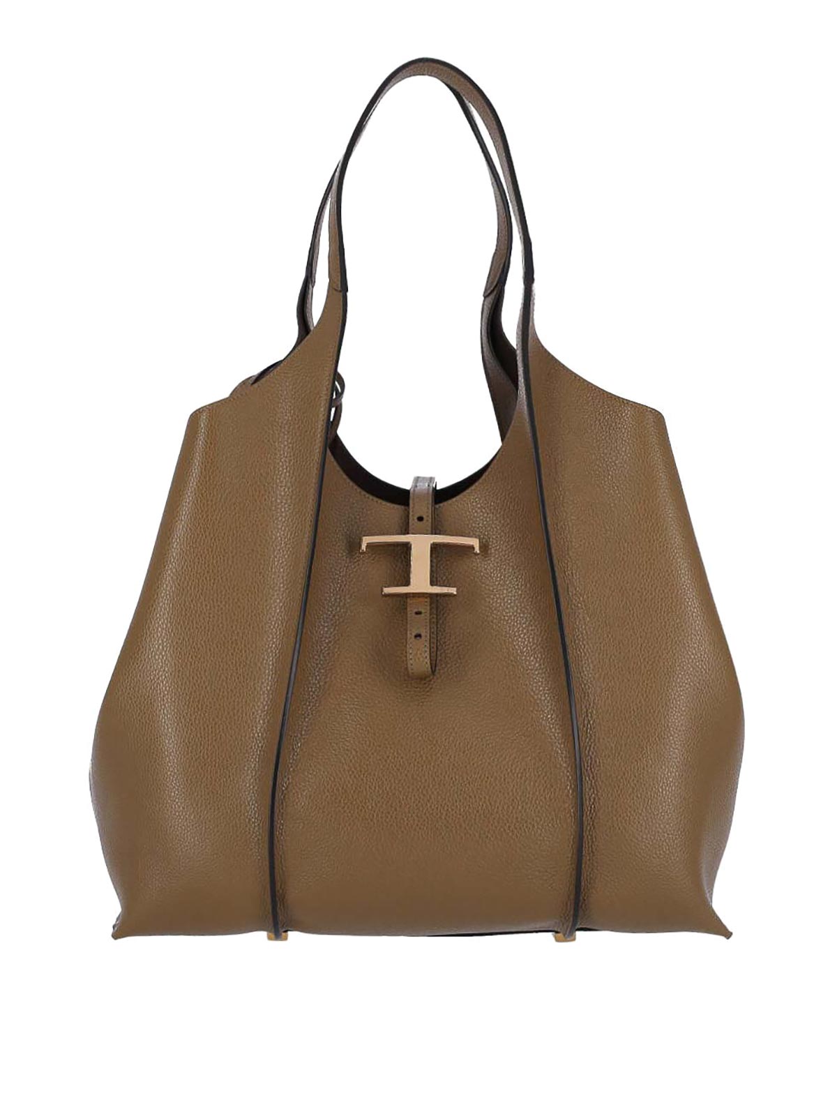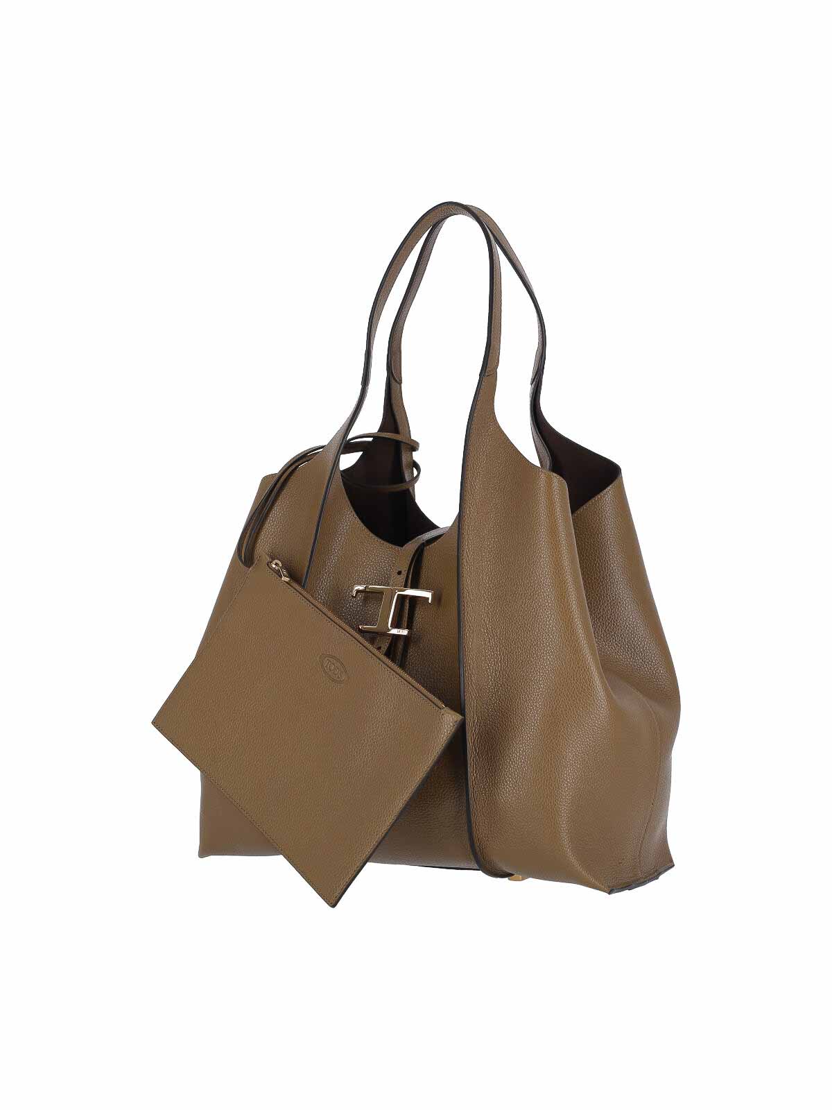 T Timeless media tote bag, Tod's, in brown hammer veal leather, two handles, interlocking strap closure, delared metal logo chain detail, a removable internal pouch zip pouch, logo detail imprinted in front, a unique internal compartment.