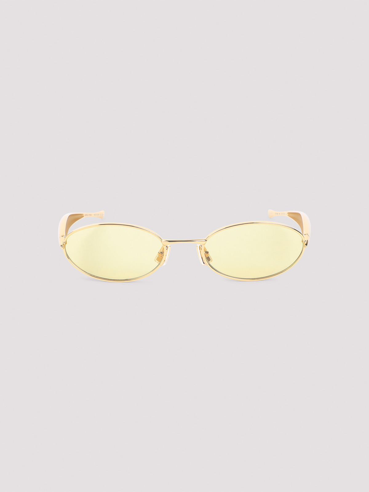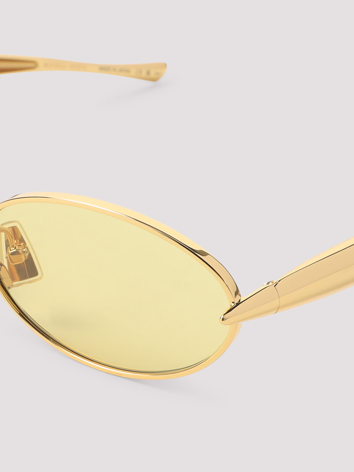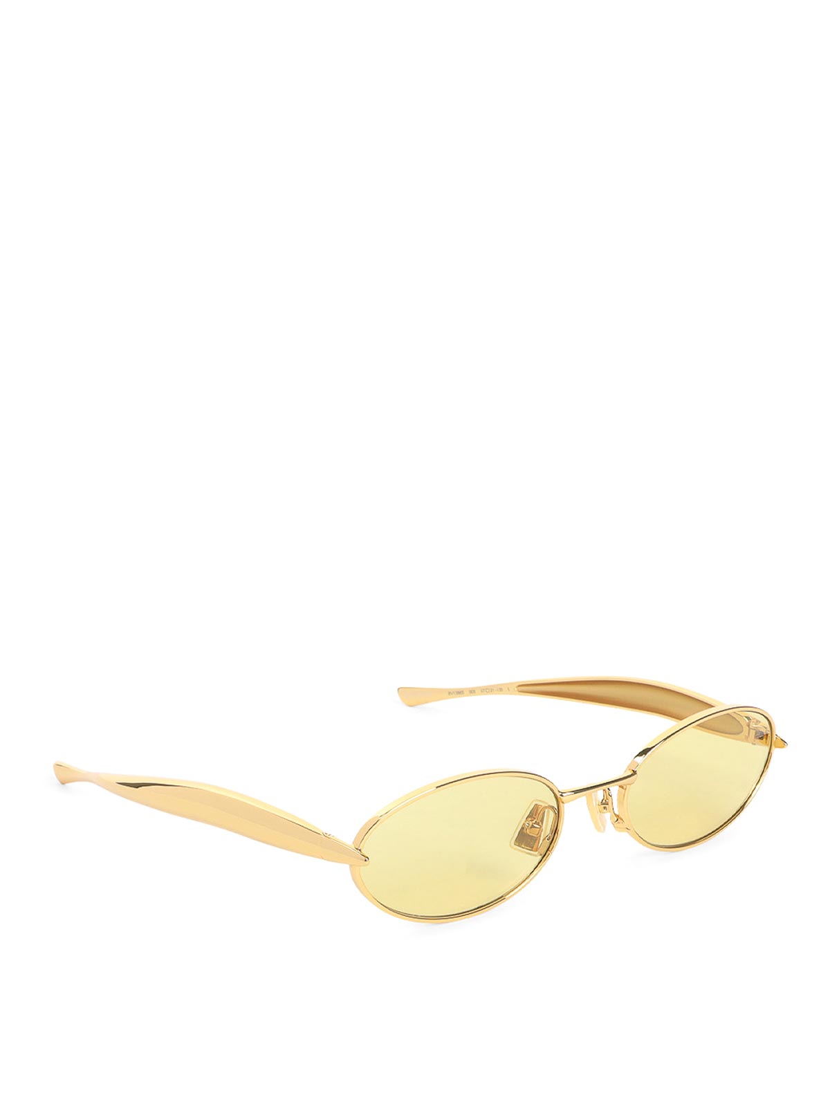 Bottega veneta sunglasses crafted from golden, toned round shaped frame yellow lenses signature fish, shaped temples