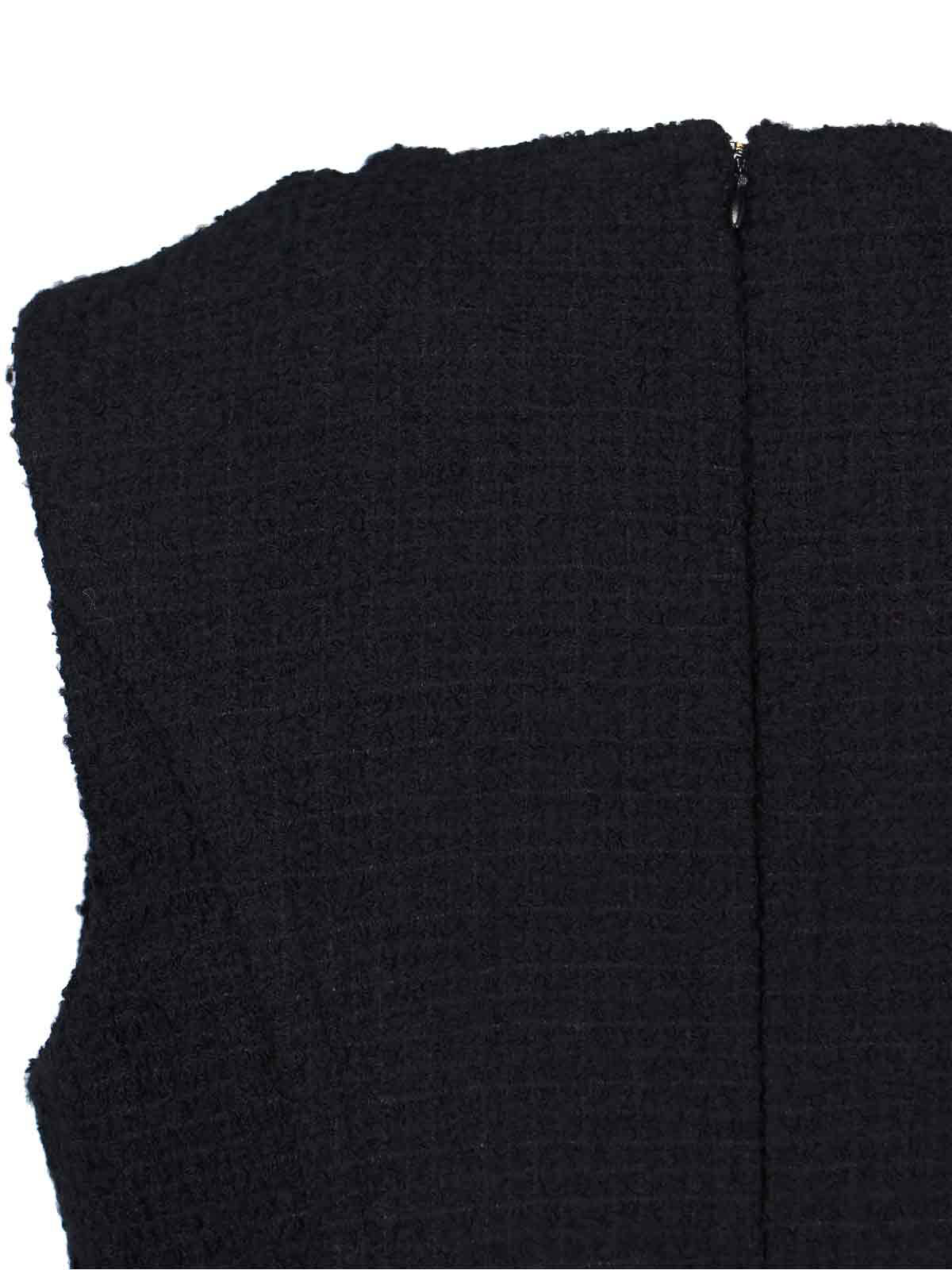 Patou midi dress, in black virgin wool, round neckline, sleeveless, back zip closure, ruffles on the bottom, straight hem.
