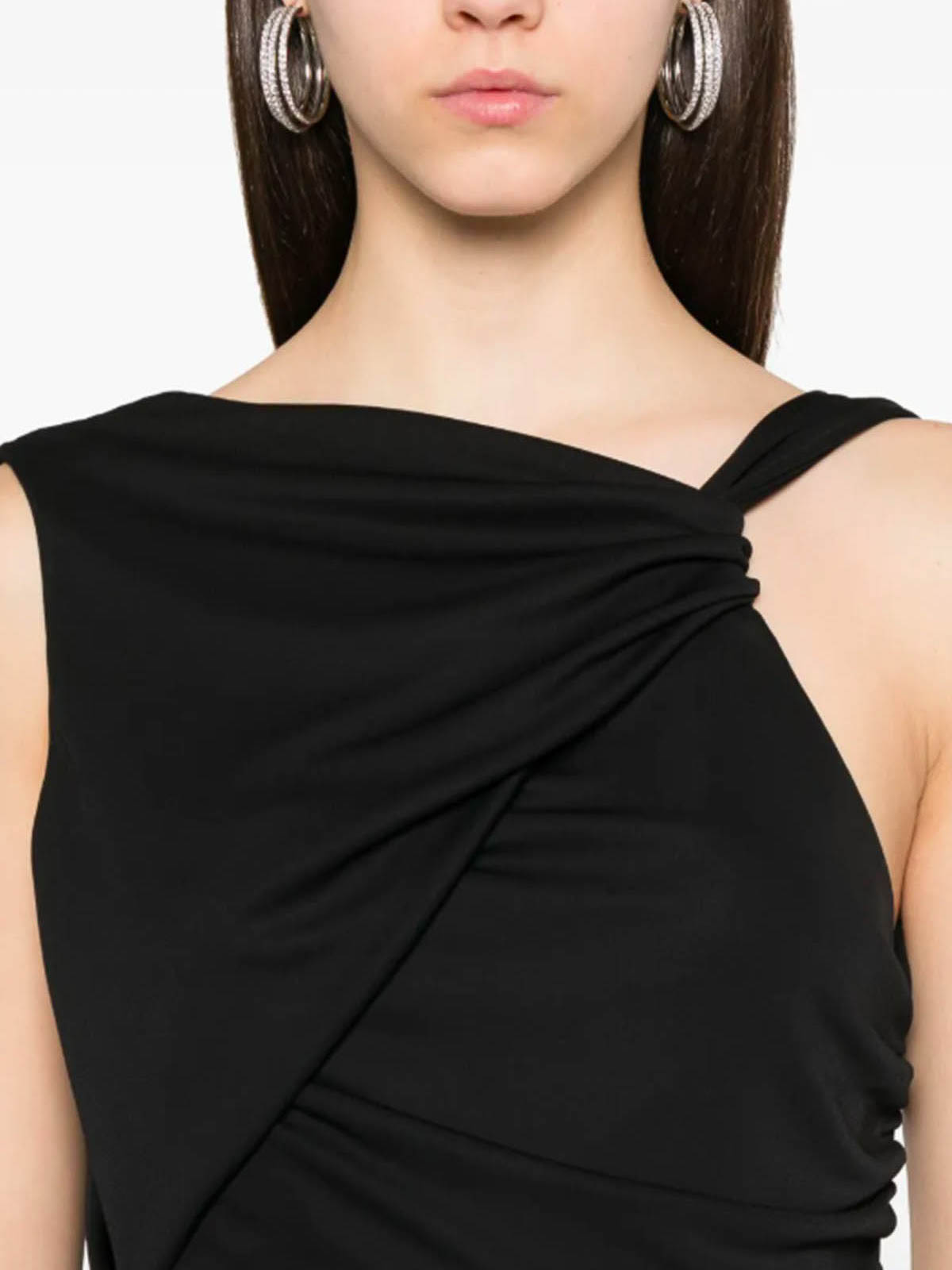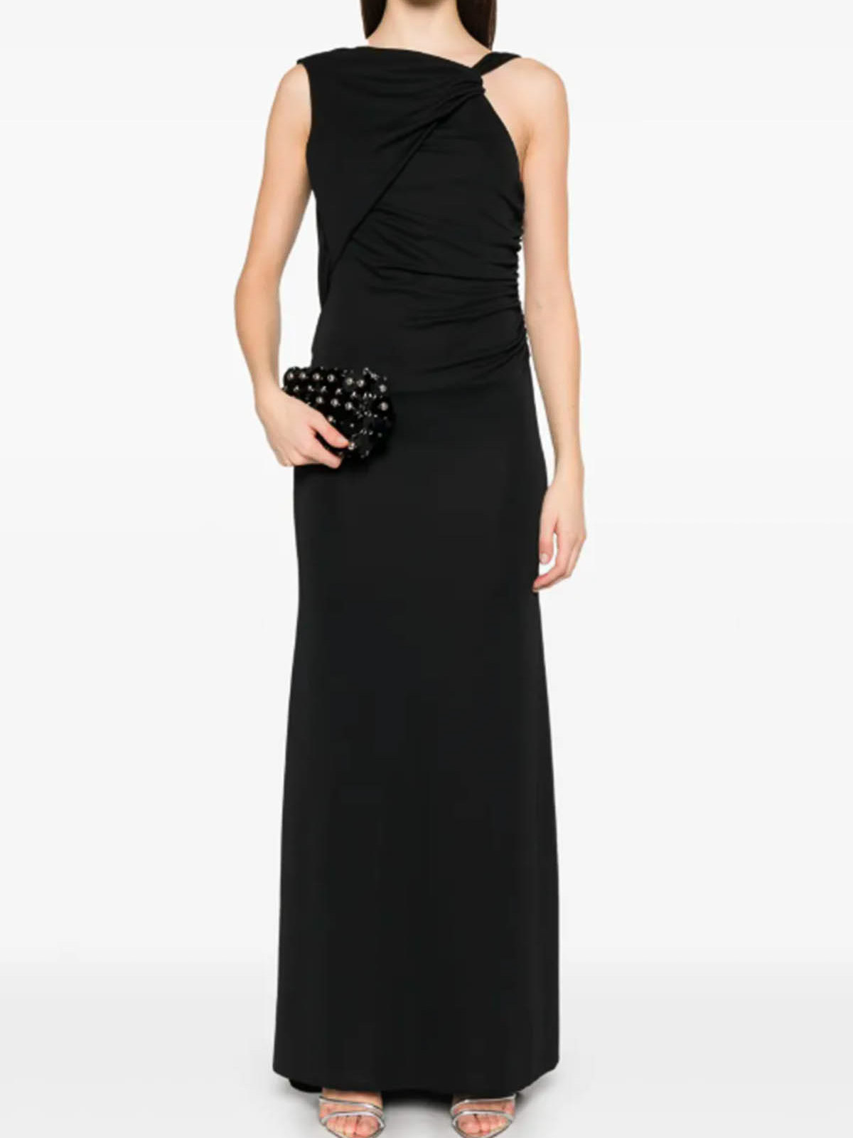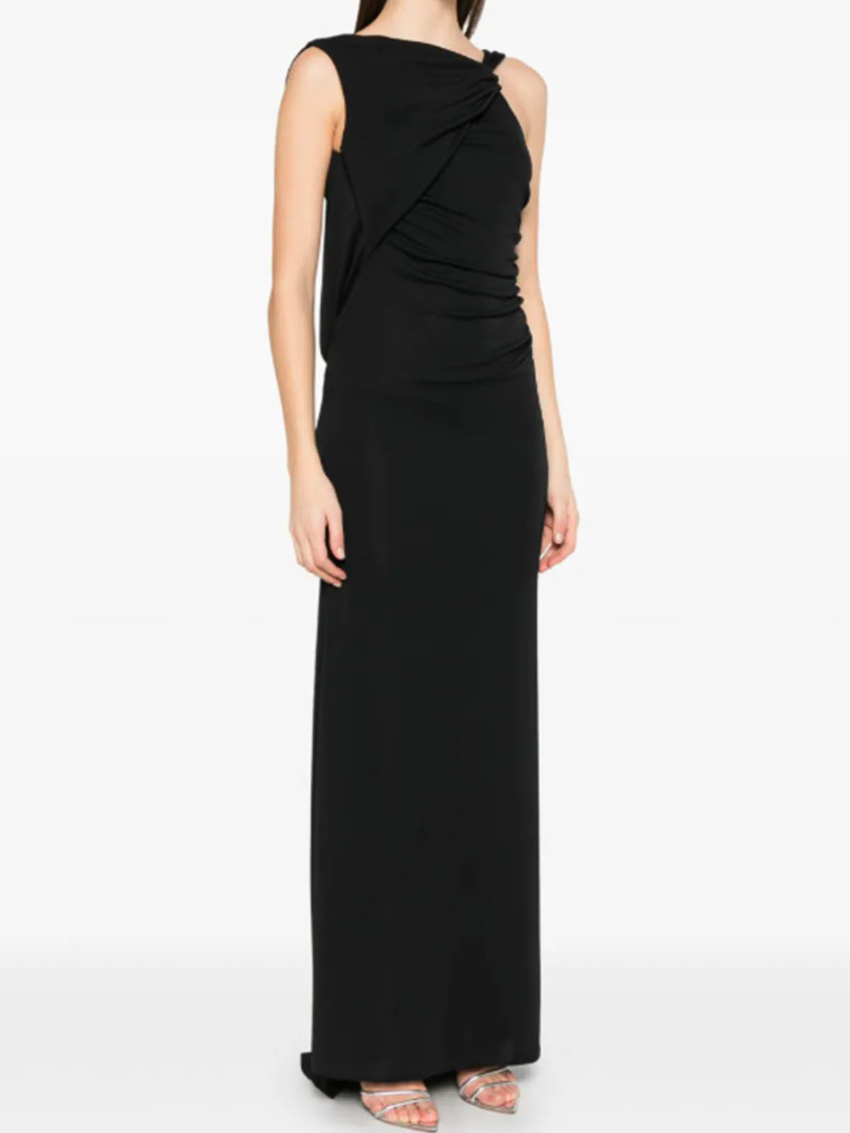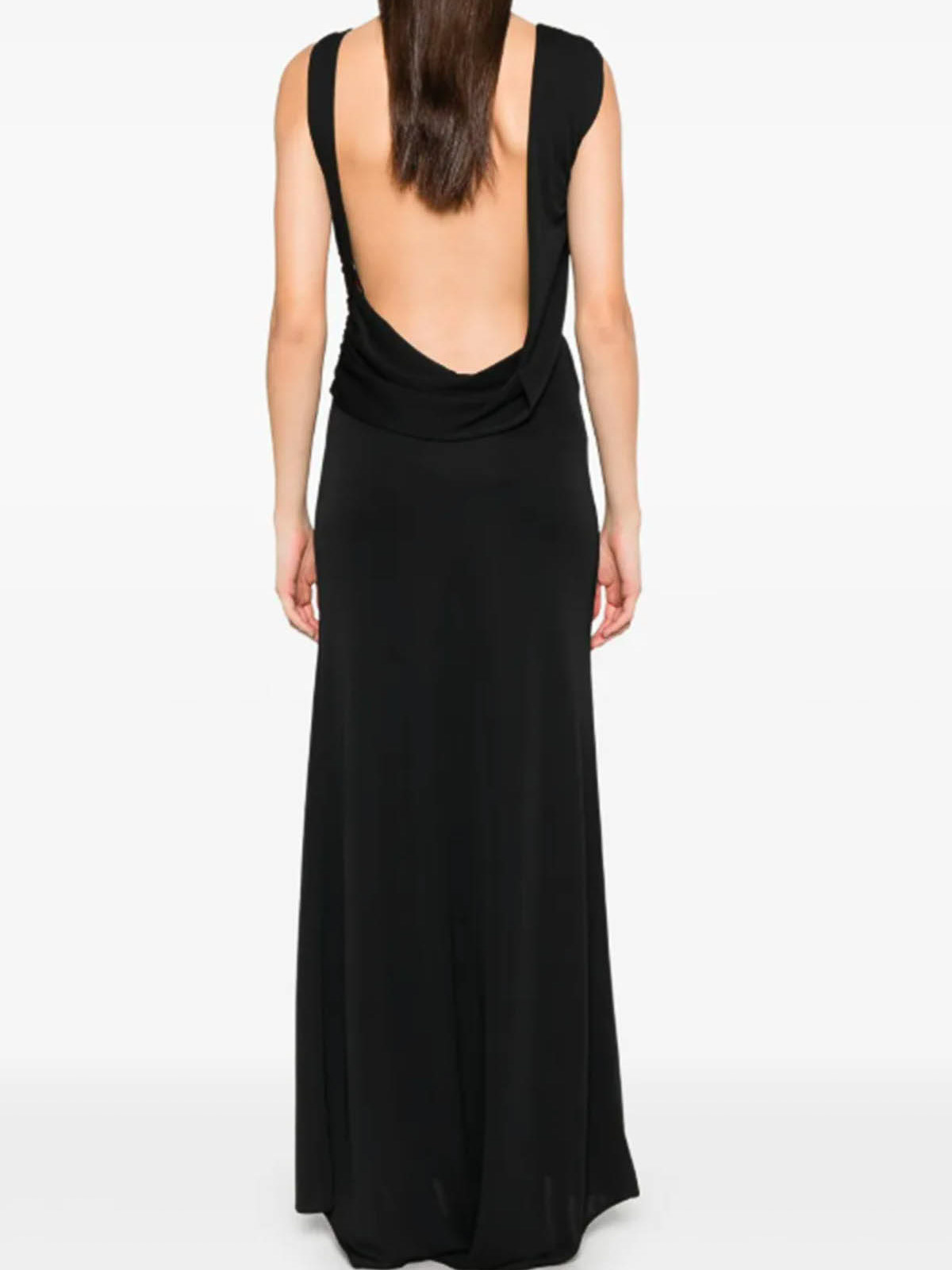 Stretch jersey model, open back, knot detail on the front, draped waist that shapes the silhouette, long design.