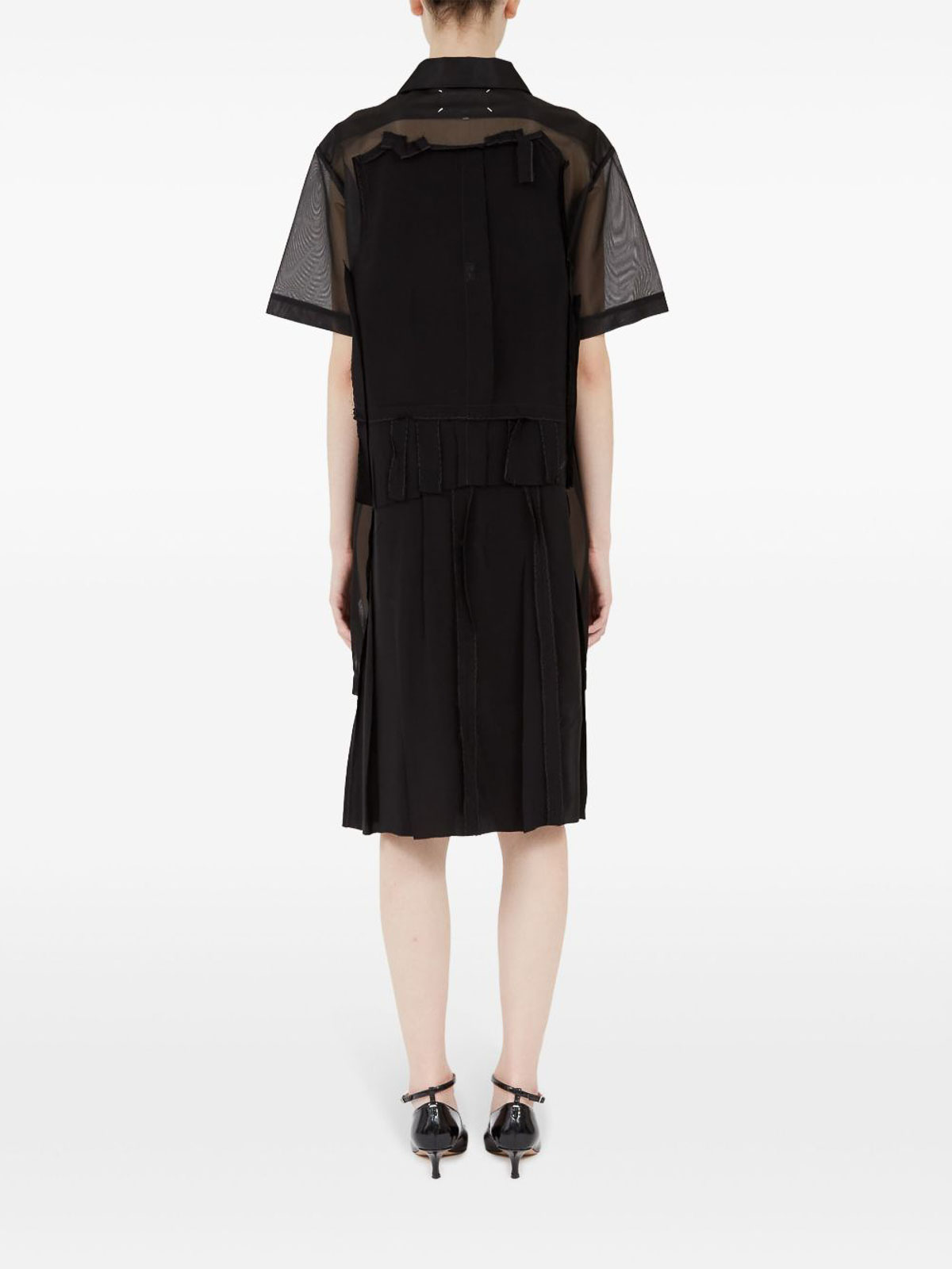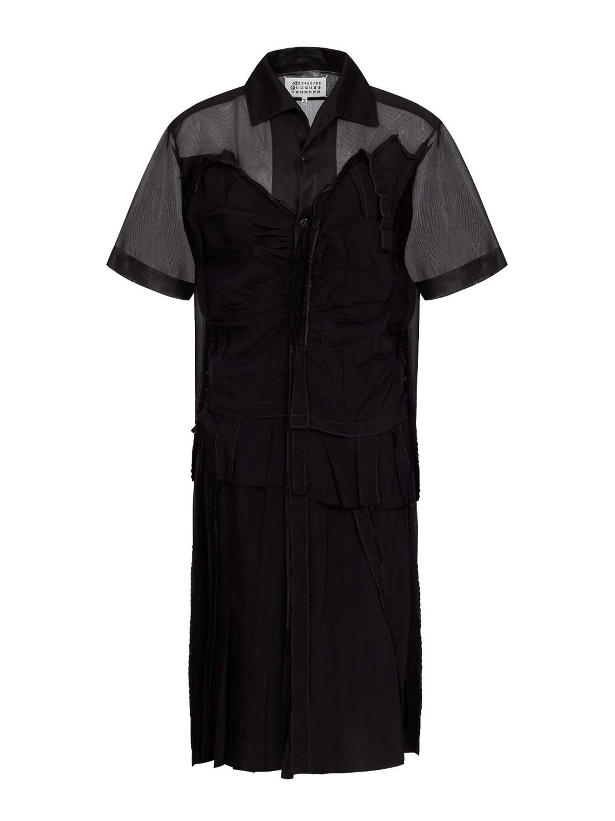 Black mesh design sheer front button fastening layered design spread collar short sleeves pleat detailing signature four-stitch logo straight hem mid-length