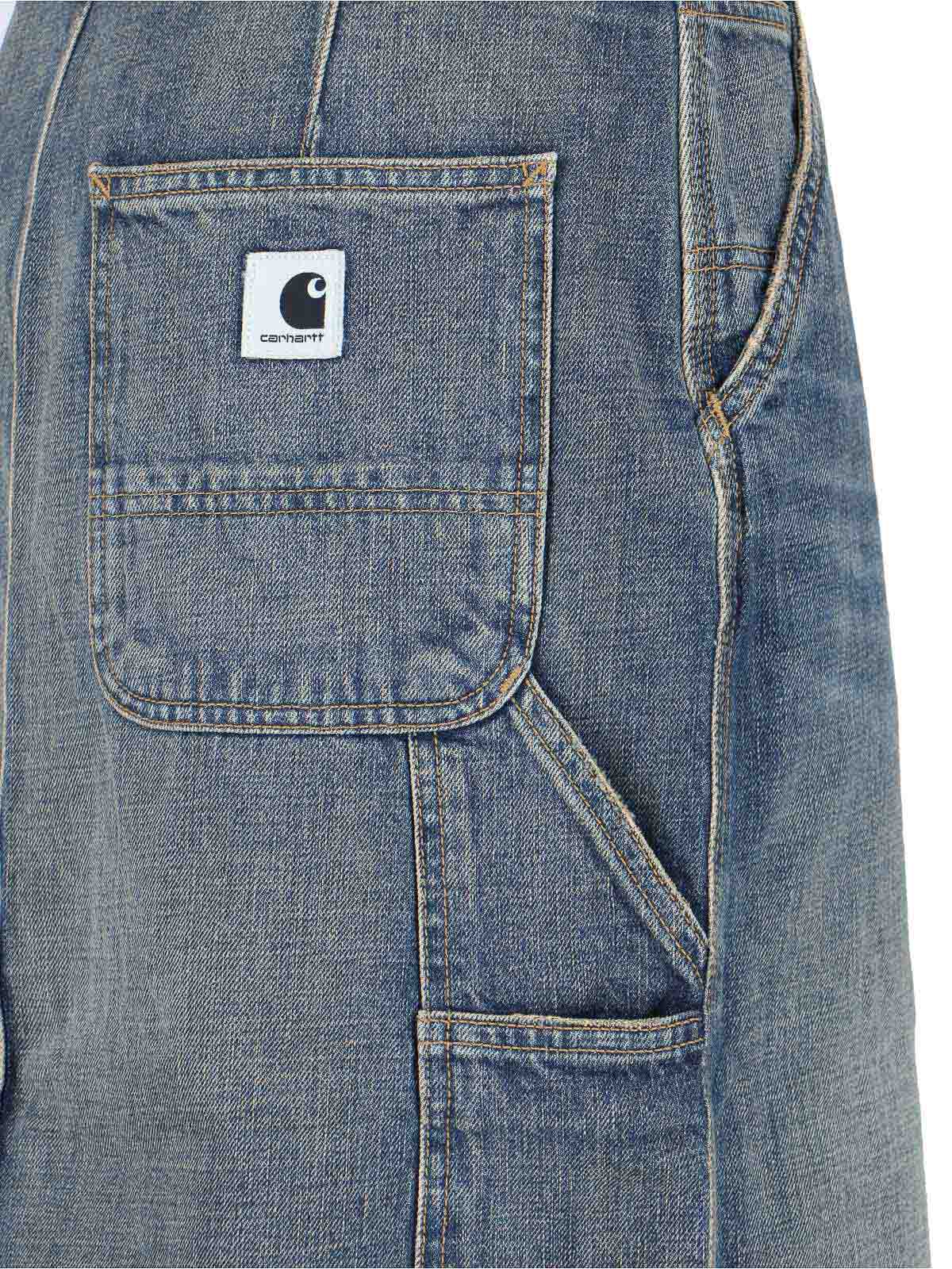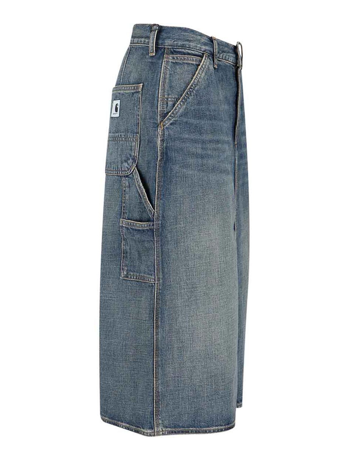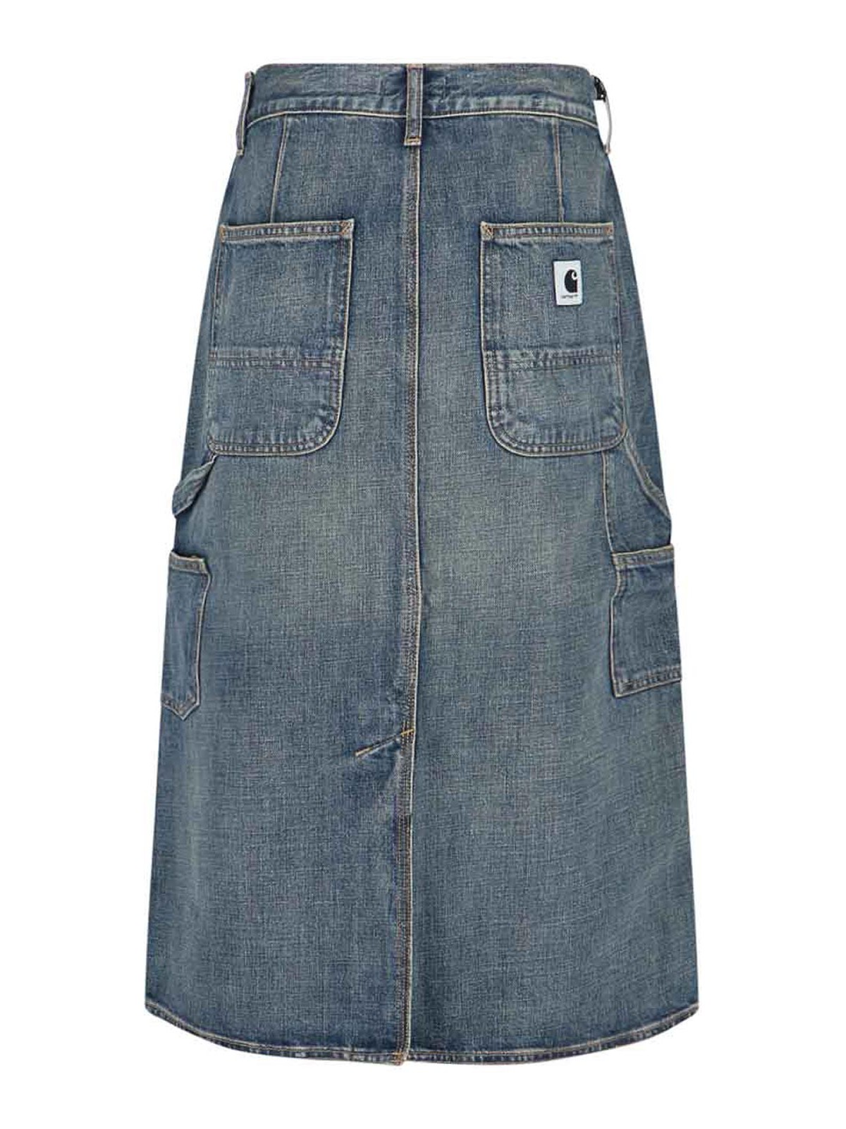Carhartt wip single knee midi skirt, in blue cotton denim, medium waist, button and zip closure, belt loops, two front and back pockets, two rear utility pockets, rear logo label, rear vent, straight hem.