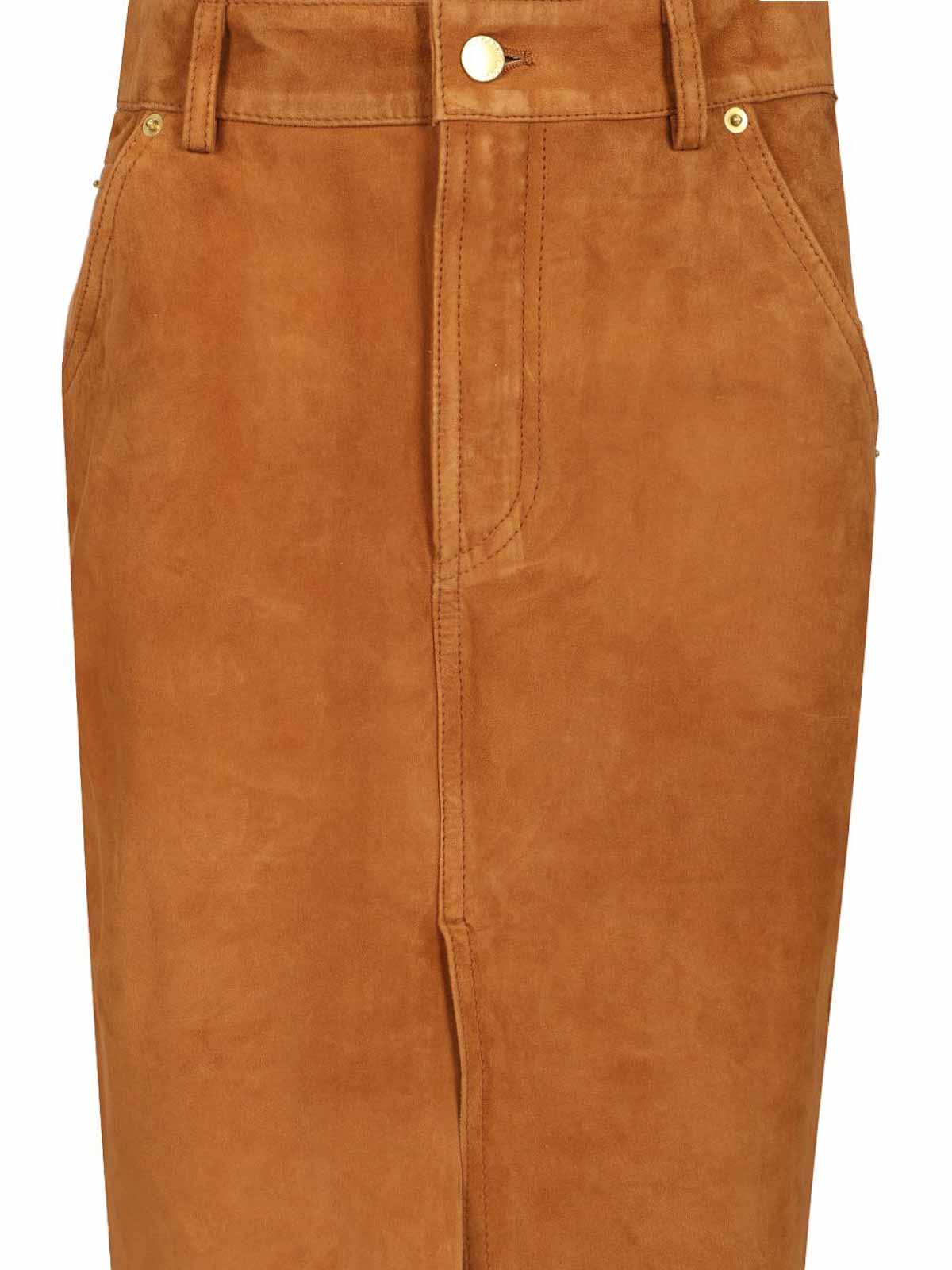 Camel suede erika midi skirt by darkpark with regular waist, front zip and button fastening and central slit on the front.