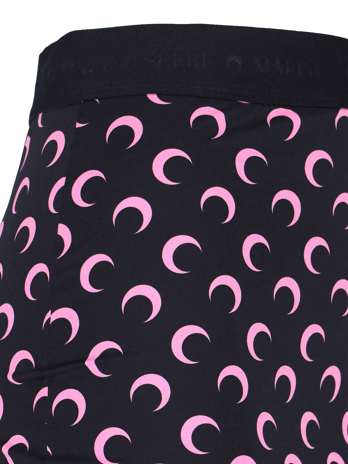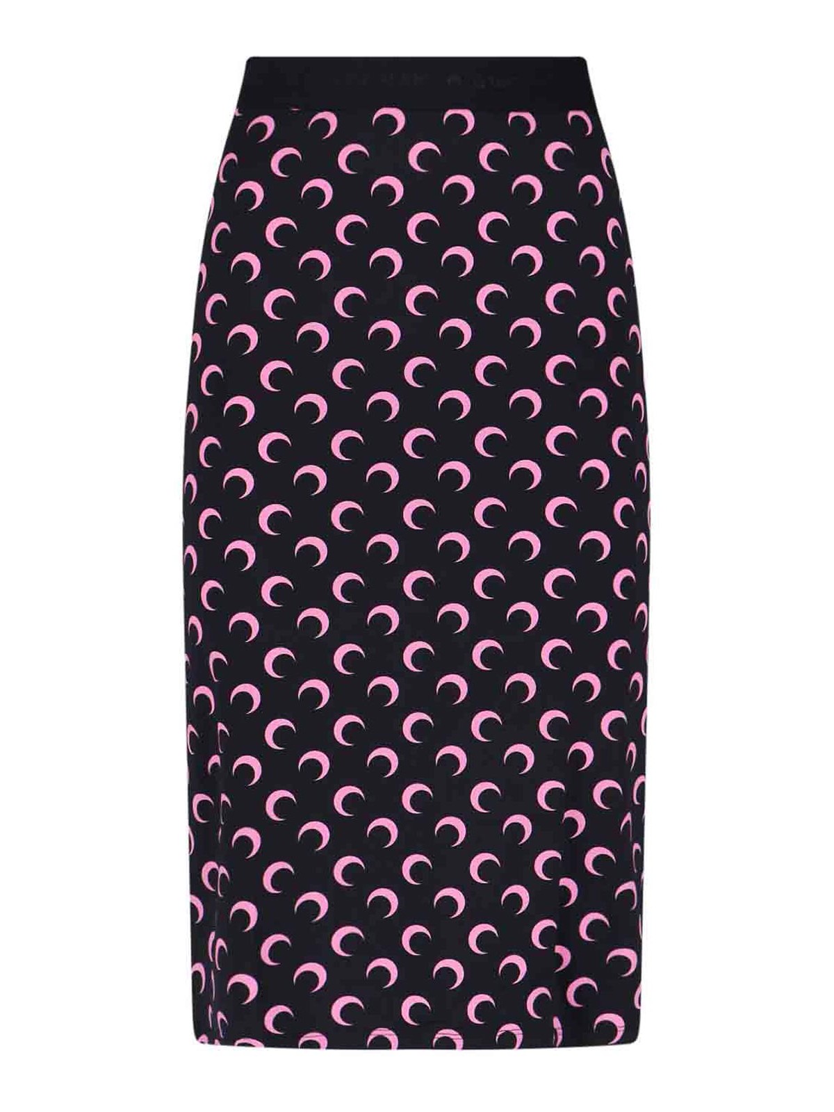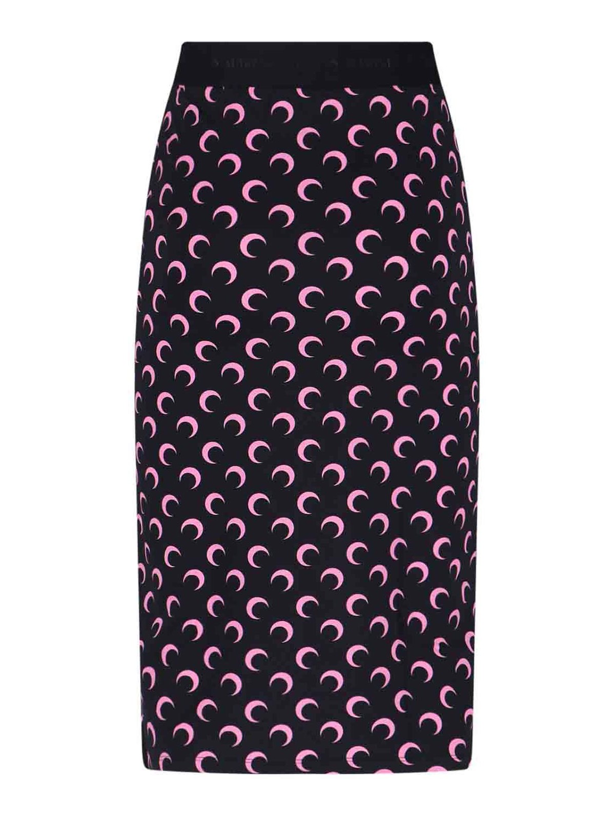Marine serre moon midi skirt, in black stretch fabric, all-over moon logo motif printed, medium elastic waist, embossed logo, elastic waistband, straight hem.