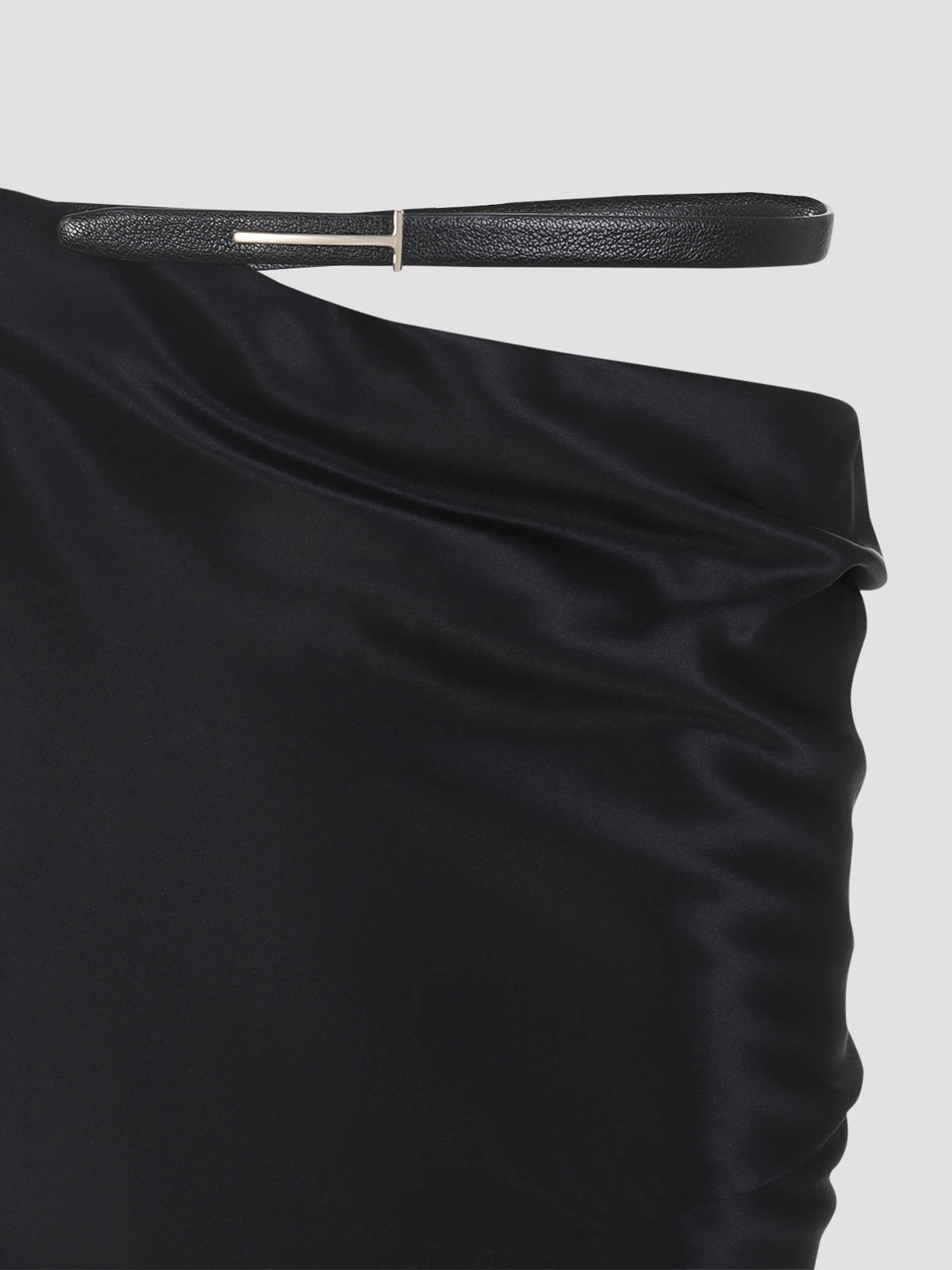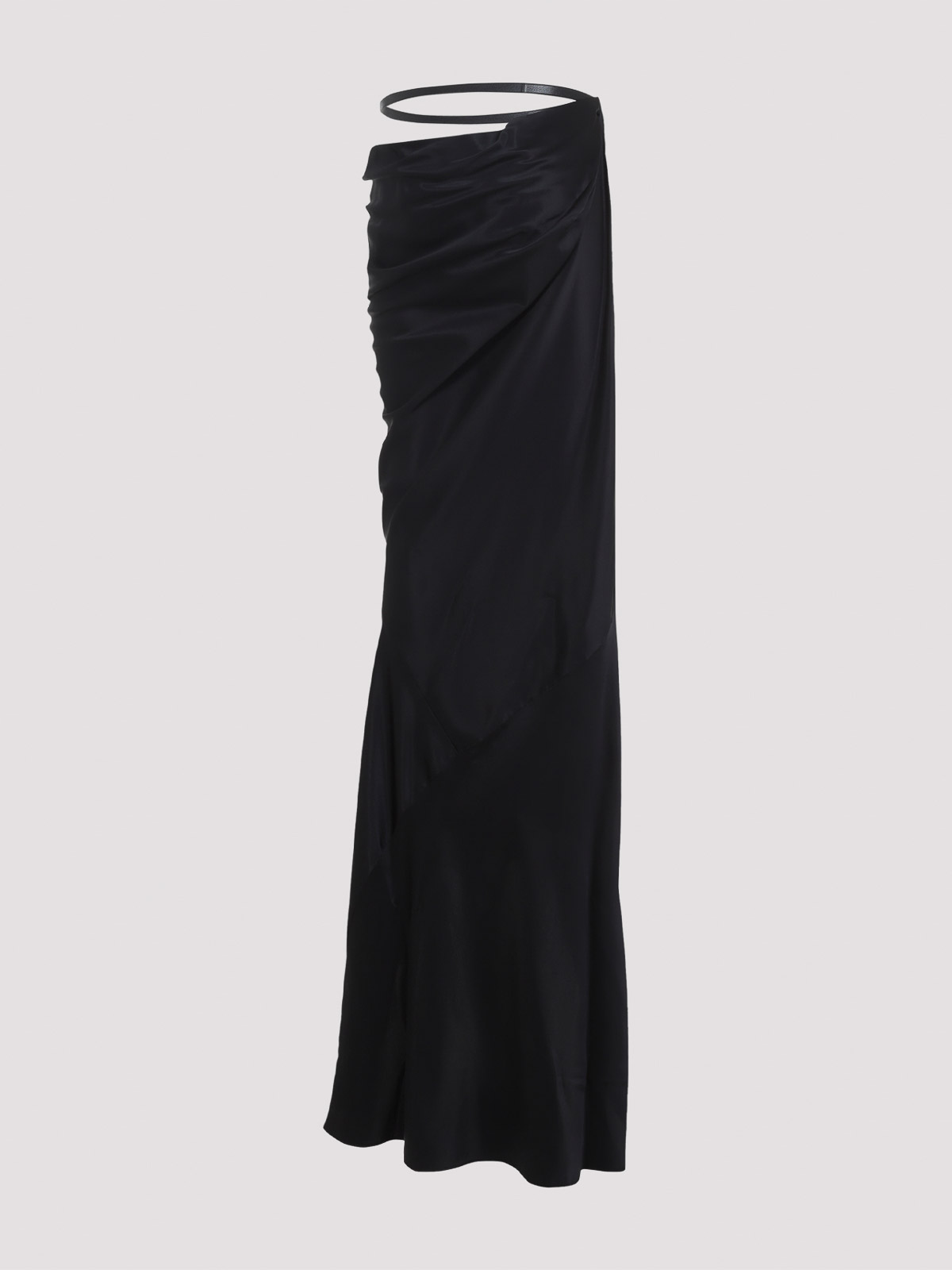 Tom ford black midi skirt pure black skirt dropped waist tonal belt on the waist side draped design asymmetric hem long, length