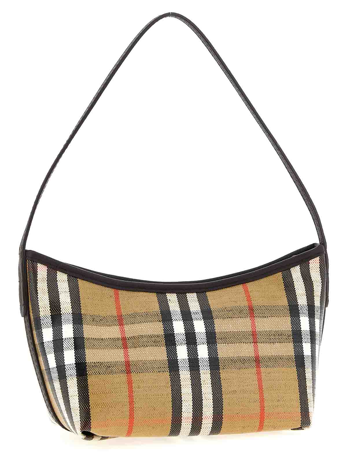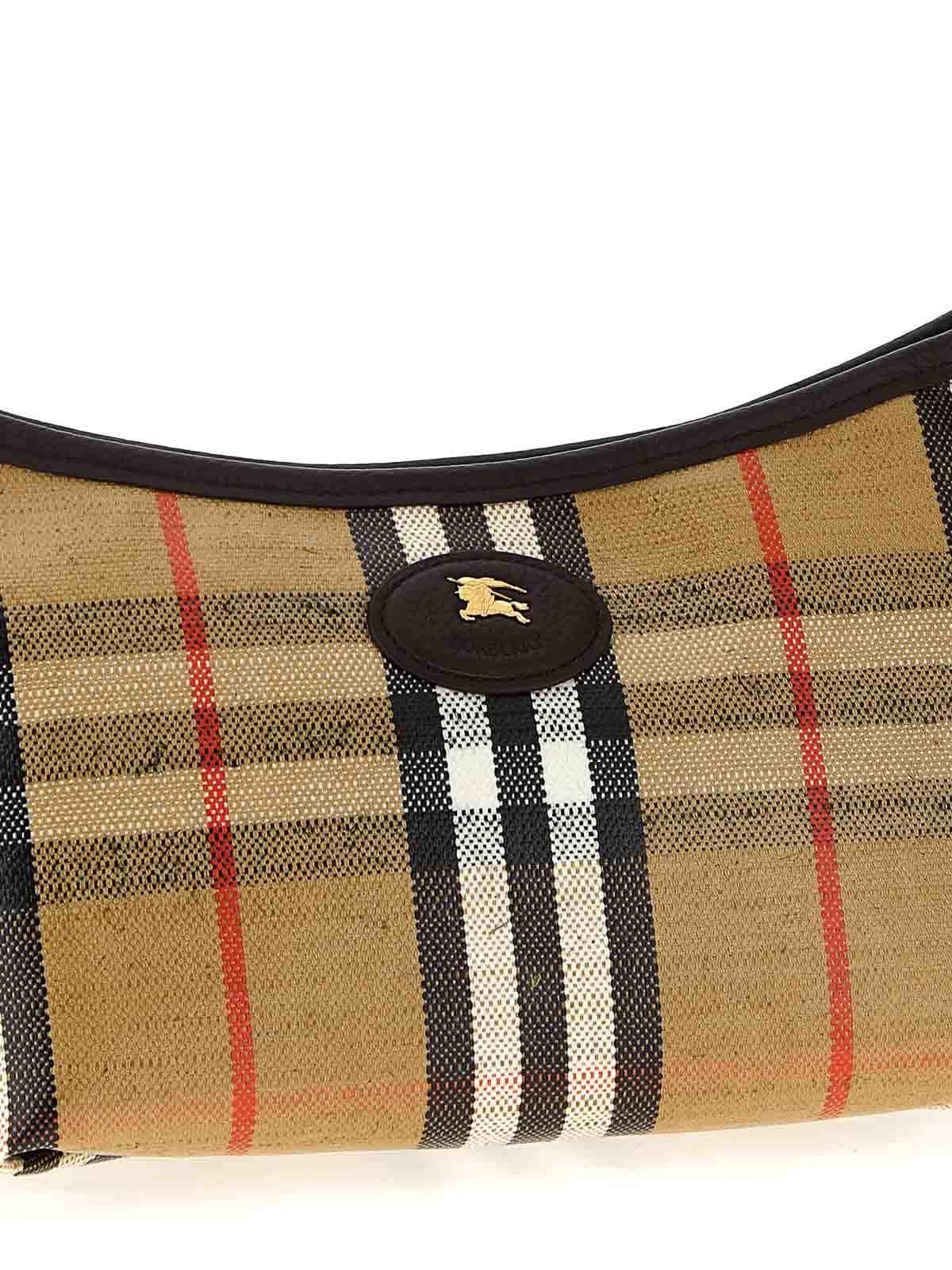 Burberry check jacquard 'highlands' mini shoulder bag in cotton and linen blend with coated finish, leather details, front 'equestrian knight design' patch, top zip closure, fixed handle, cotton lining.