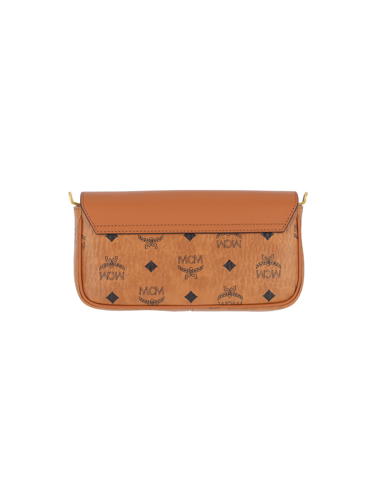 Mcm tracy shoulder bag, in brown visetos monogram fabric, golden metal handle, adjustable and removable shoulder strap, flap closure, tone-on-tone engraved logo detail, two internal card slots, one main internal compartment.