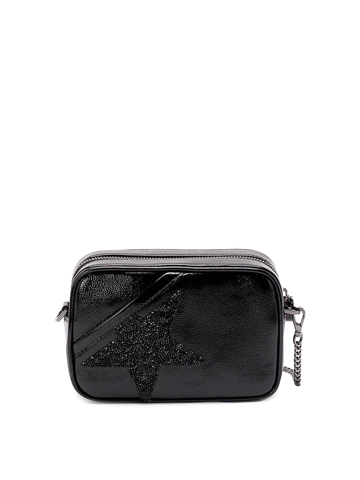 Introducing the mini `star` bag from golden goose, a chic accessory that perfectly combines style and functionality, crafted from premium bos taurus leather, this bag features a sleek black finish that adds a touch of class to any outfit, with dimensions of 16.5cm wide, 10.5cm high and 6cm deep, compact yet roomy enough to hold your essentials, the adjustable shoulder strap length of 55cm allows for versatile styling options, making it perfect for Out both day and night, produced in Italy, this bag is a testimony to timeless craftsmanship and design.