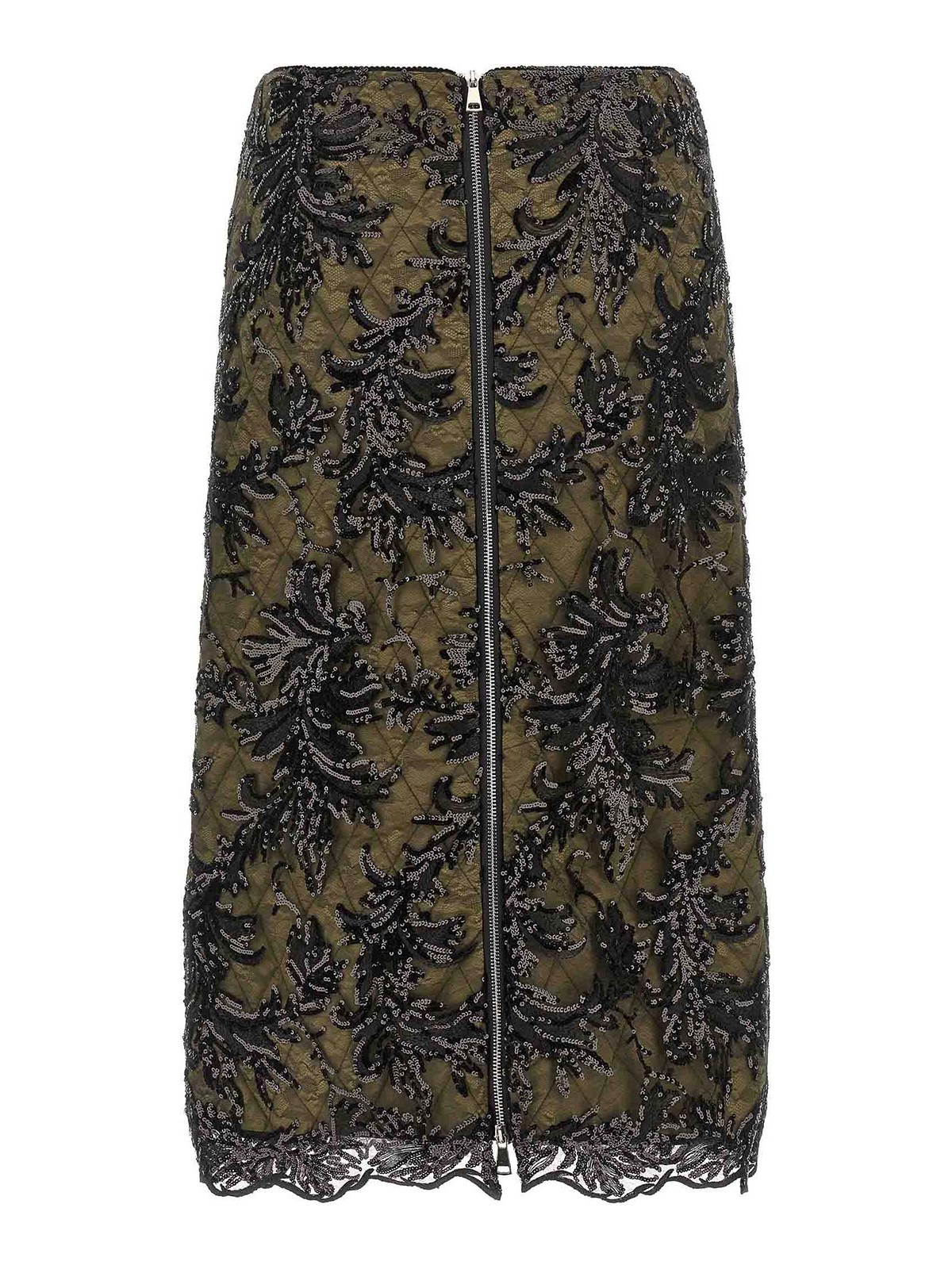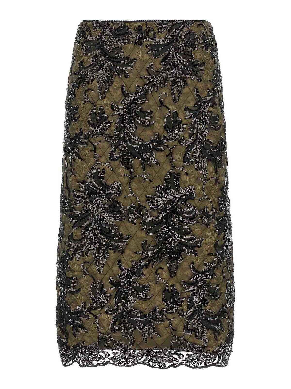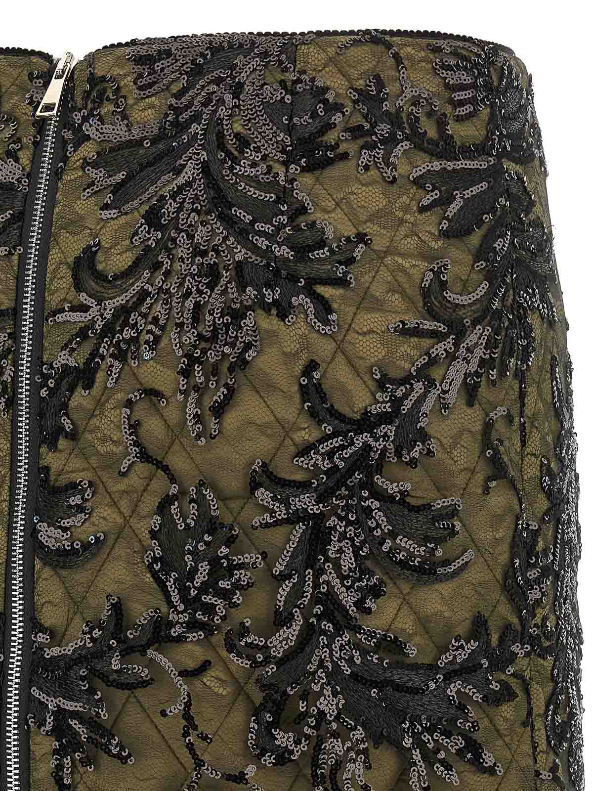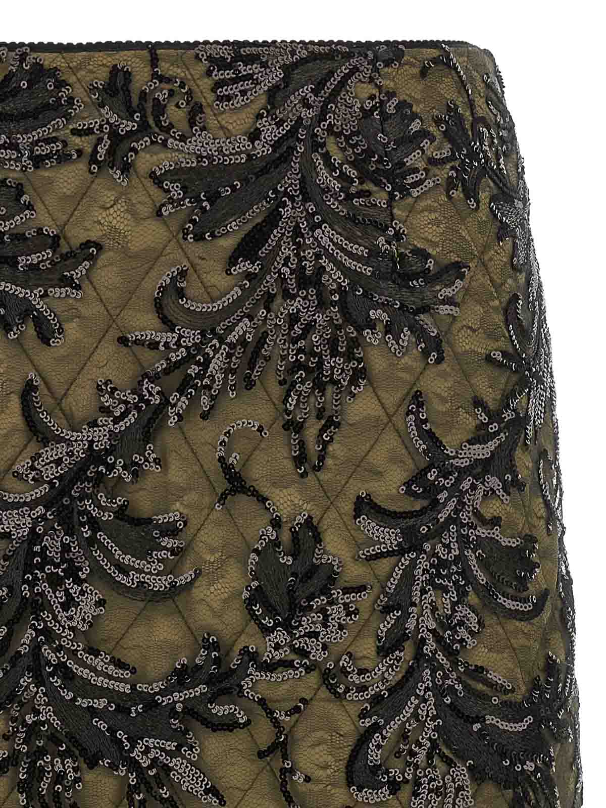 Moni' midi skirt in quilted fabric covered in lace with all-over sequin appliqu, longuette model, back zip closure, and asymmetrical hem.