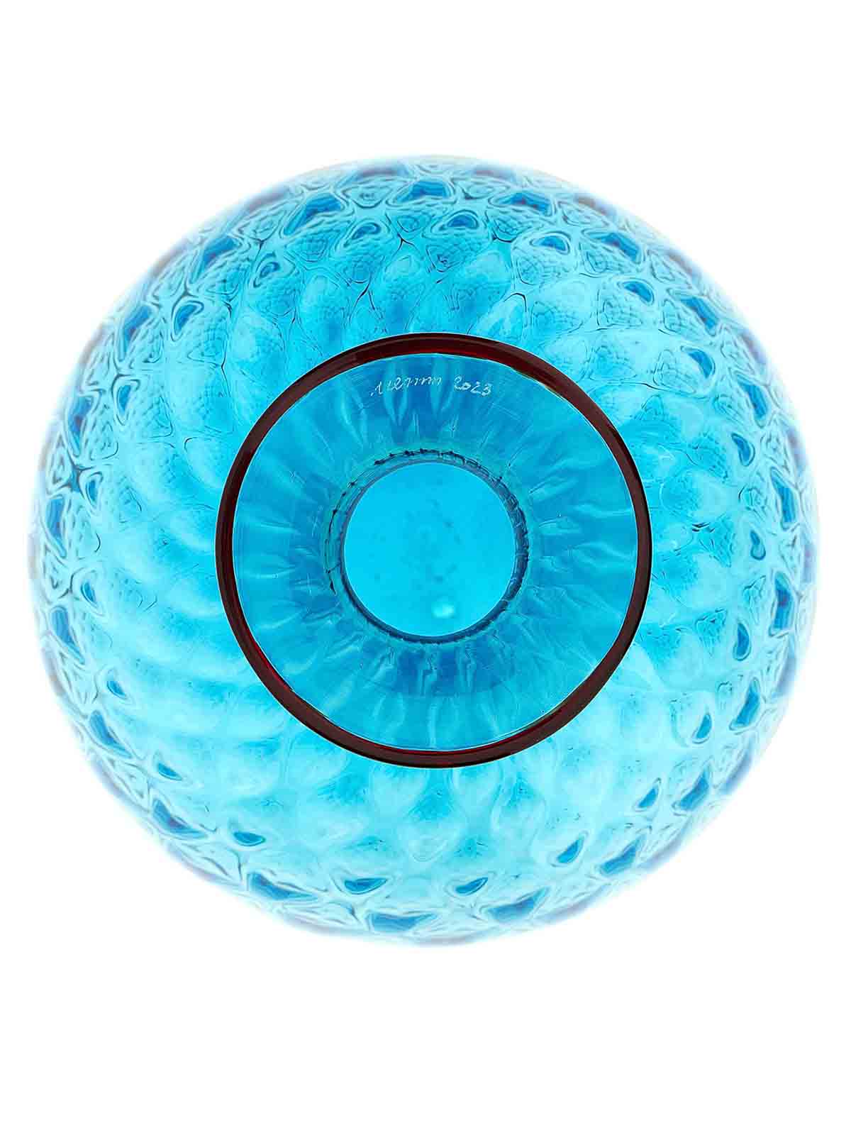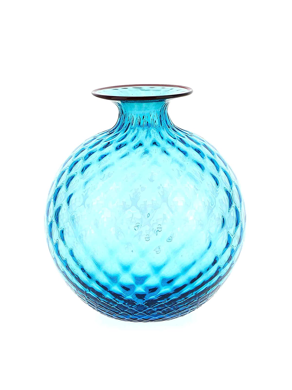 It looks soft, yet it is glass. the optical illusion of the 1970 monofiori by venini is in its name: balloton, the unique process that recreates the quilted effect on the surface. the work is handmade, blown in the characteristic metal mold and finished in the thin neck with a hot applied colored thread, which varies in color.