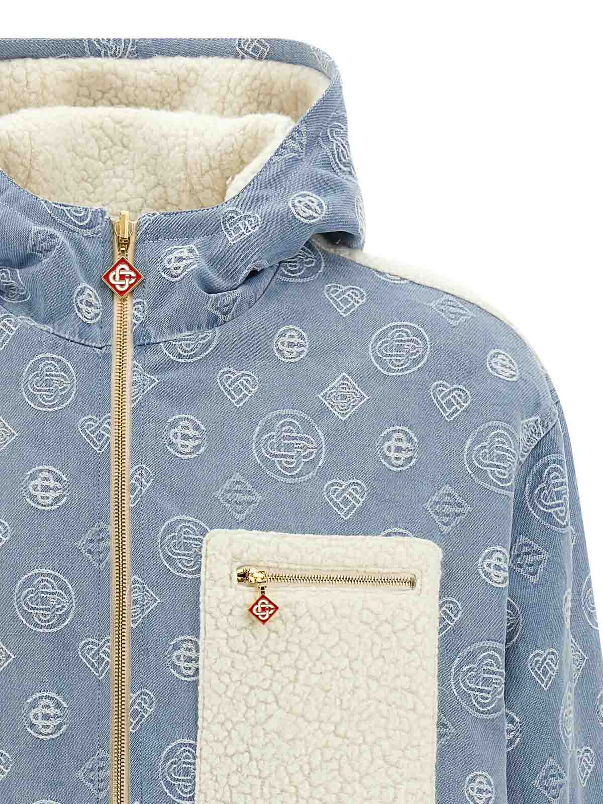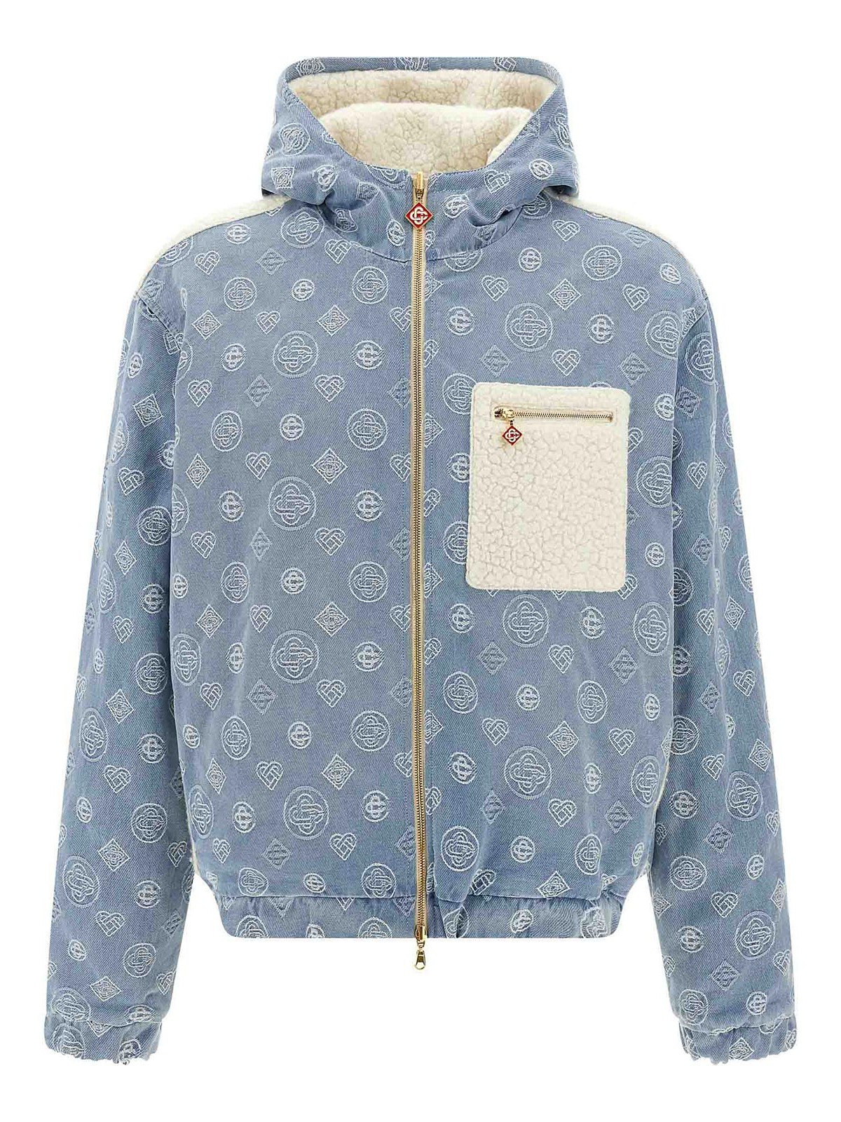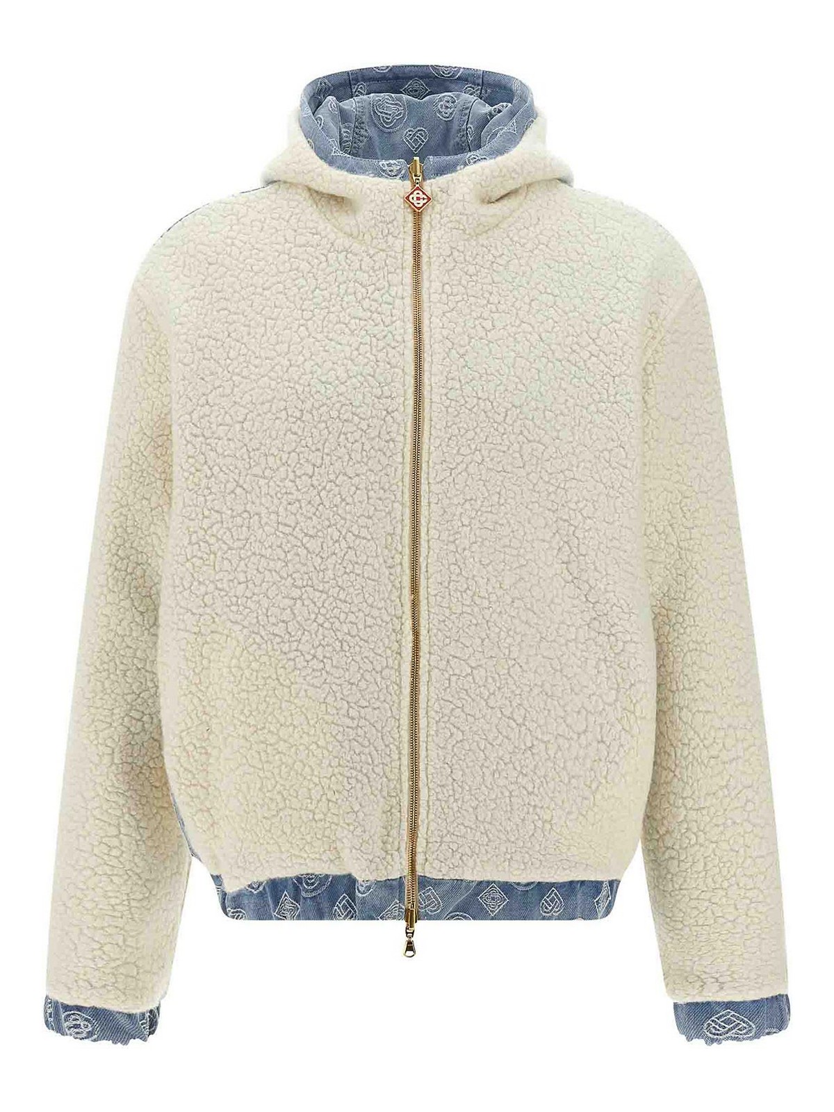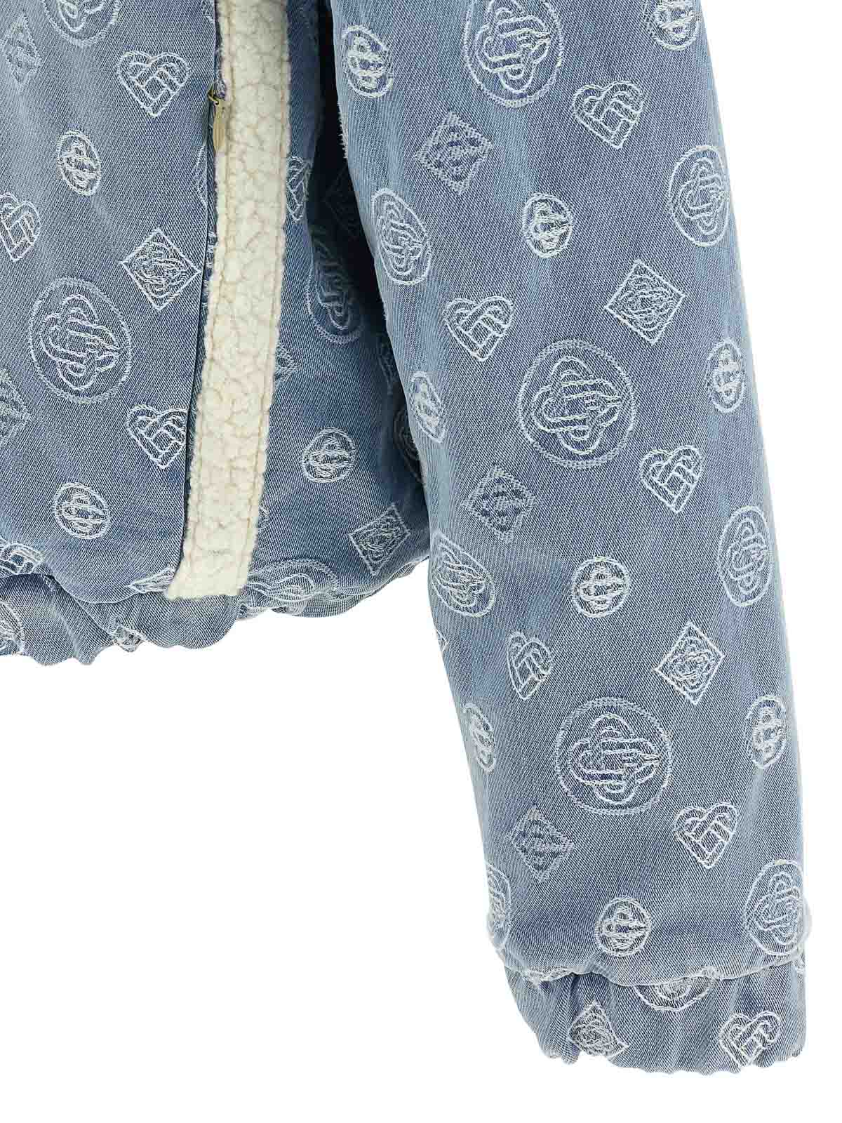 Reversible jacket in monogram cotton denim and teddy-effect fabric, hood, front zip closure, pockets, long sleeves with elastic cuffs, elastic hem.