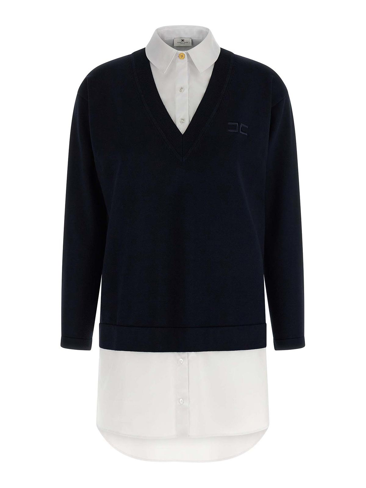 Mini dress knit and poplin with multi, layer effect consisting of v, neck knit shirt button long sleeves