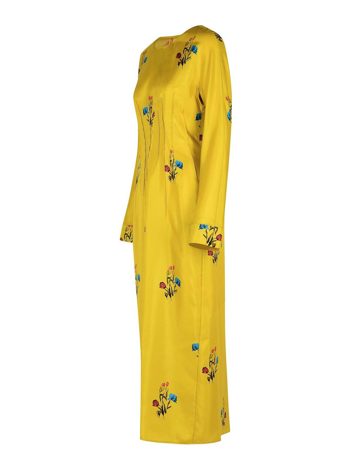 Round neckline floral print pattern structural stitching at the waist back invisible zip hook and button finished cuff back slit hem