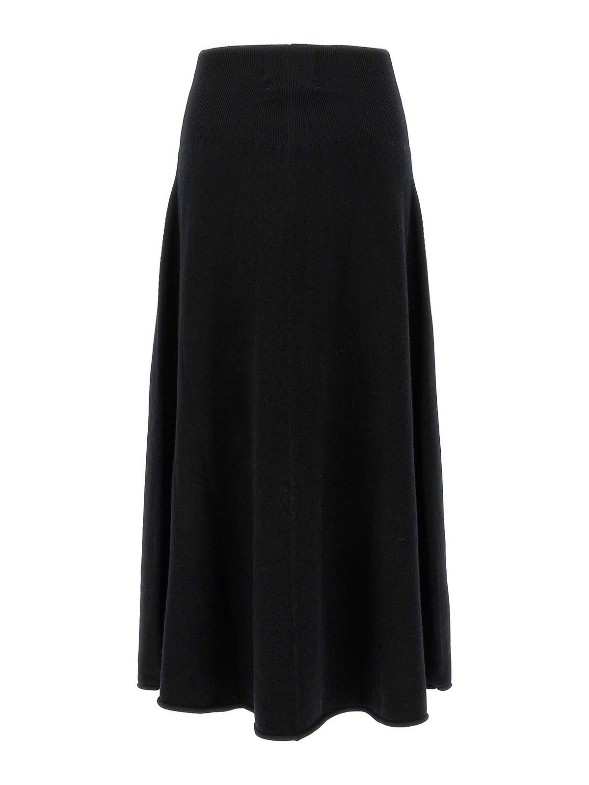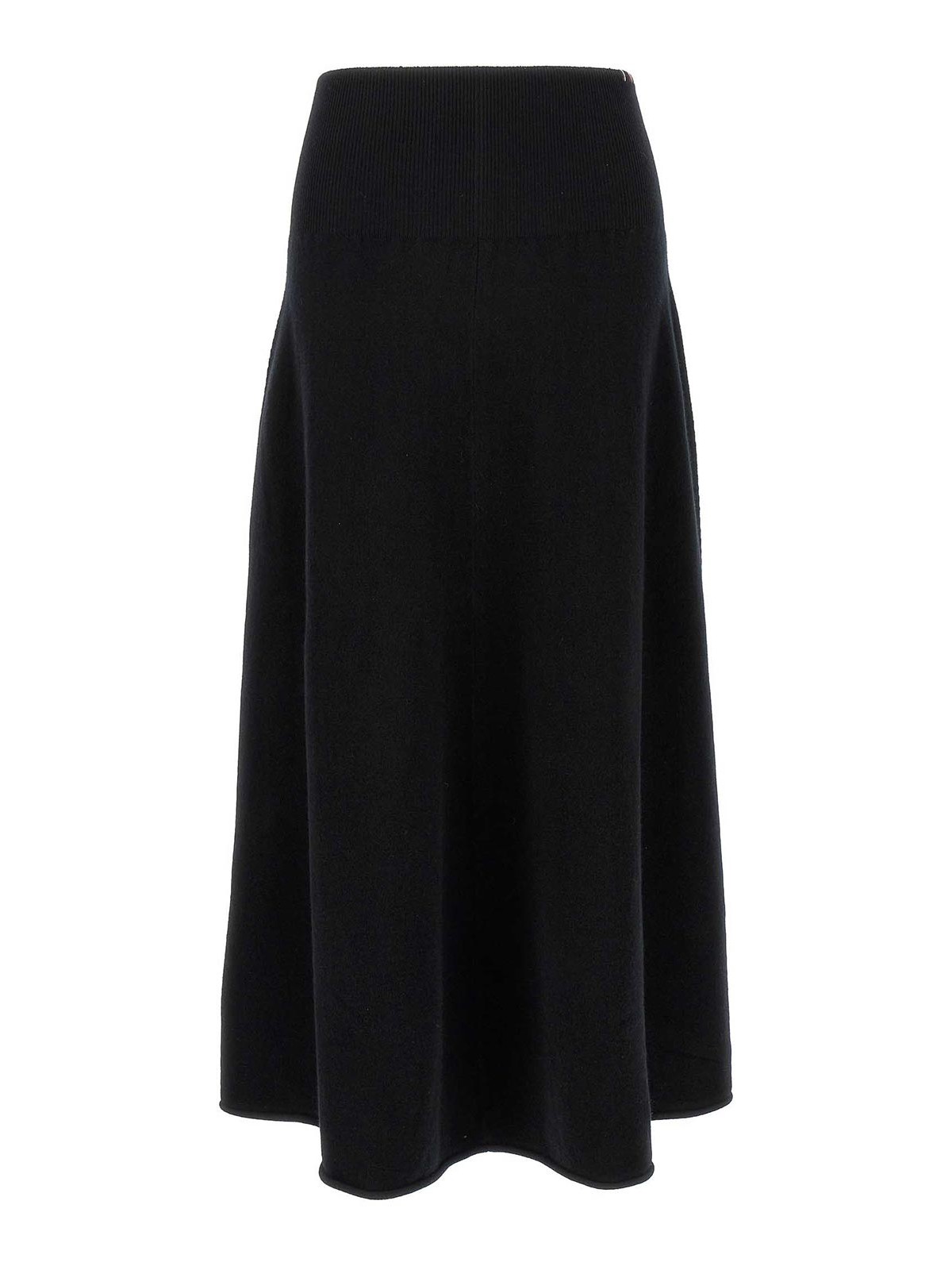 n388 ease' cashmere midi skirt, flared silhouette, elastic waistband, and raw cut hem.