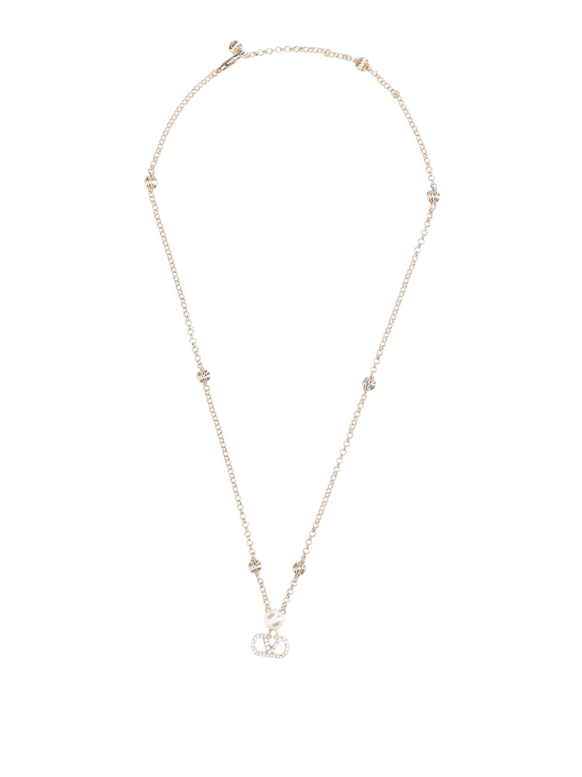 Valentino Garavani vlogo signature necklace, in golden brass, vlogo signature pendant charm, set crystals, pearl, all-over golden metal charms, lobster clasp closure on the back.