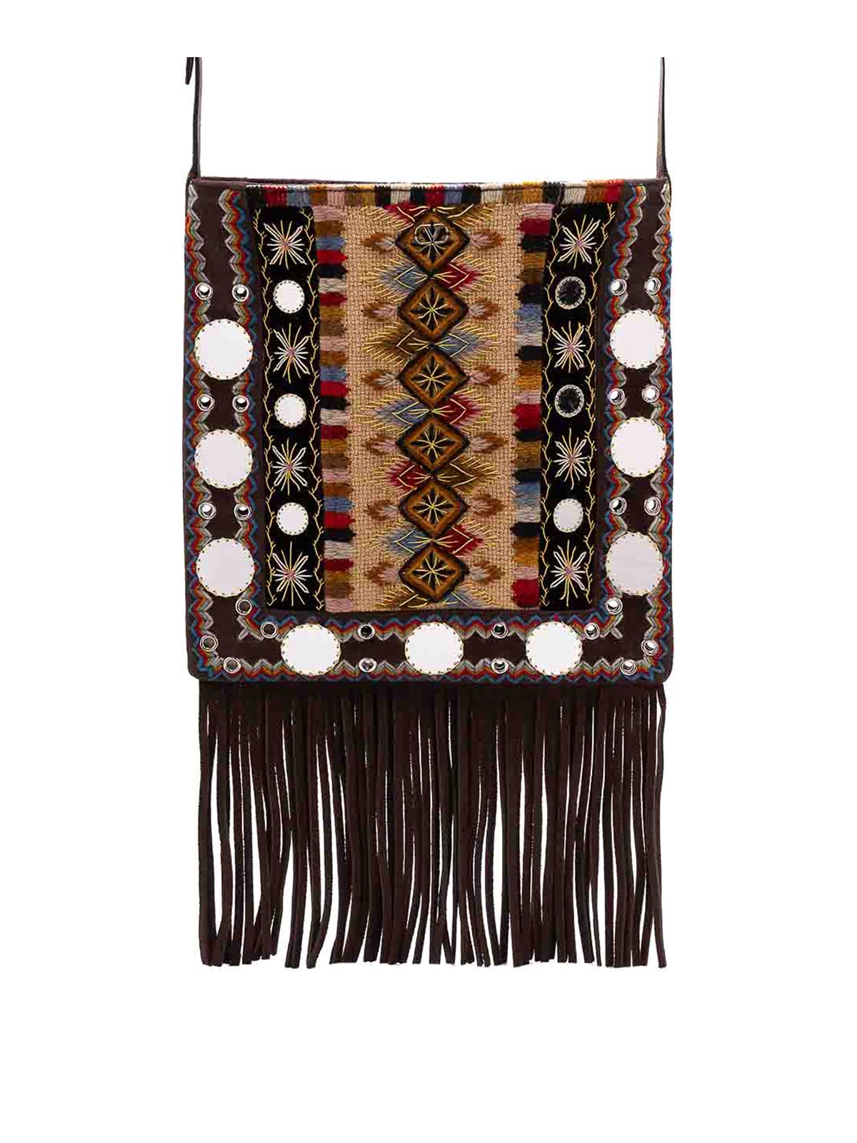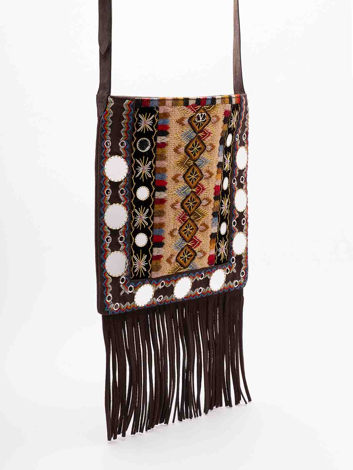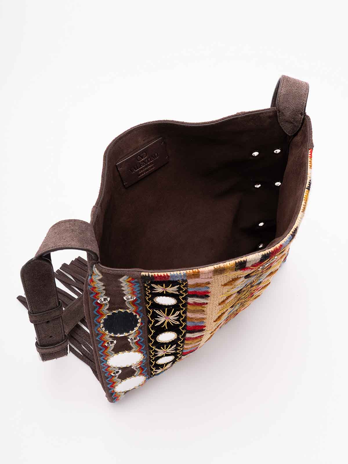 Valentino garavani nellcte embroidered shoulder bag with geometric pattern and fringes trim decorated with mirrors and rivets the bag can be comfortably worn on the shoulder / crossbody thanks to the adjustable shoulder strap palladium, finis