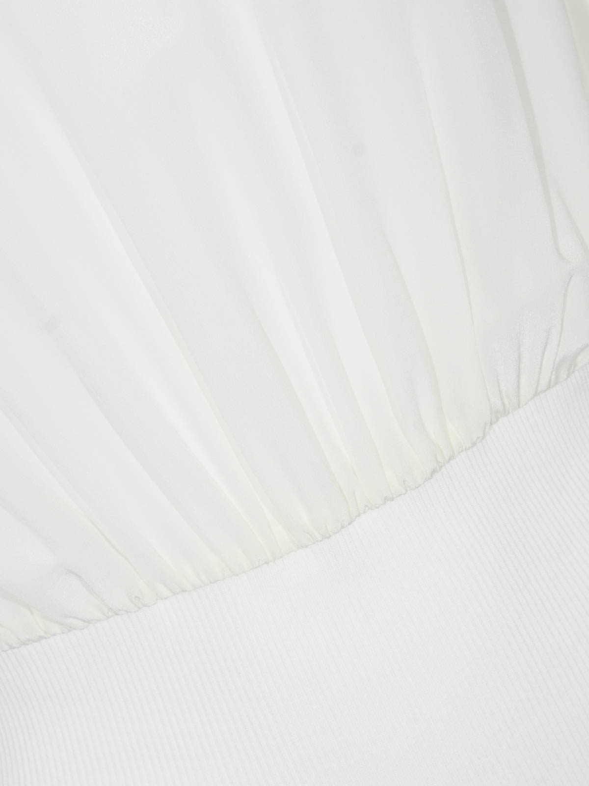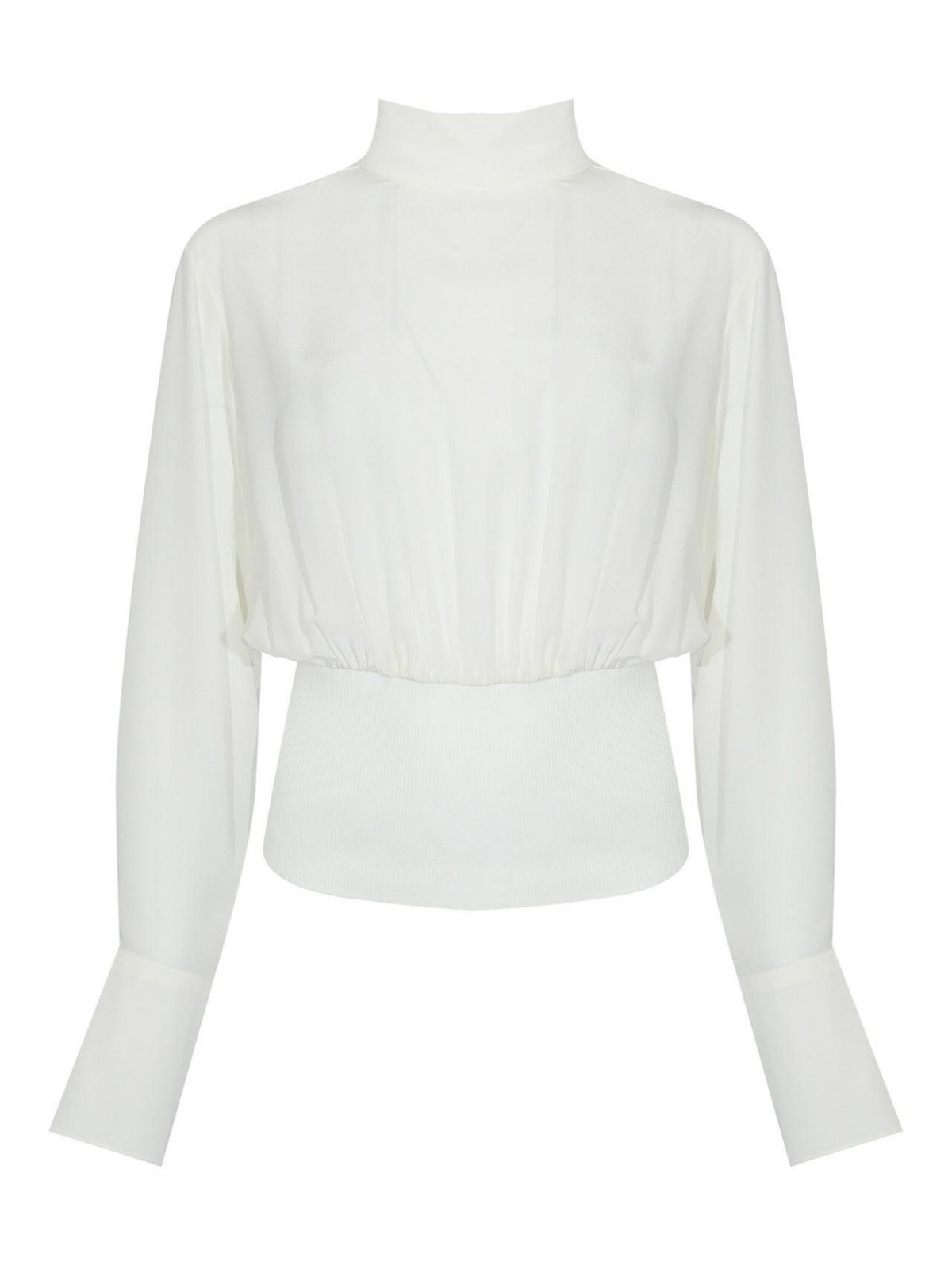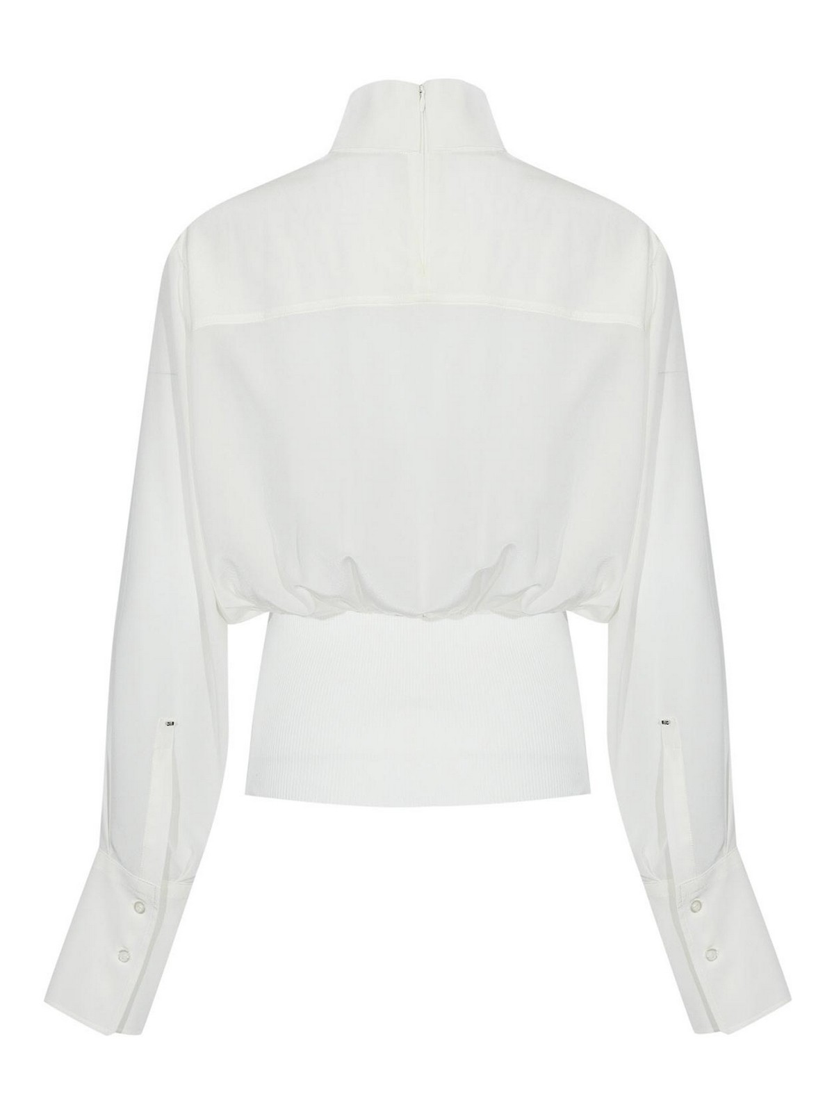 Silk shirt sleeves long with wide cuffs and buttons neck high hidden back zip elastic waistband with ribbed band that creates a bloused effect and enhances the garment's shape fit regular loose at the top and tighter at the waist