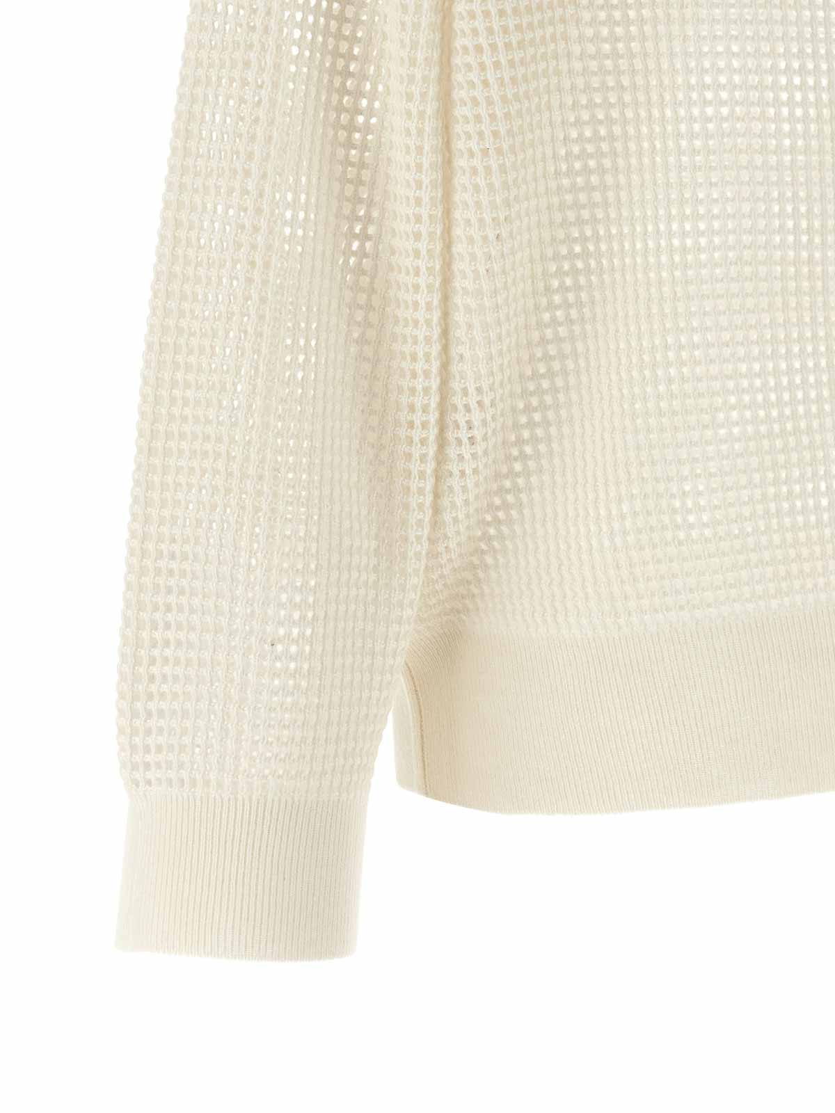 Mesh cashmere sweater, relaxed silhouette, v-neck, long sleeves with cuffs and dropped shoulders, band on the hem.