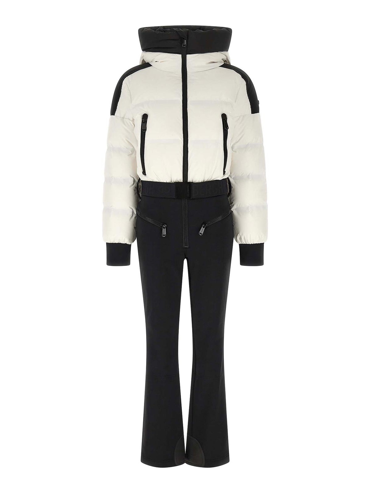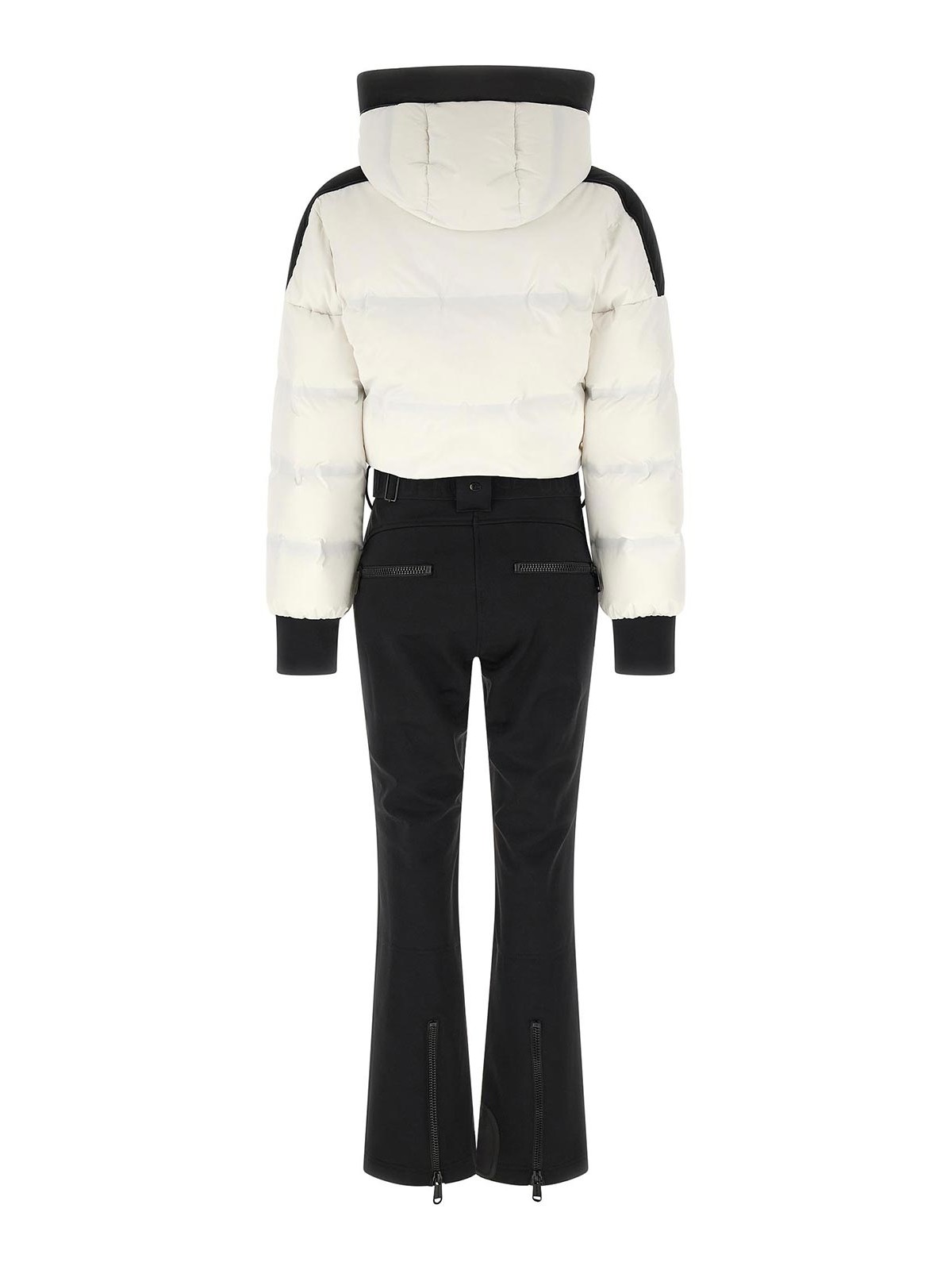 nve' ski suit in water-repellent and breathable technical fabric with goose feather padding at the top, stretch lining with anti-odor finish, adjustable hood, high neck, front zip closure, pockets, long sleeves with cuffs and windproof gaiter, zipped leg bottom, silicone reinforcement with embossed logo and inner gaiter, removable belt.