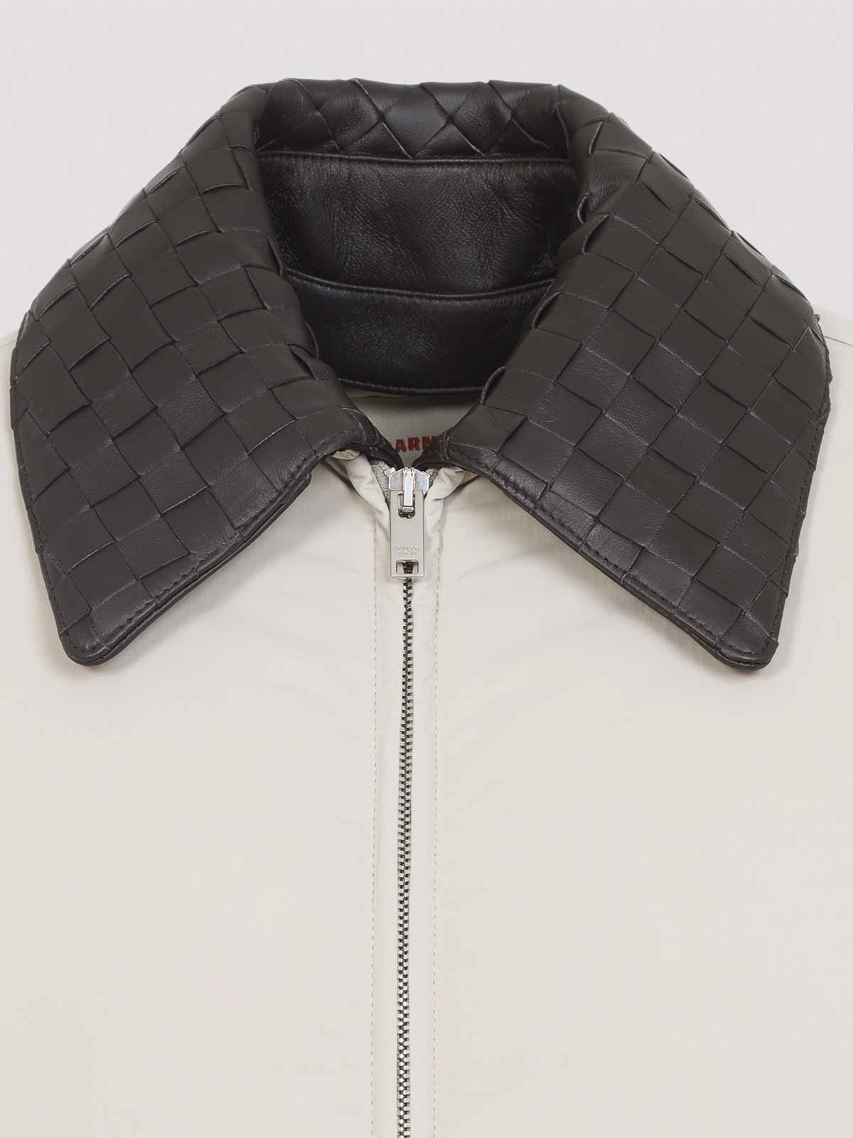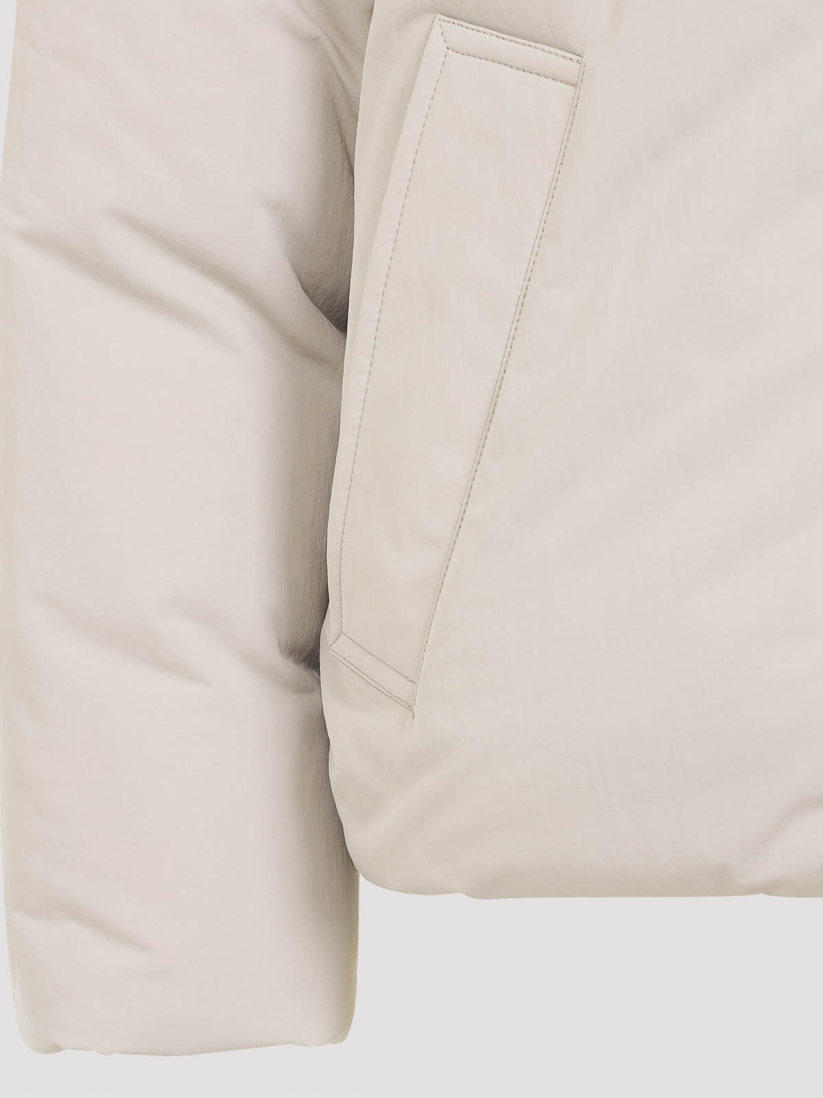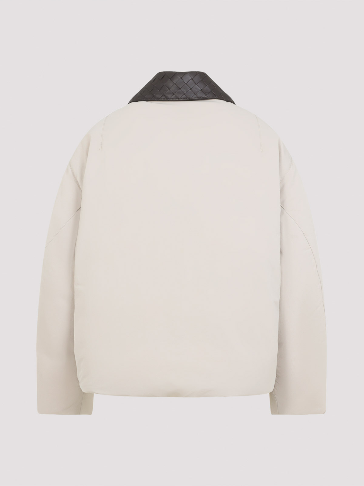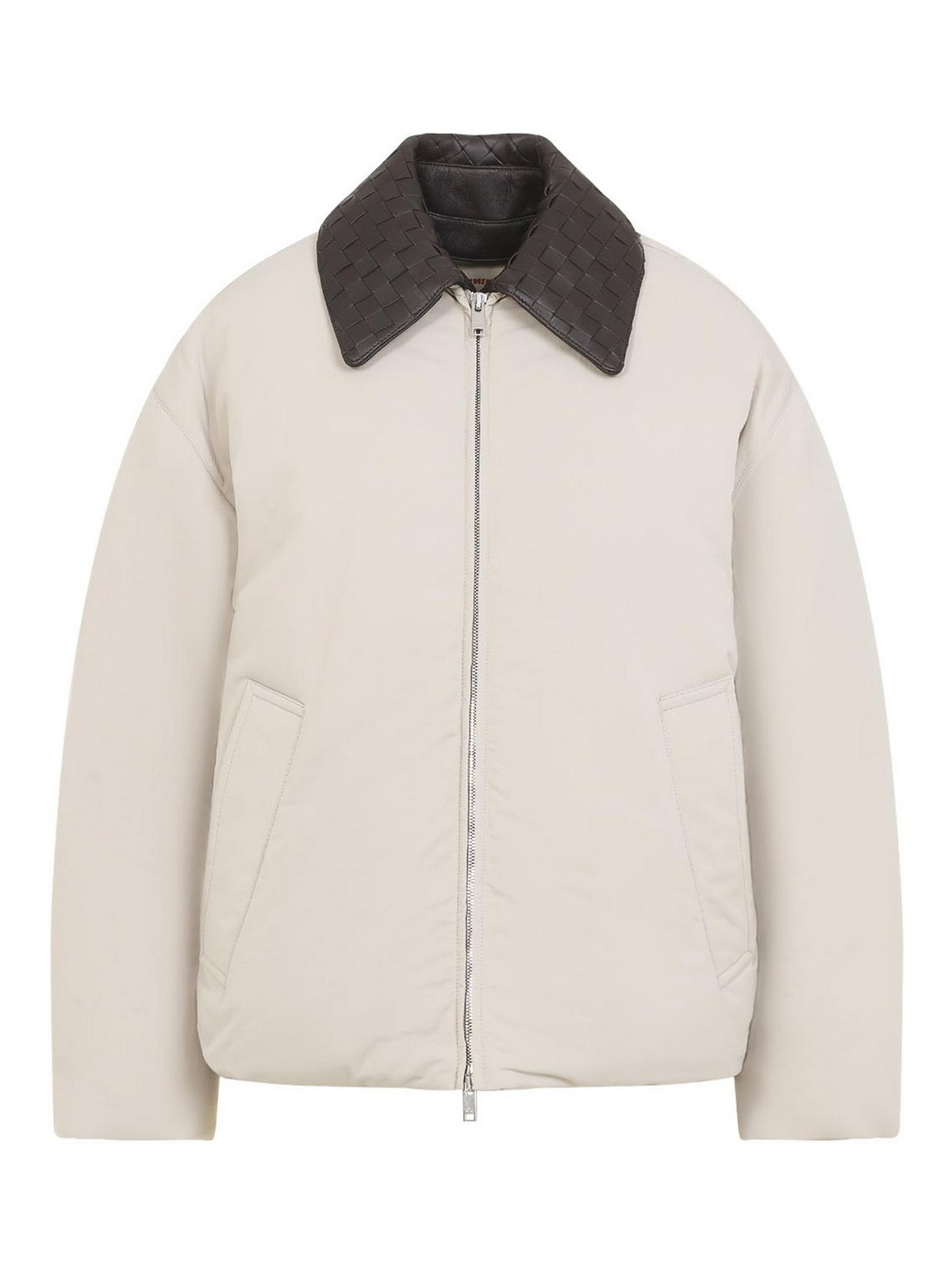 Bottega veneta grey putty puffer jacket pure grey putty jacket pointed contrasting brown intreccio neck zipped side pockets dropped shoulders long sleeves straight hem padded design