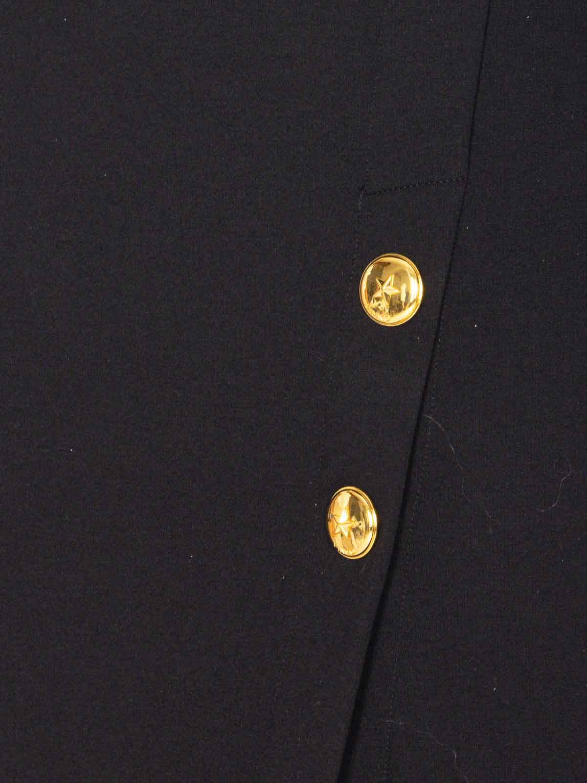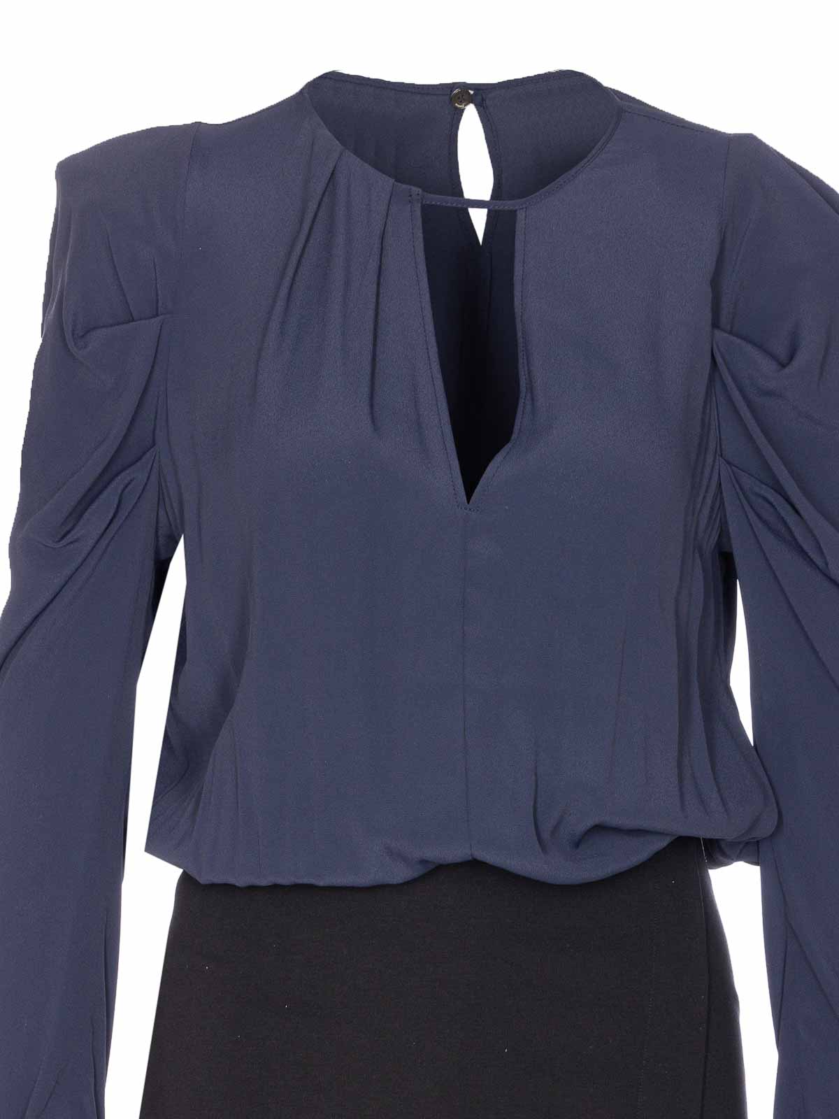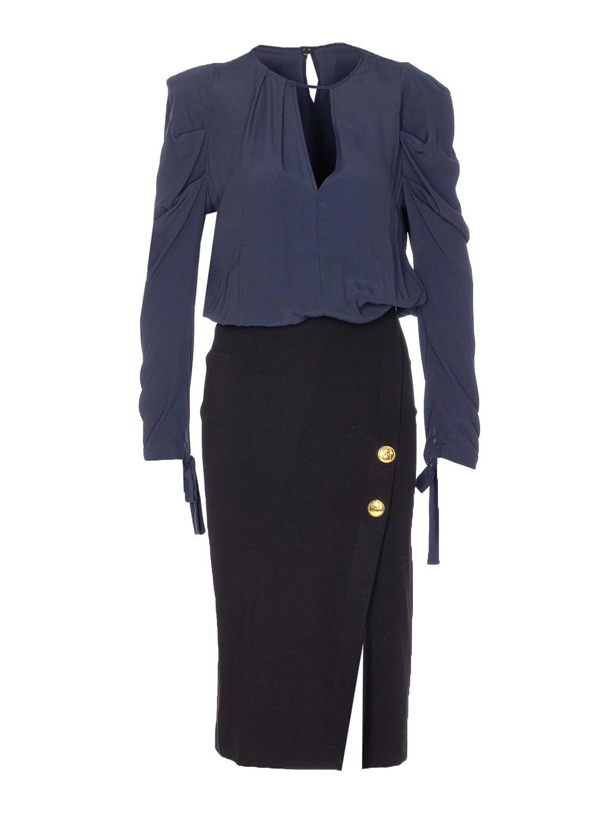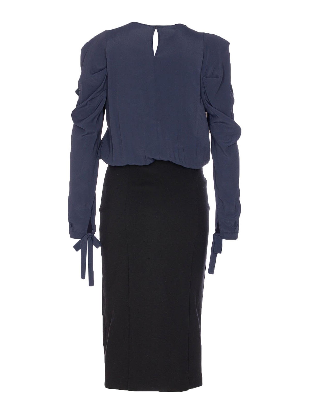 Pinko blue and black omelette dress, button closure on the back, v-neck, long sleeves, bow on cuffs, logo button details, midi model