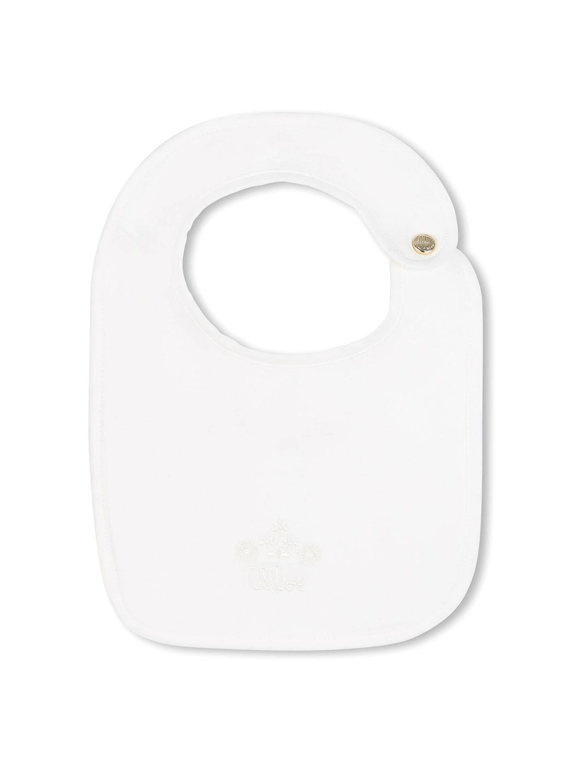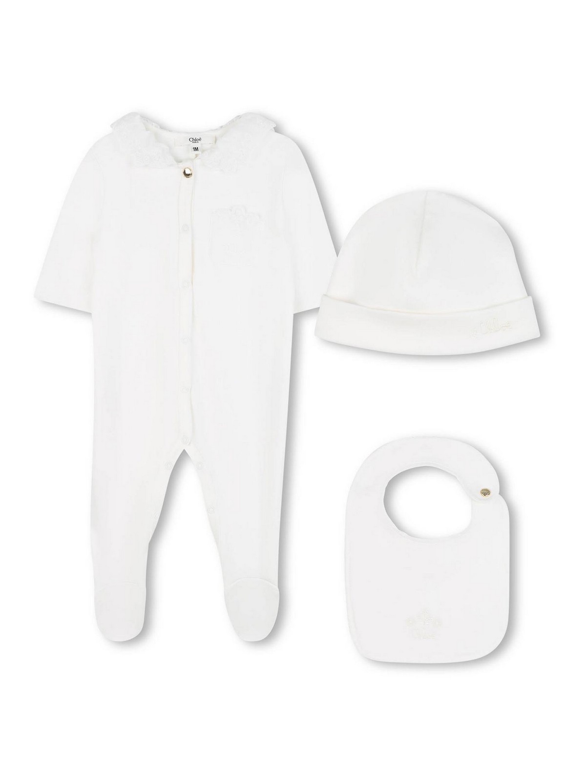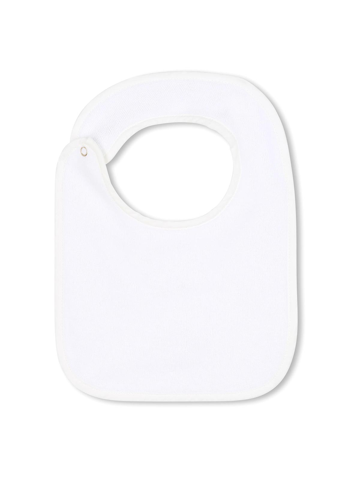 White front with snap buttoning, short sleeves, hat, coordinated bib, tone-on-tone stitching, pure organic