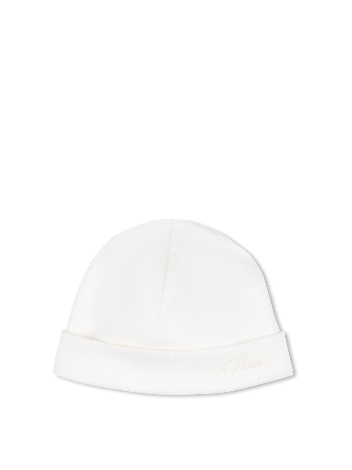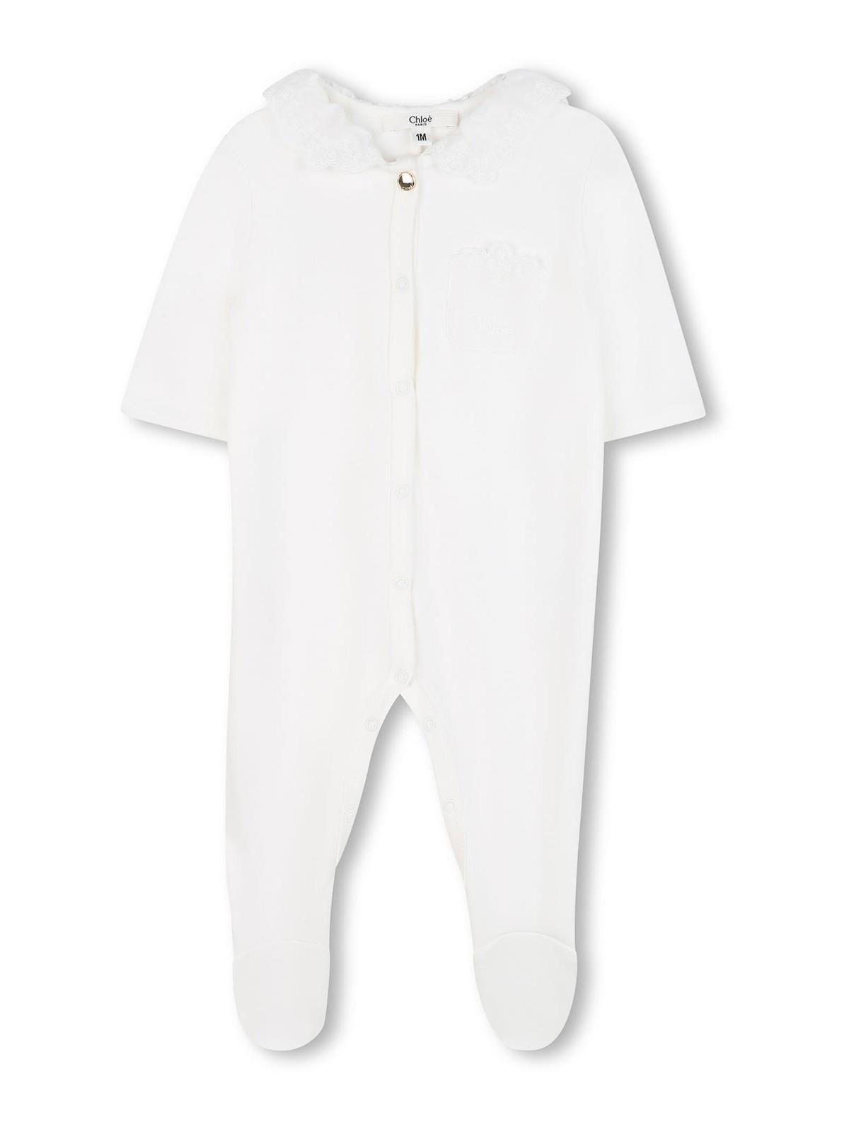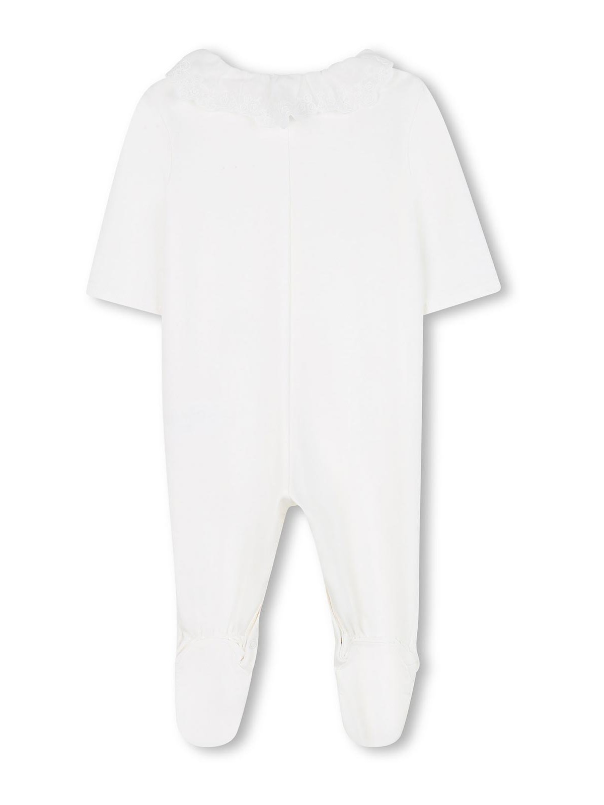 White front with snap buttoning, short sleeves, hat, coordinated bib, tone-on-tone stitching, pure organic