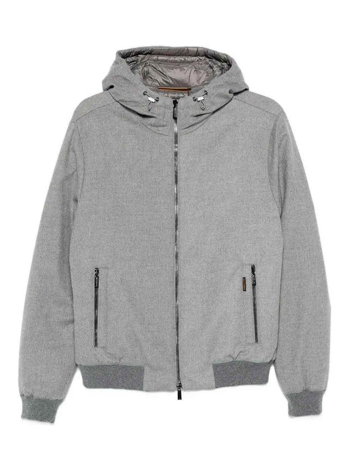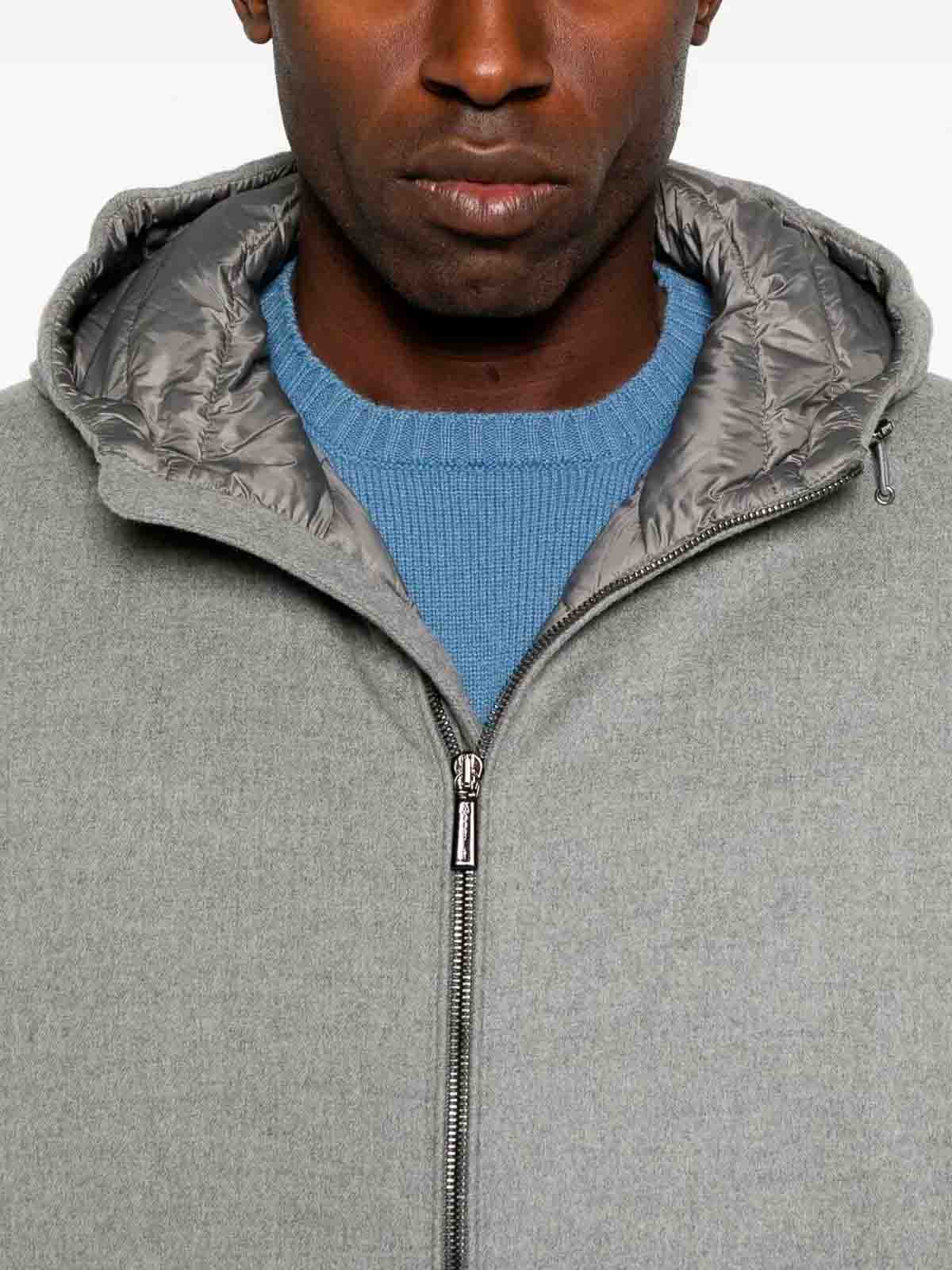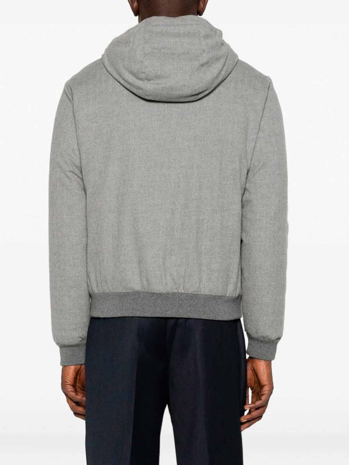 Light grey, wool, zip closure, hooded neckline, ribbed hem, zip pockets