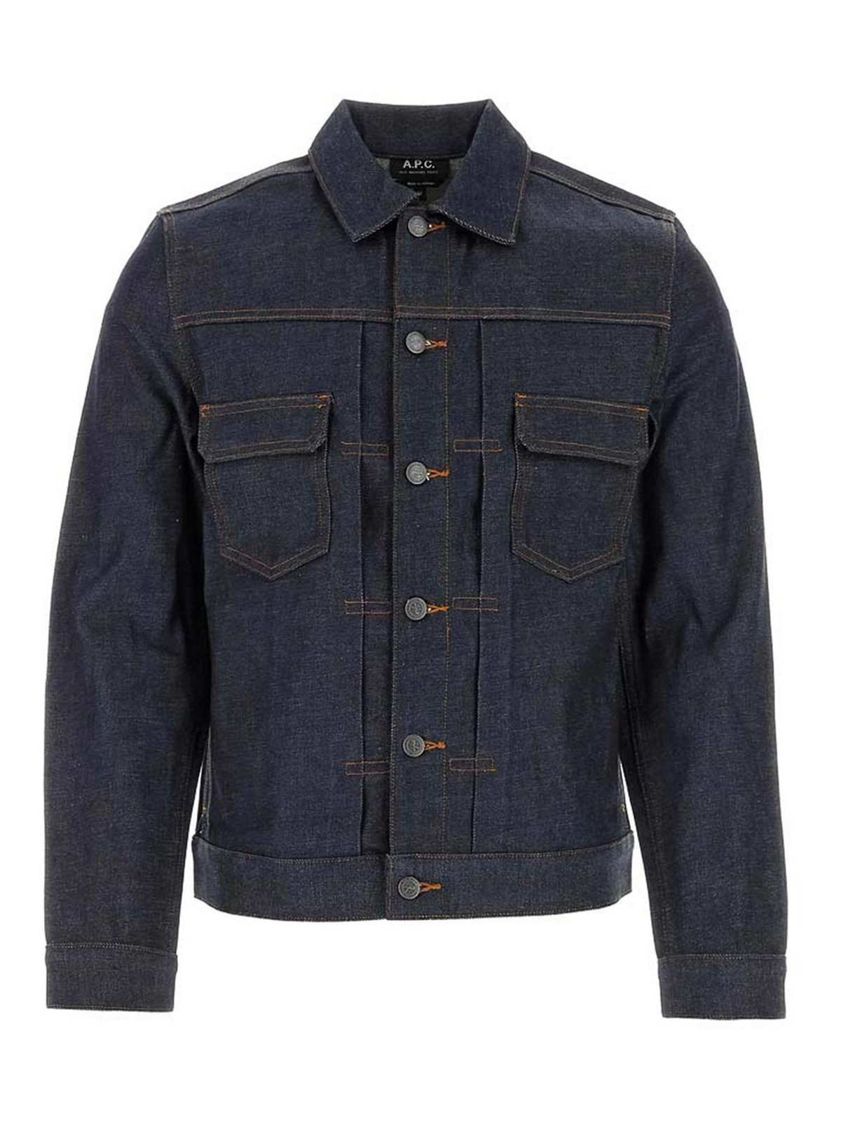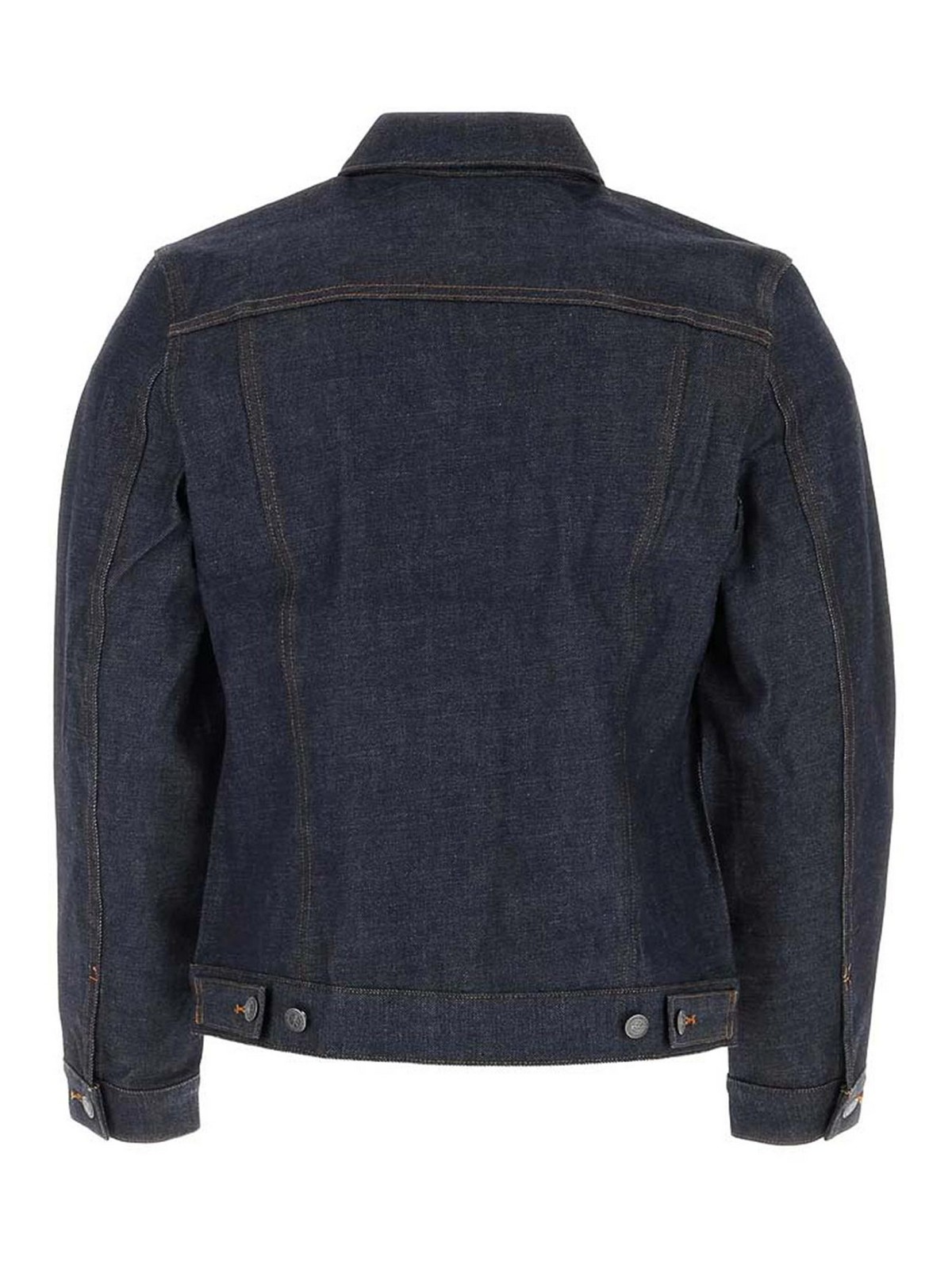 Indigo blue denim stitching embossed, tone buttons spread collar button long sleeves buttoned cuffs two chest flap pockets two side welt pockets waist tabs straight hem