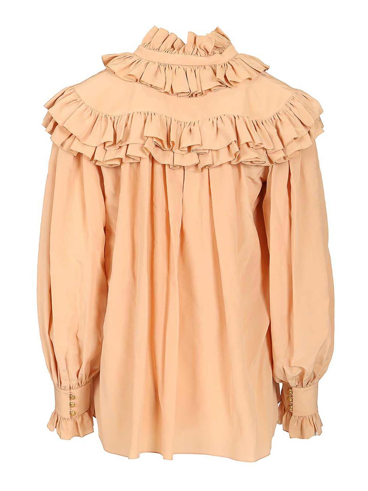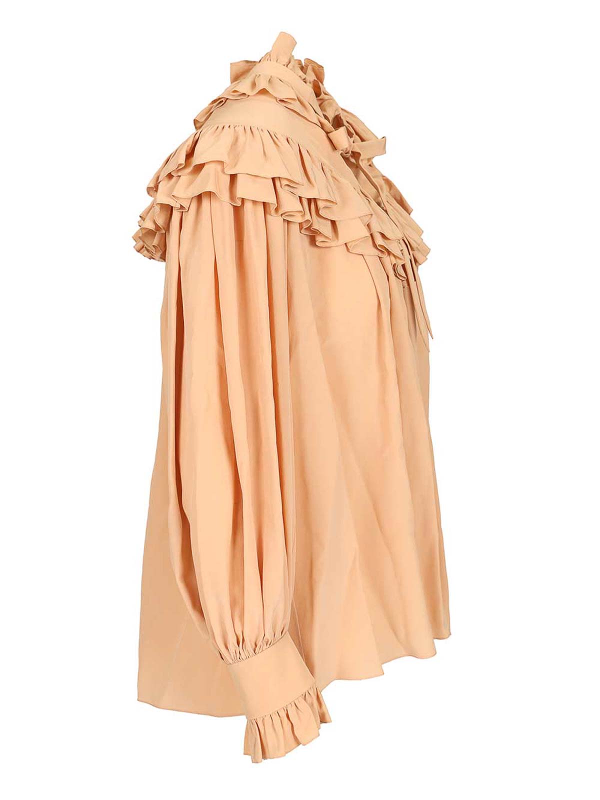 Oversized ruffle top in lightweight crepe de chine by chlo with a ribbon at the neck and buttons at the cuffs