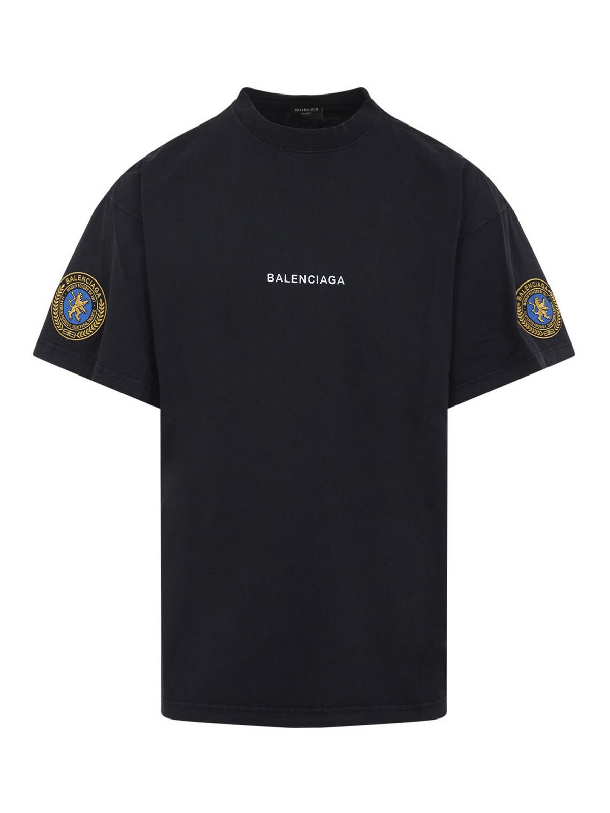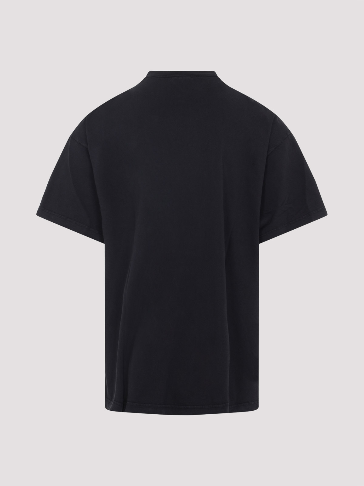 Balenciaga oversized black cotton t-shirt. faded black cotton, light used effect, round ribbed neckline, front signature, dropped shoulders, short sleeves with logo patch detail, straight hem.