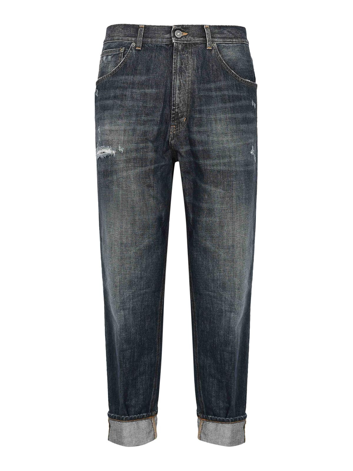 recycled cotton denim jeans dondup, paco model fabric: recycled cotton denim pattern: medium blue wash with distressed effect and light abrasions rise: mid-rise with belt loops closure: front button and zip pockets: classic five-pocket length: long with rolled hems details: metallic dondup logo on the back pocket, contrasting stitching, distressed effect, and reinforced stitching lined: no fit: loose