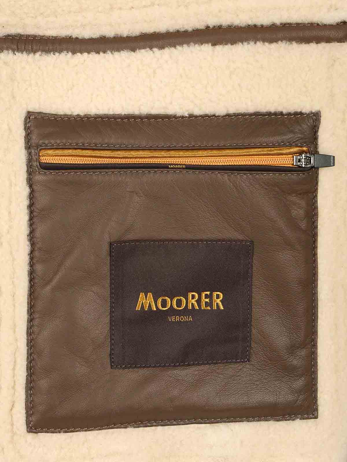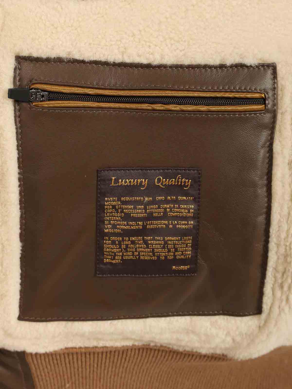 Moorer fiano padded goose down bomber jacket with boudin quilted interior, made of stretched suede sheepskin, detachable merino sheepskin fur collar with strap, front fastening with brushed metal double slider zip, large side pockets with flap closure and horn buttons, bottom and cuffs made of soft knit, convenient internal pockets for valuables