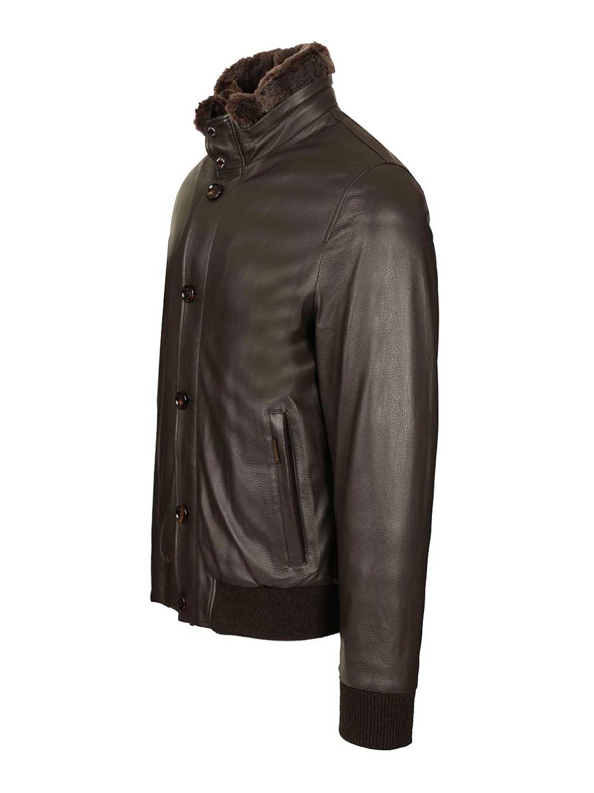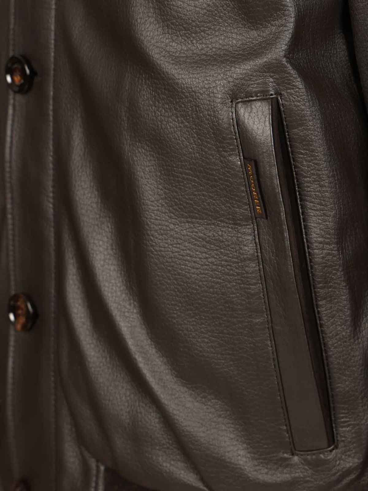 Padded bomber jacket cleros-p1 in goose down and made of deerskin by moorer, with detachable collar in frosted sheepskin, double front closure with zip and horn buttons, details and plackets in nappa, side welt pockets with leather profile and zip closure, knitted cuffs and bottom, internal quilting in boudin, internal finishing with logoed tapes, comfortable internal pockets for valuables