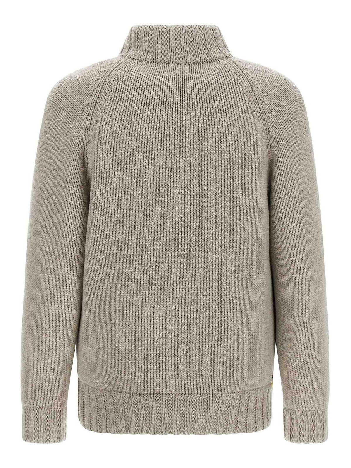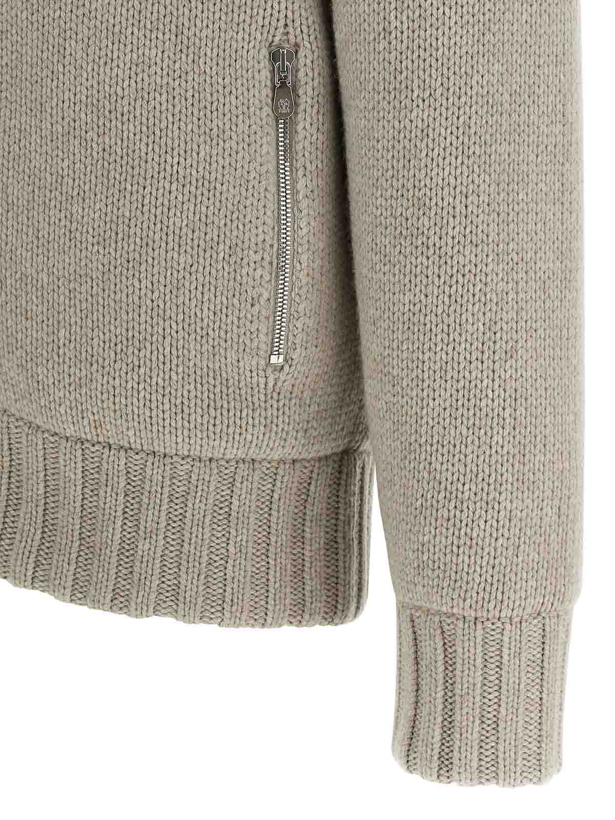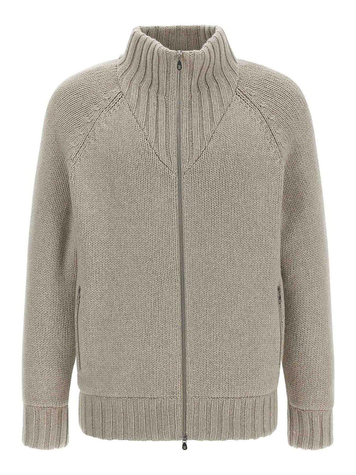 Cashmere knit cardigan, high neck, zip closure, nylon and goose down padding, long cuffed sleeves.