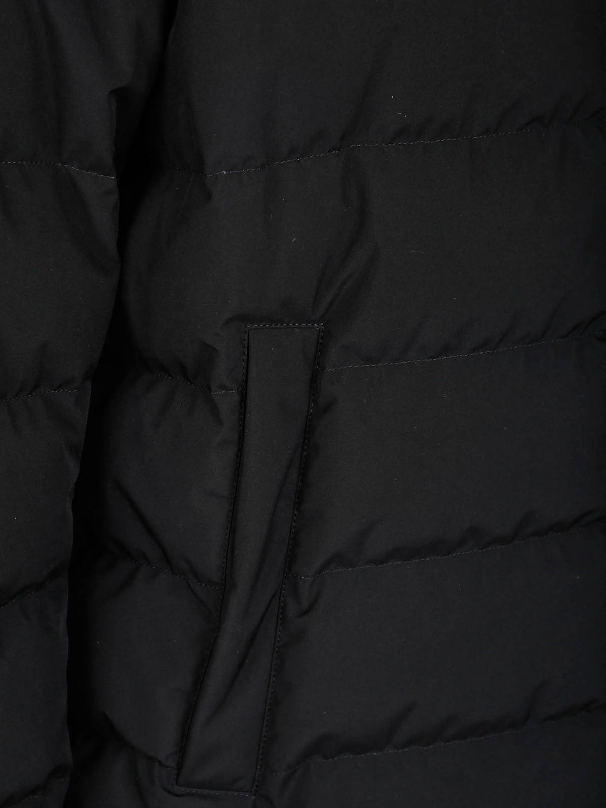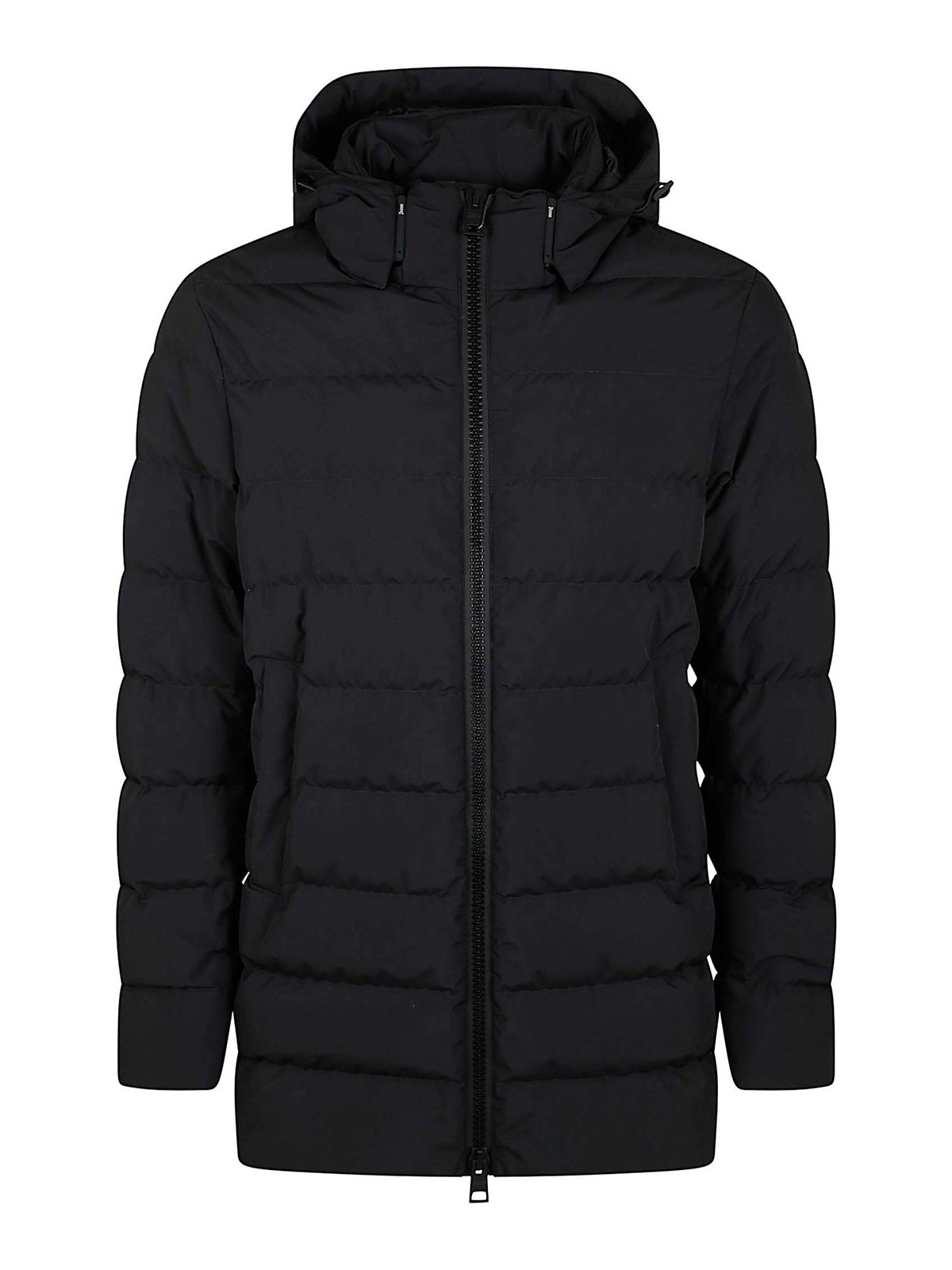 Herno down-filled polyester microfiber jacket, removable hood, two-way zip closure, side pockets, long design, and striped quilting, featuring a Herno logo on the back.