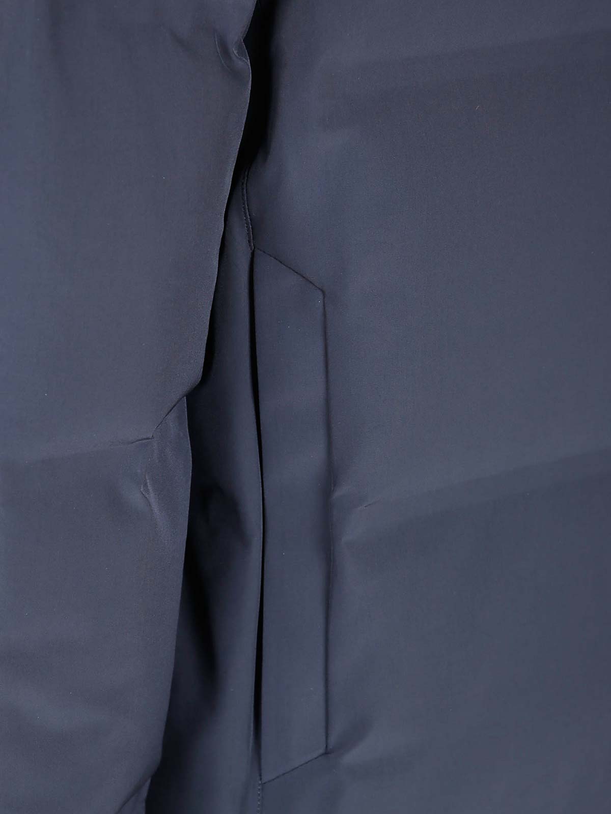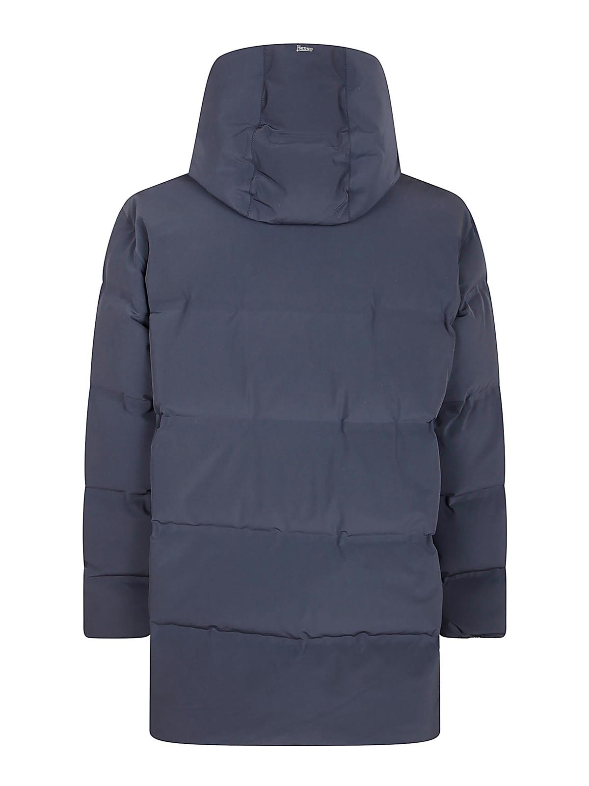 Herno striped-quilted down-filled jacket in matte 4-way stretch fabric, high collar with hood, two-way zip closure, side pockets, water-repellent, windproof, and breathable treatment, regular fit, featuring a Herno logo on the back.