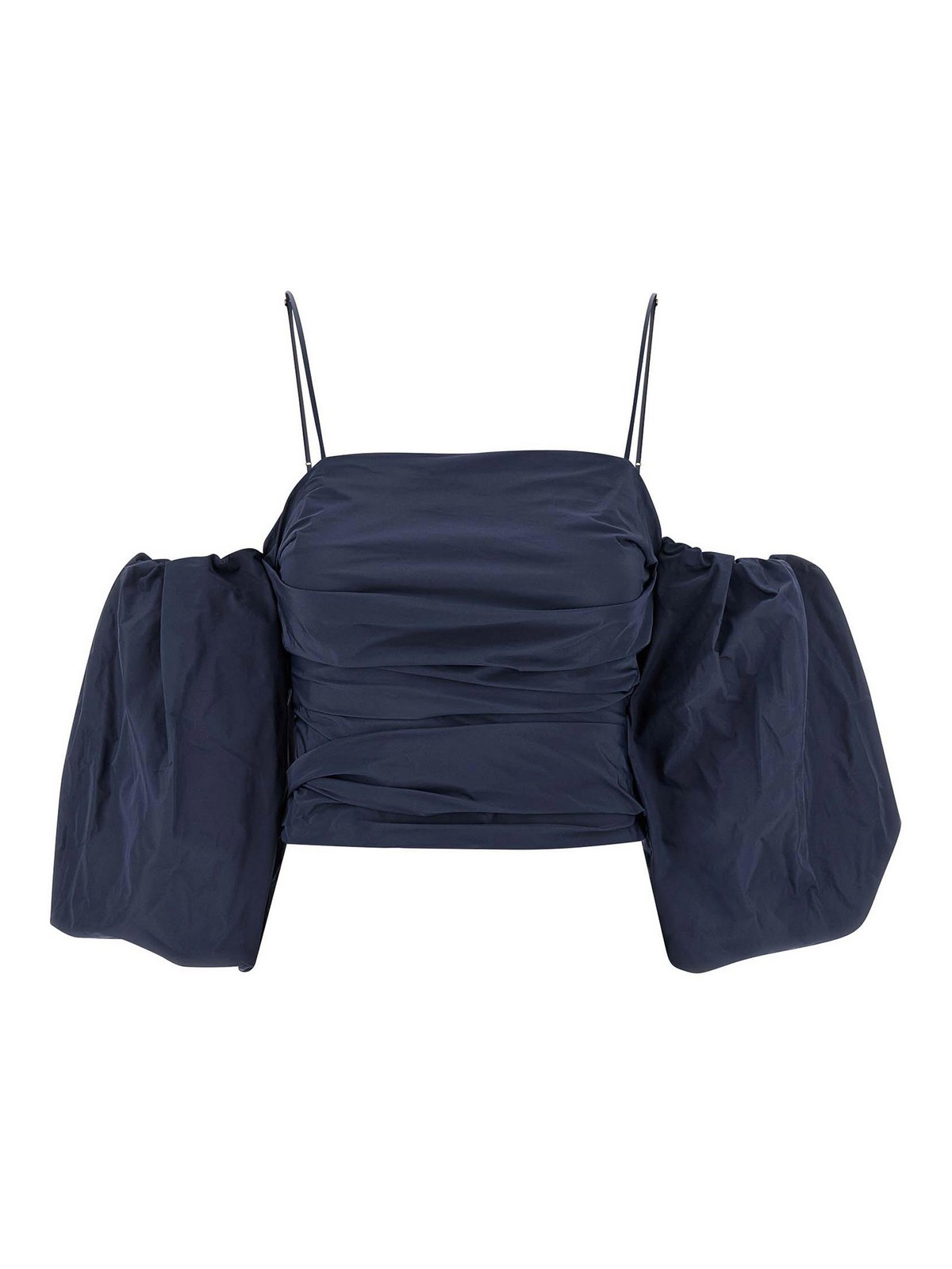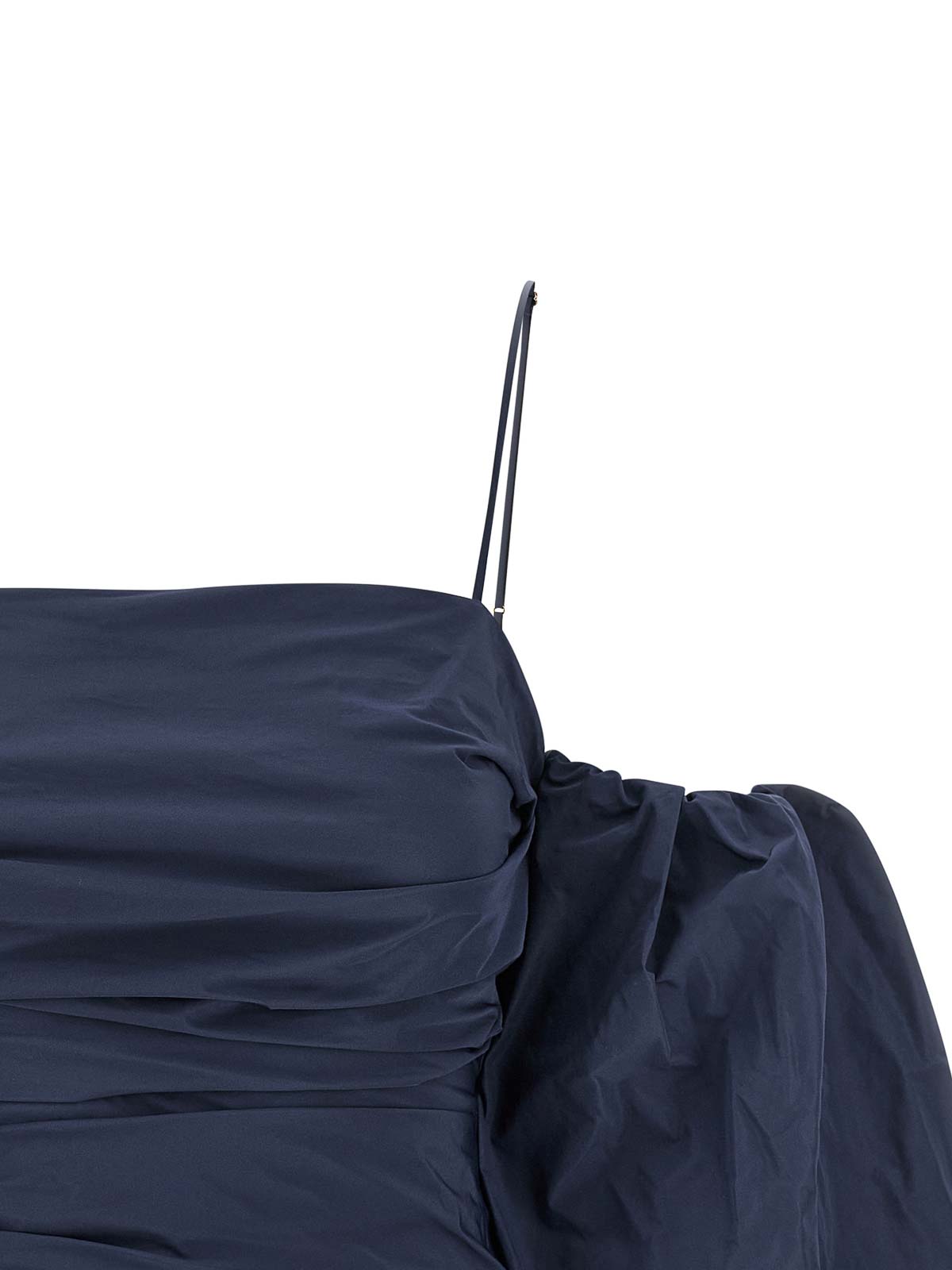 pallottoliere' bustier top in slightly ruffled taffeta with back hook closure and front and back pleats, thin adjustable straps, removable balloon sleeves with elastic cuffs.