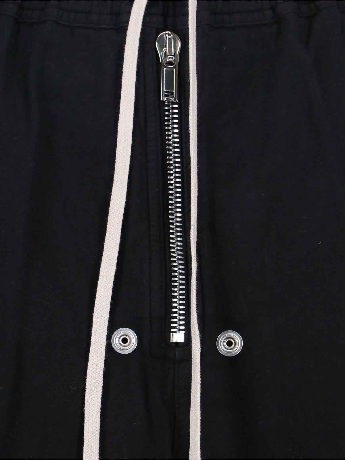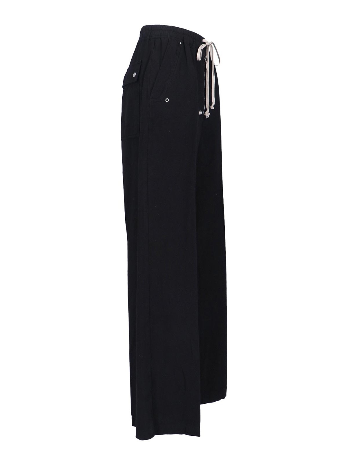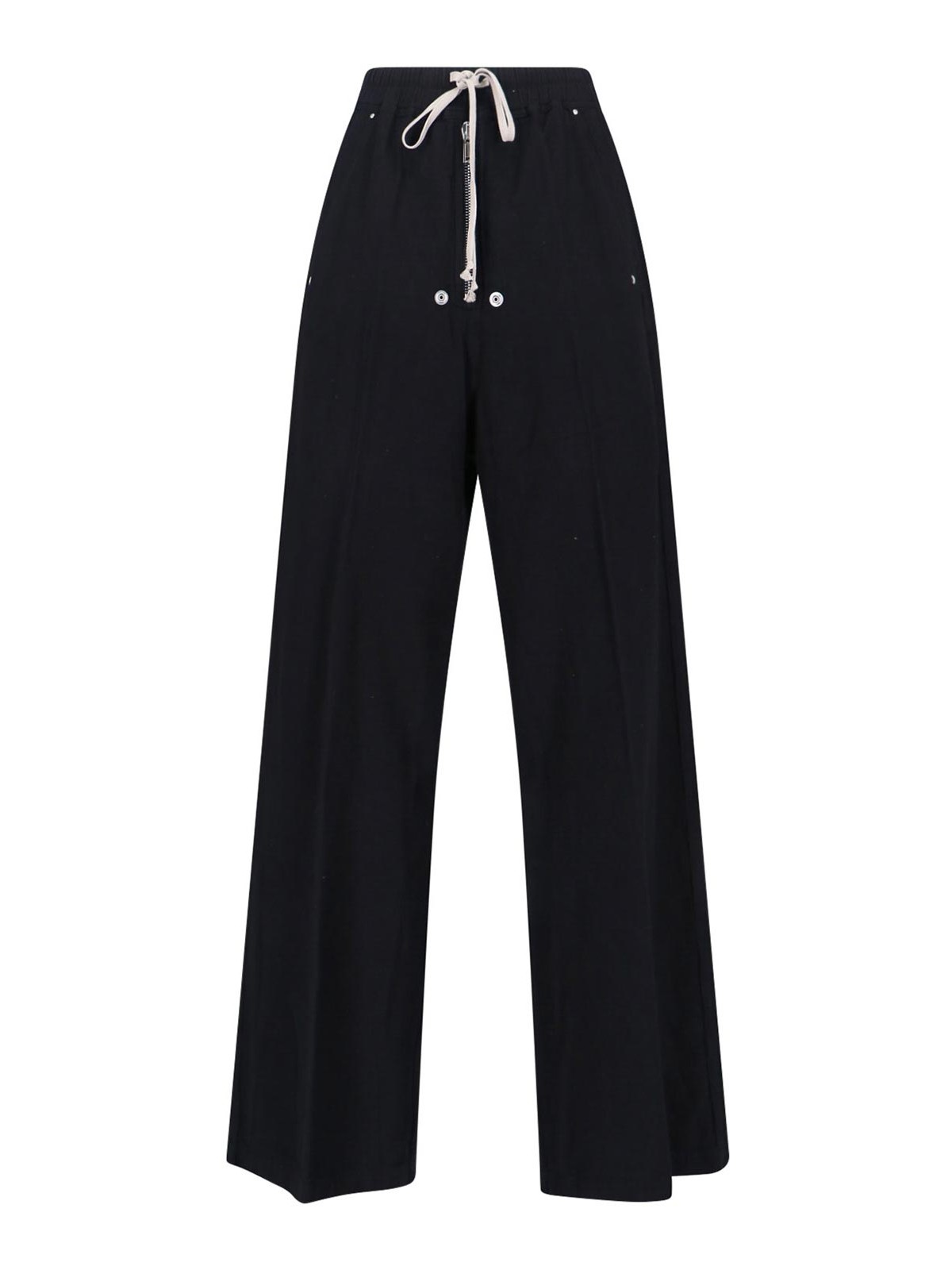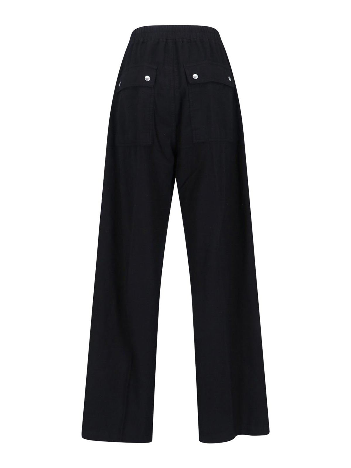 Geth belas rick owens drkshdw trousers, in black cotton, elasticated mid-waist with drawstring detail, front zip, two front pockets, two back button pockets, wide leg.