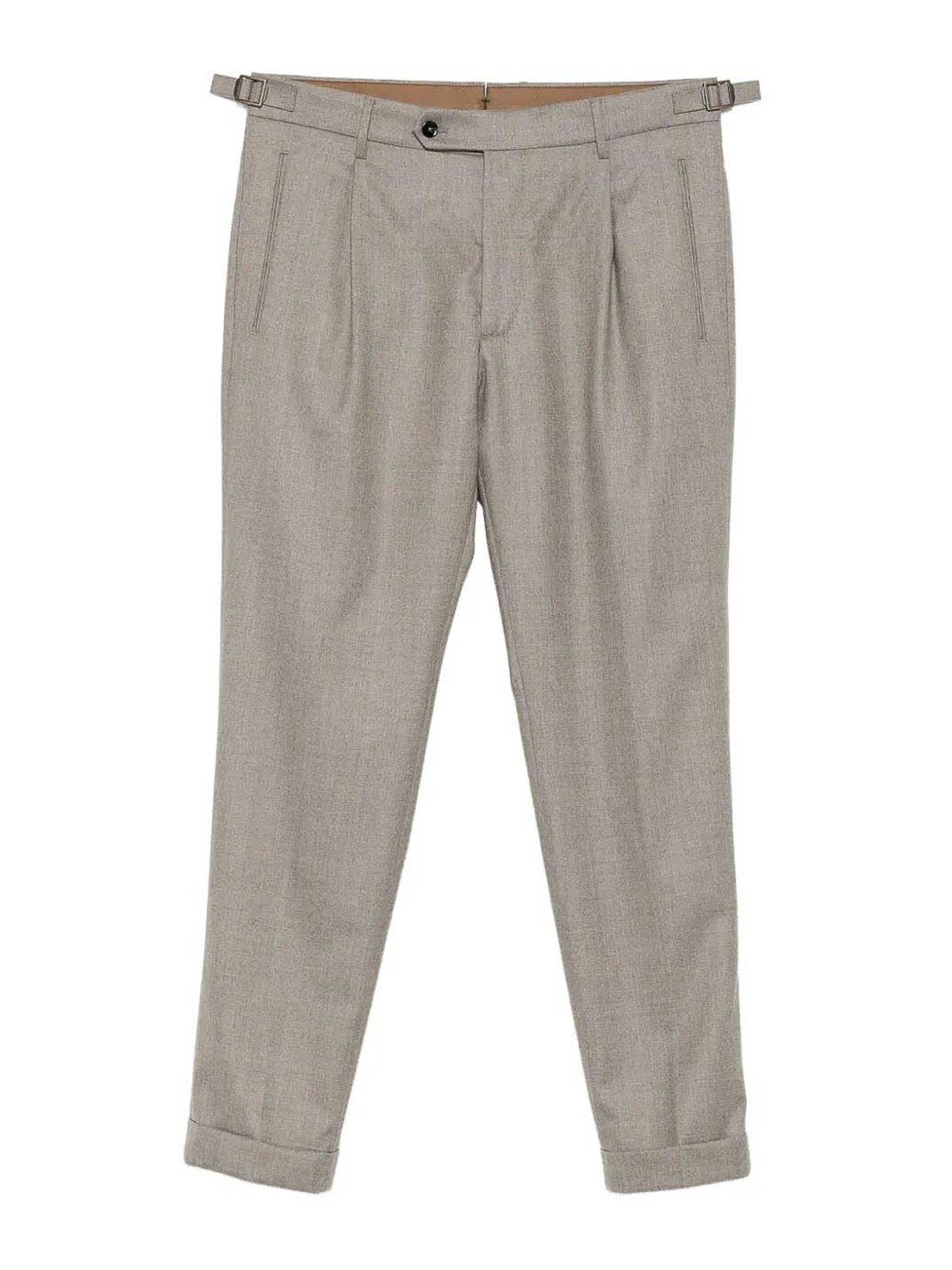 pleated front, side adjusters, cuffed hems, straight leg, wool