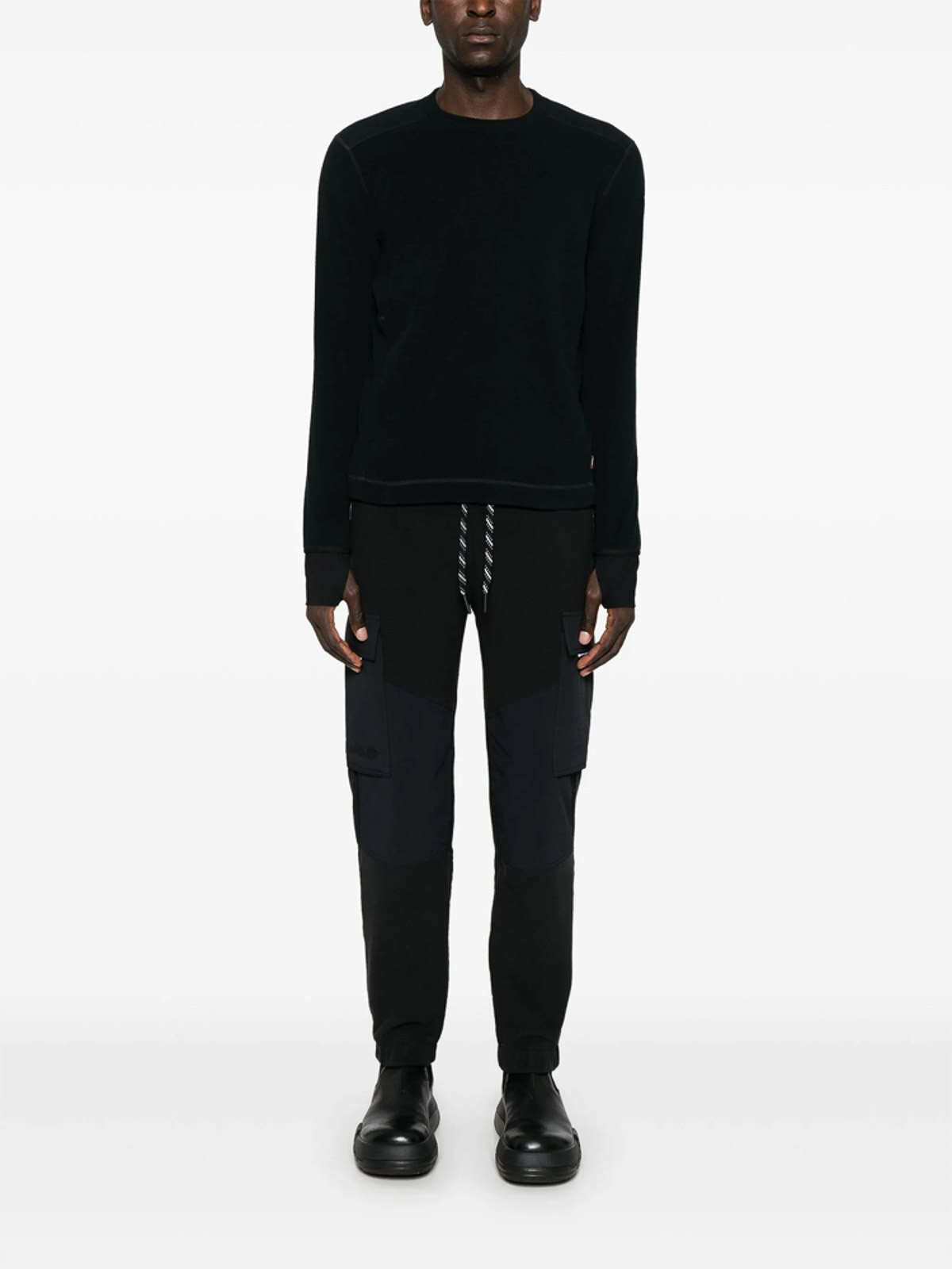 Black fleece texture drawstring elasticated waistband piped-trim ing two side zip- pockets appliqu logo two side flap pockets rubberised logo elasticated ankles tapered leg