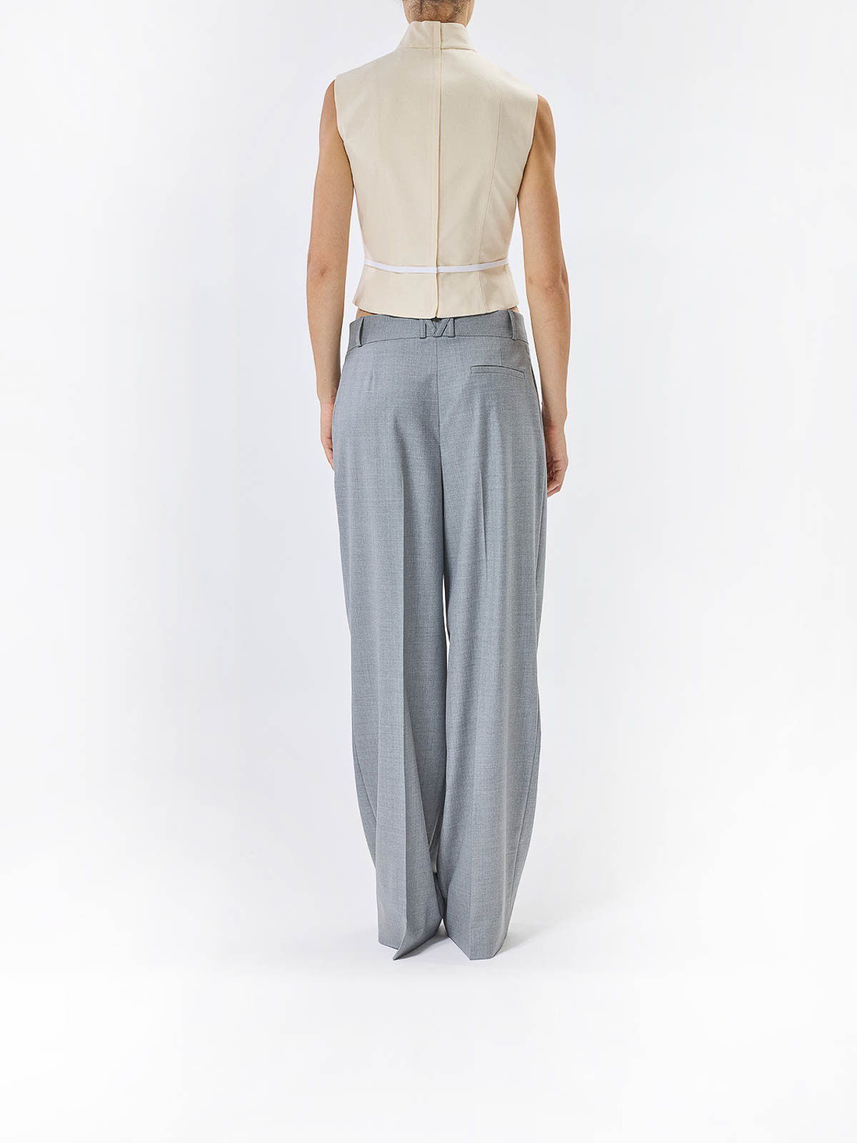 trousers in grey, moschino wool trousers, characterized by a tailored wide leg cut with pleats and hidden zip and hook closure tailored cut wide leg pleats zip and hidden hook closure 2 side pockets decorative pocket on the back m shaped loops on the back colour: gray 100% wool.